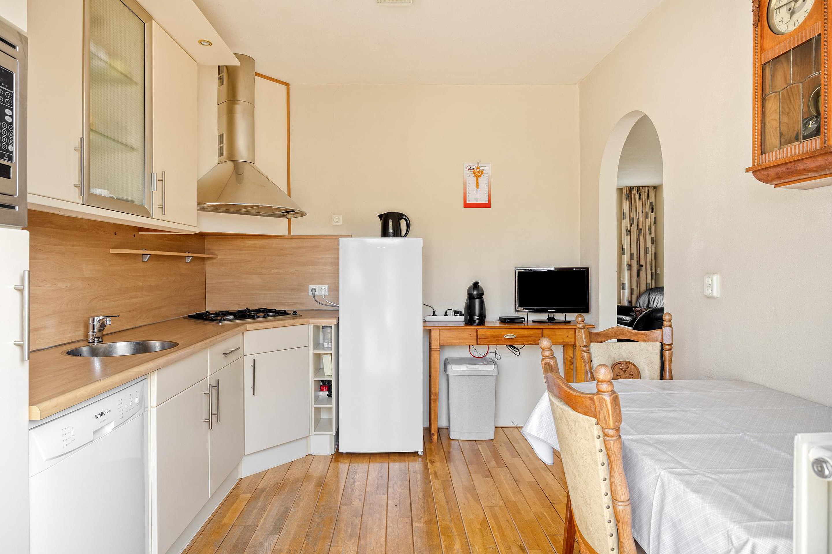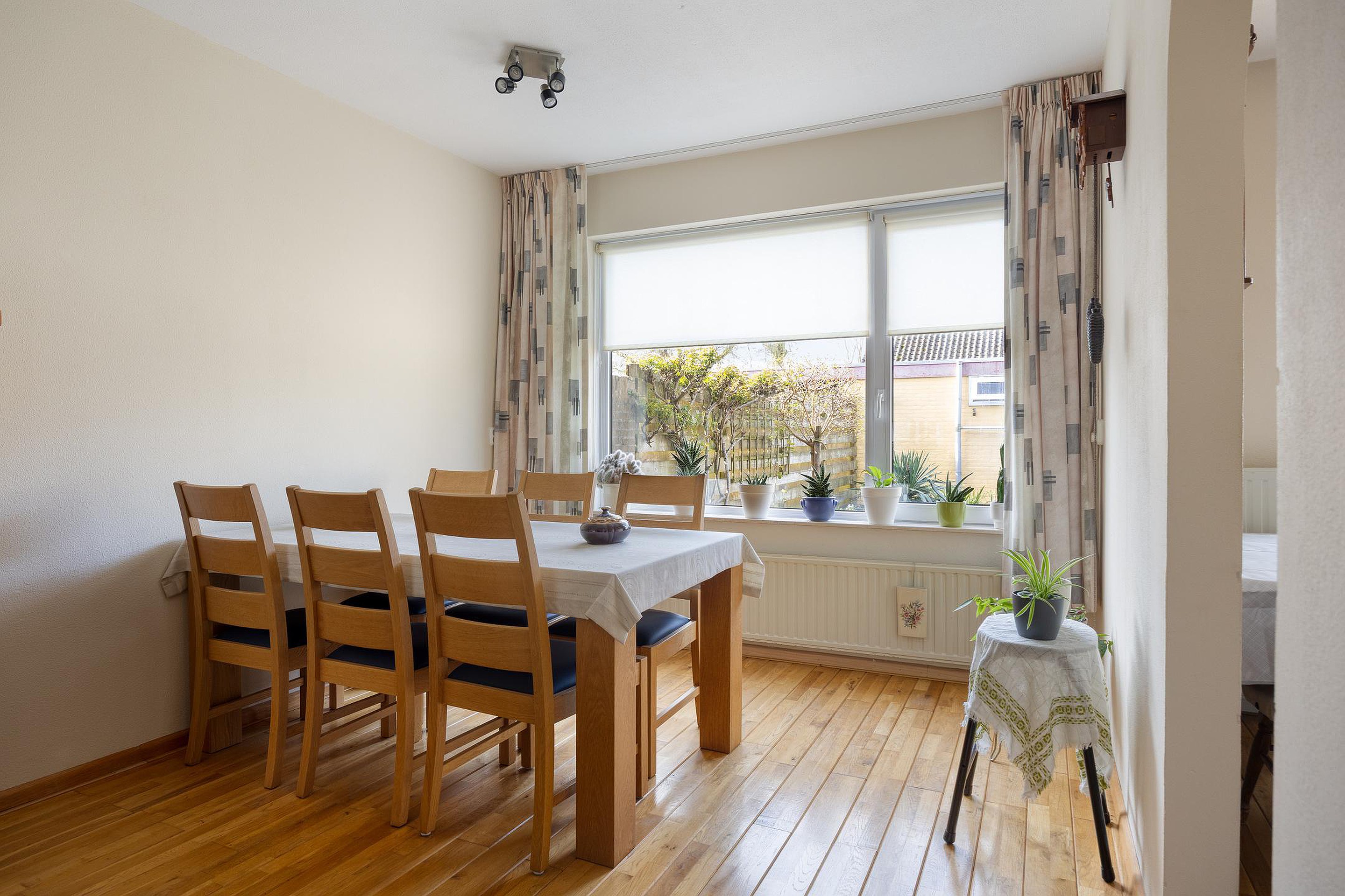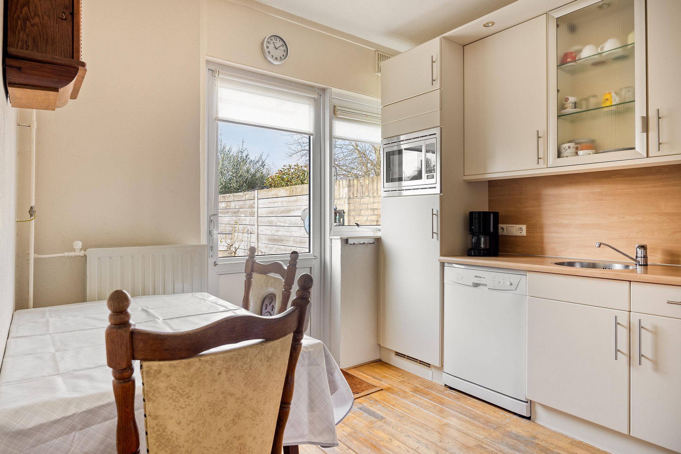 Achterin bevindt zich de halfopen keuken met voldoende werk- en opbergruimte en uitzicht op de achtertuin.