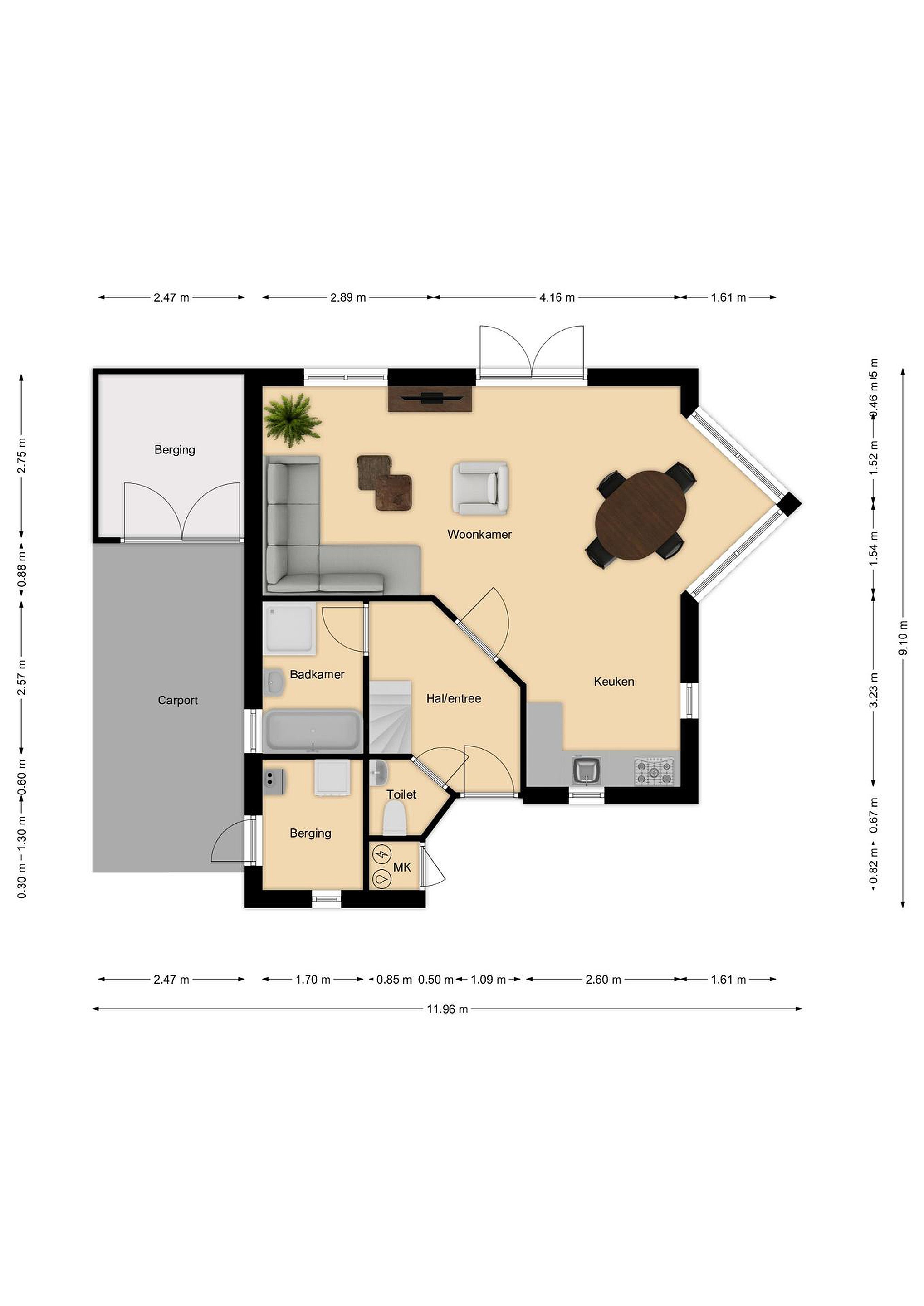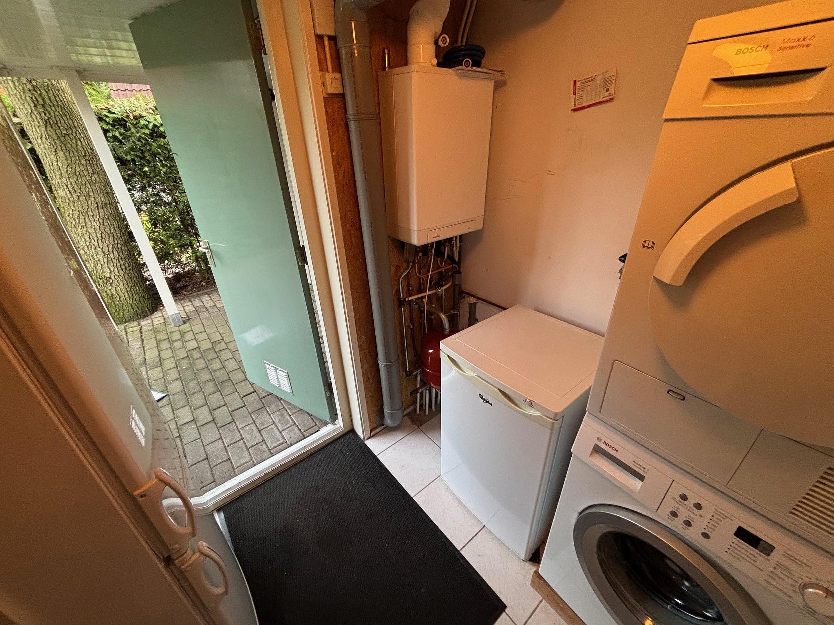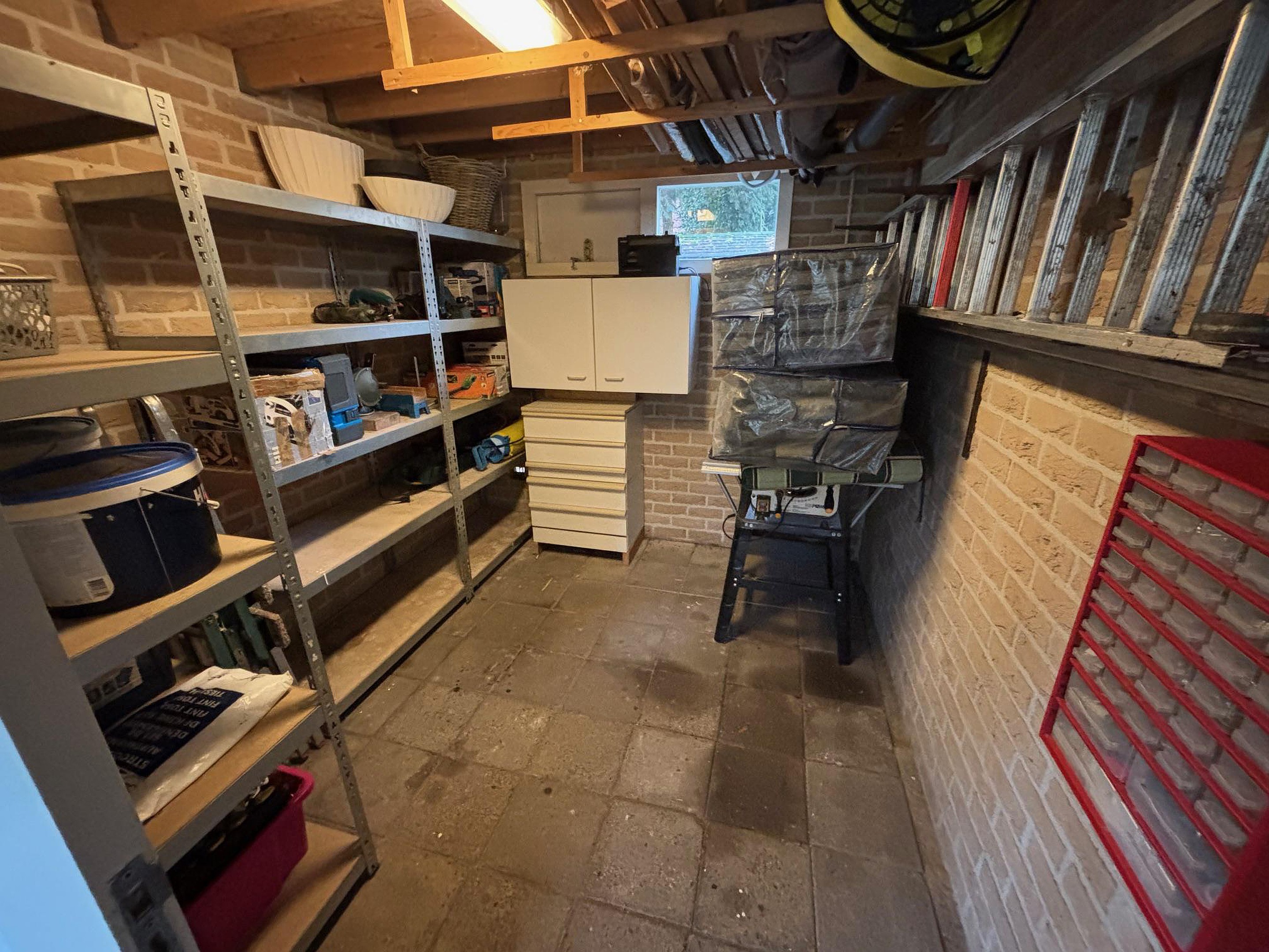 Begane grond Entree met trapopgang naar verdieping, meterkast via buitenzijde bereikbaar, staand toilet met fontein, badkamer met wastafelmeubel, ligbad en douche-inrichting met cabine, ruime woonkamer met tuindeuren naar terras en open keuken voorzien van een L-vormige inbouwkeuken voorzien van diverse inbouwapparatuur, inpandige berging via buitenom bereikbaar met opstelplaats van de cv-ketel, wasmachine/droger opstelplaats en extra provisieruimte, aangebouwde carport en aangebouwde berging/fietsenschuur.