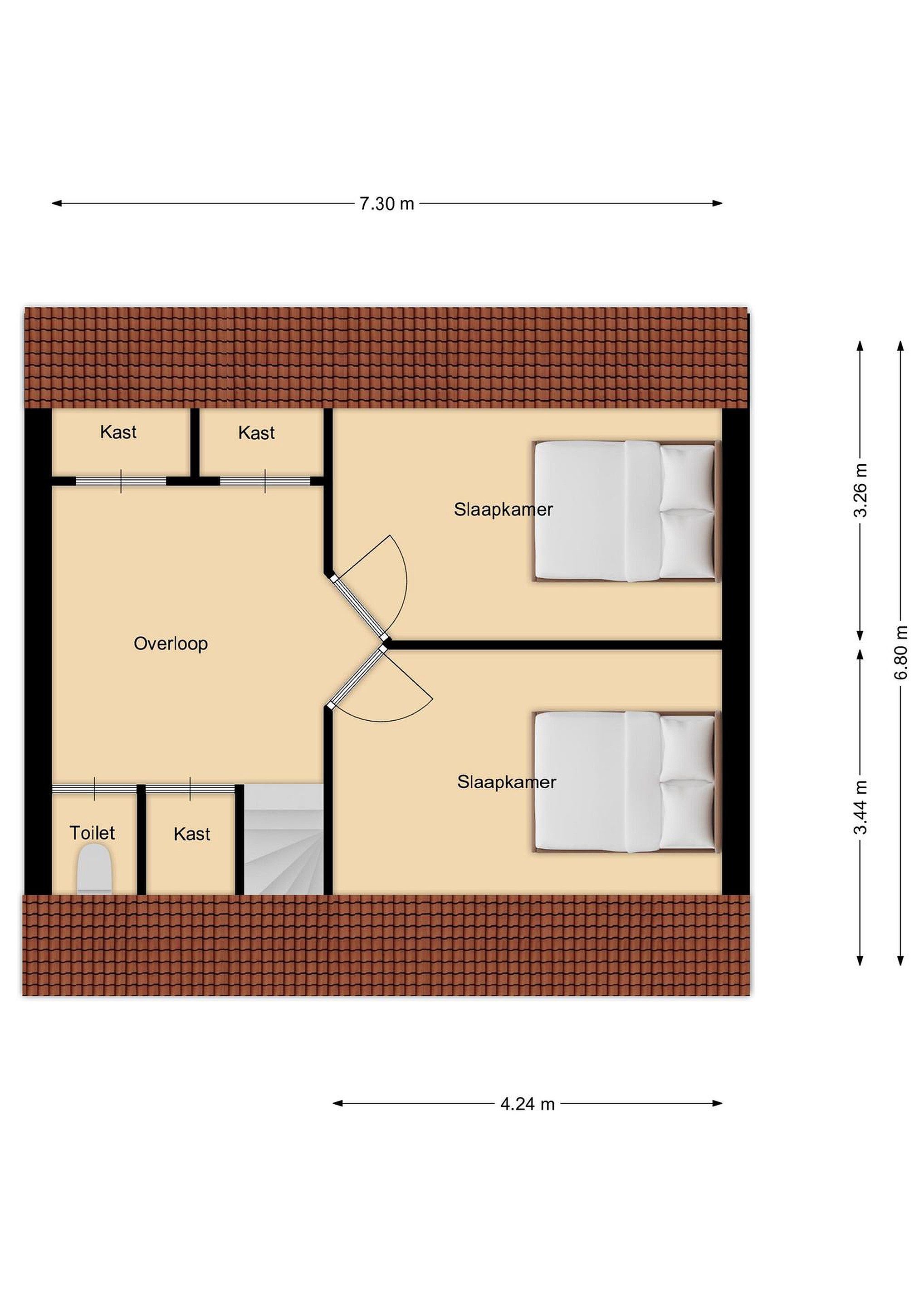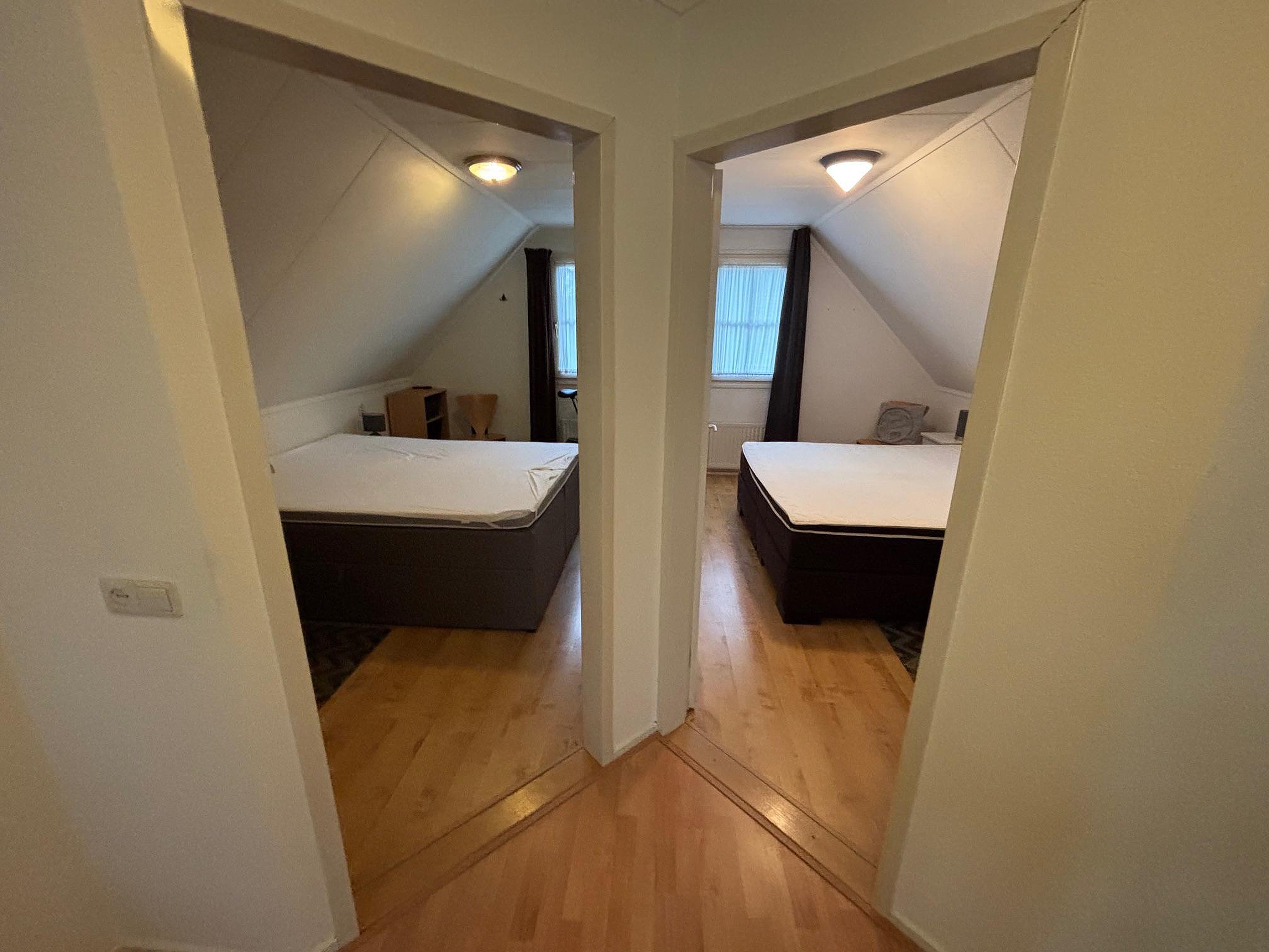 Eerste verdieping Royale overloop met extra wandcloset, 3 vaste kasten en bergruimte achter de knieschotten, 2 ruime slaapkamers waarvan 1 met bergruimte achter de knieschotten.