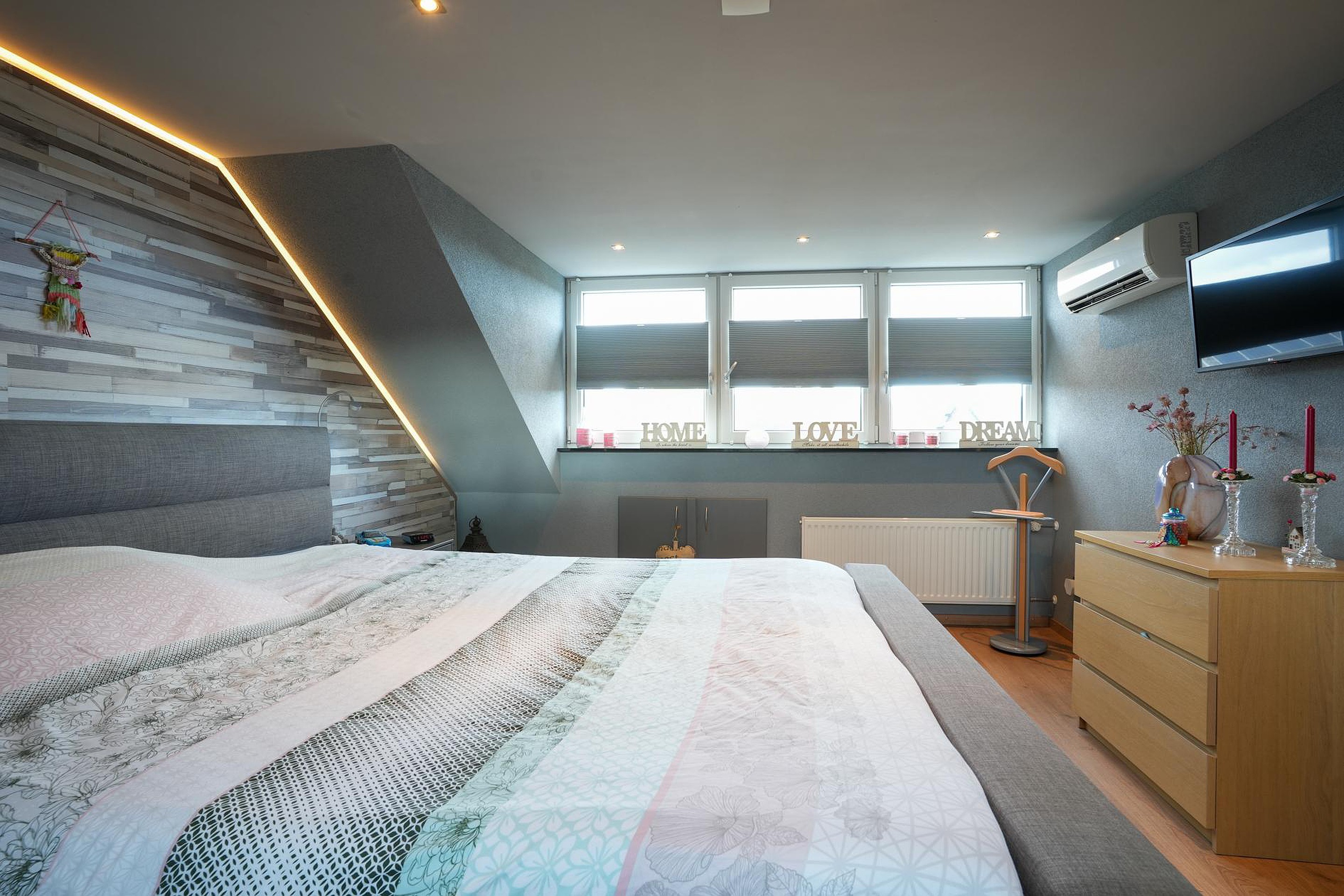 Een vaste trap leidt naar de tweede verdieping, die ruimte biedt aan een overloop, twee zolderbergingen en de master bedroom van circa 18.9 m2. De slaapkamer heeft een grote dakkapel aan de achterzijde, een dakraam, een mooie vloerafwerking en inbouwverlichting in het plafond.