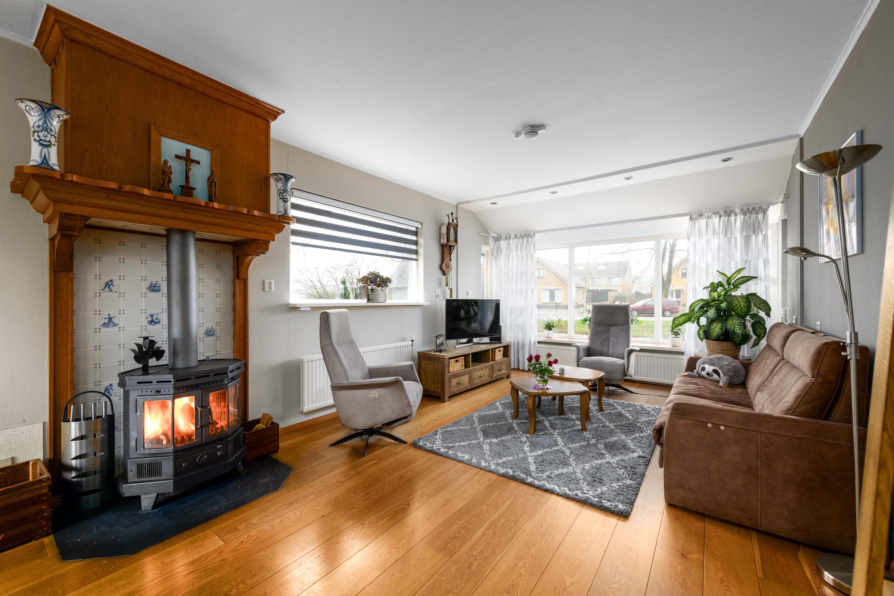 L-vormige woonkamer, aan de voorzijde uitgebouwd, met houtkachel en houten vloer