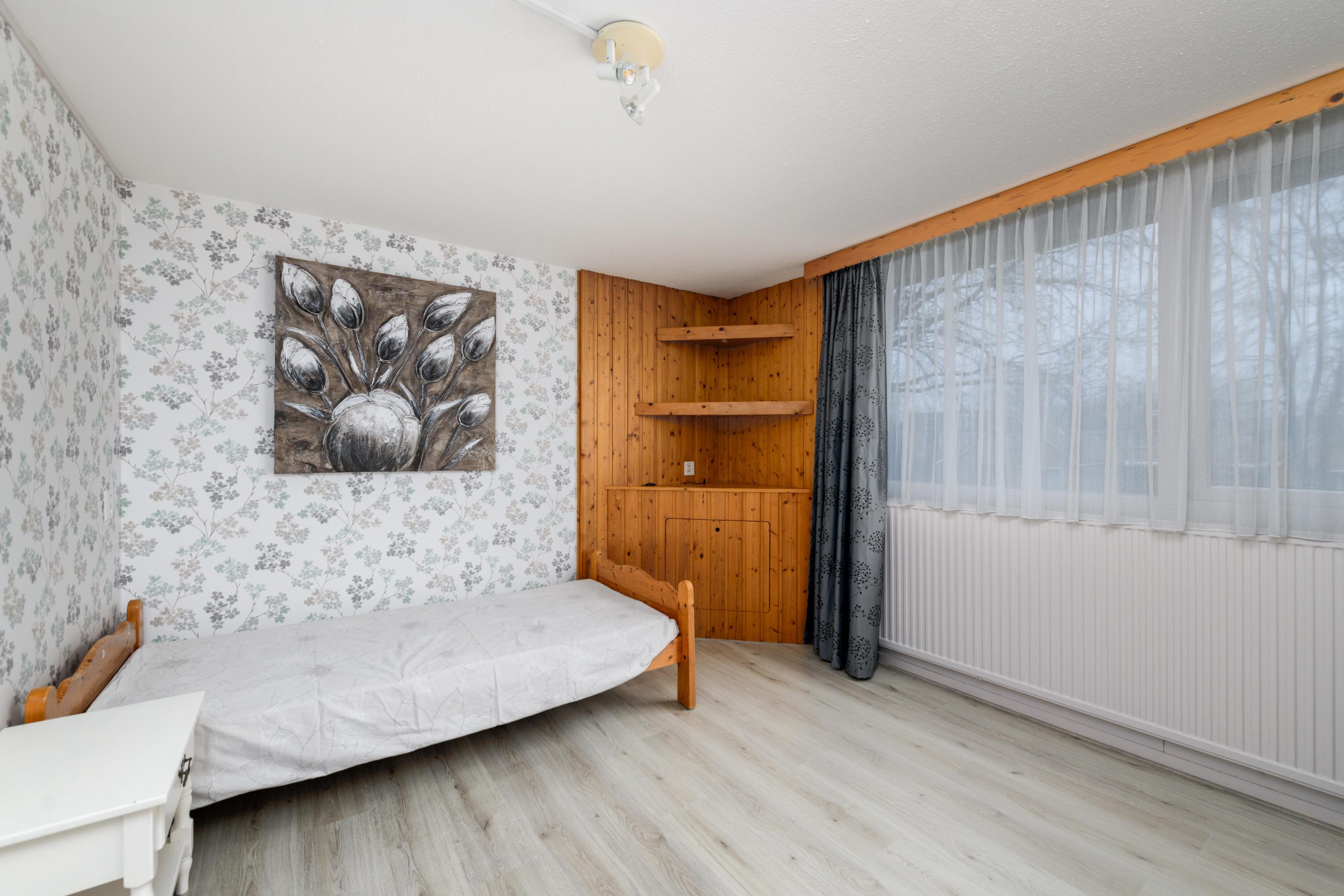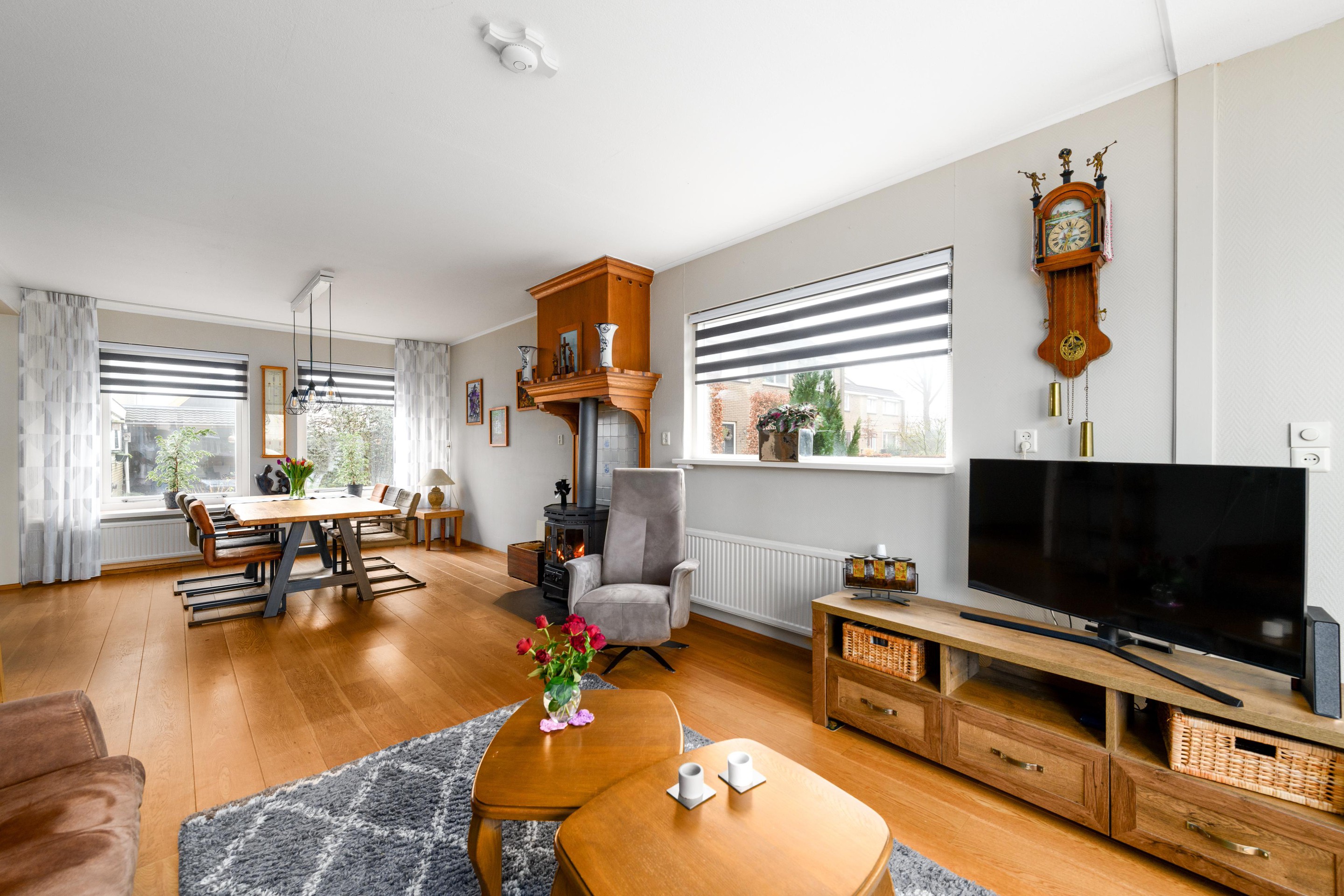 De woonkamer heeft aan de voorzijde vrij zicht op een groen plantsoen. De massief houten vloer en de houtkachel zorgen hier voor een warme en sfeervolle uitstraling. Dankzij de uitbouw is een royale leefruimte ontstaan.