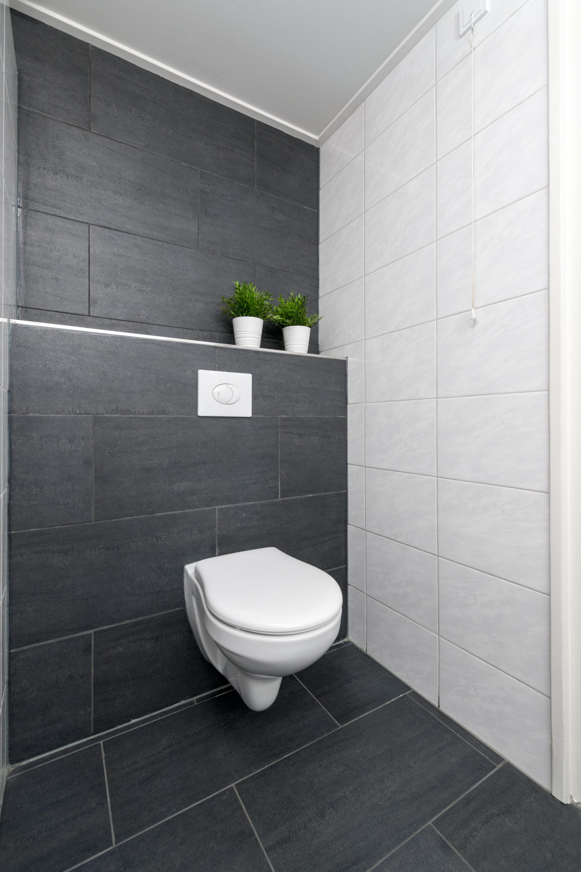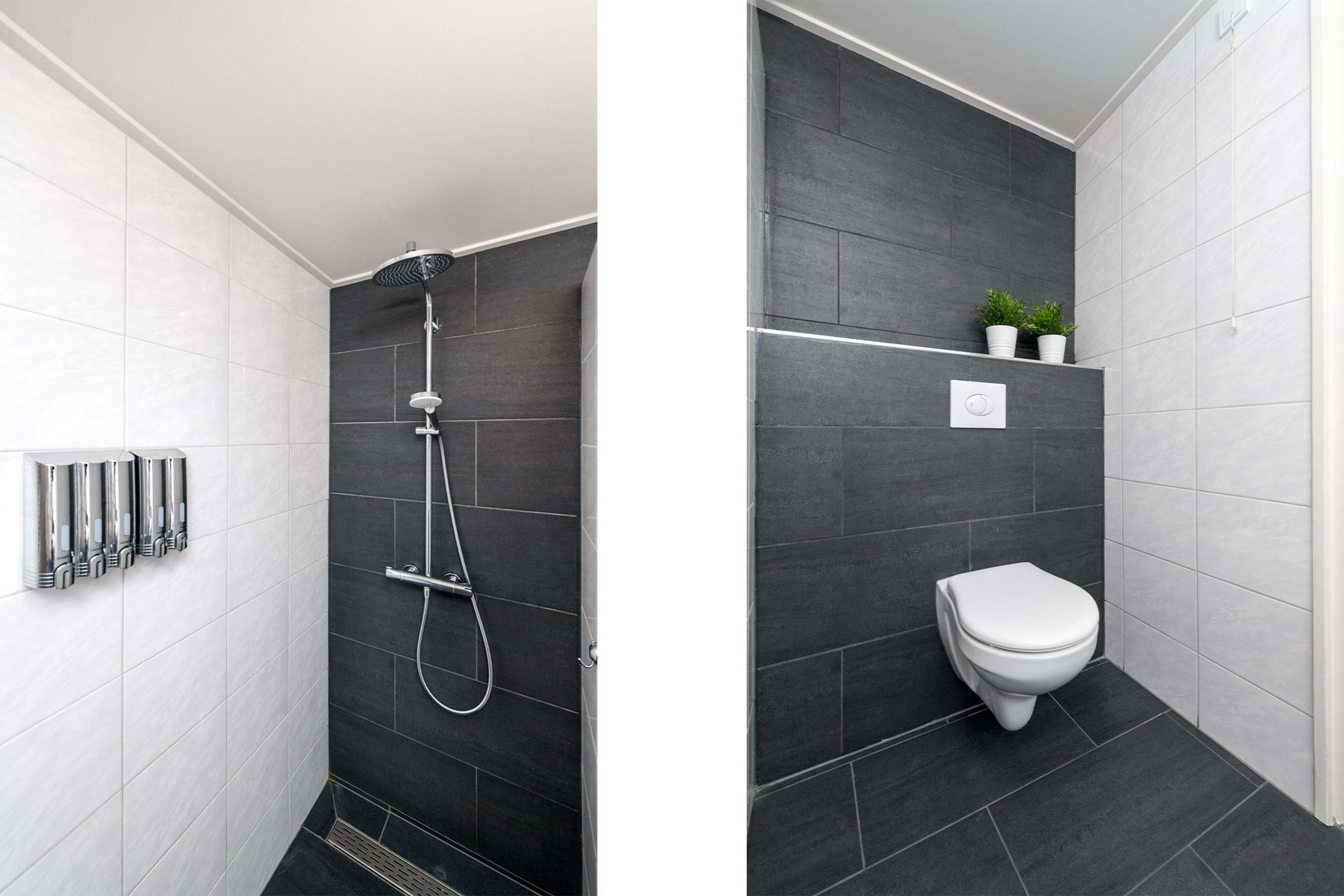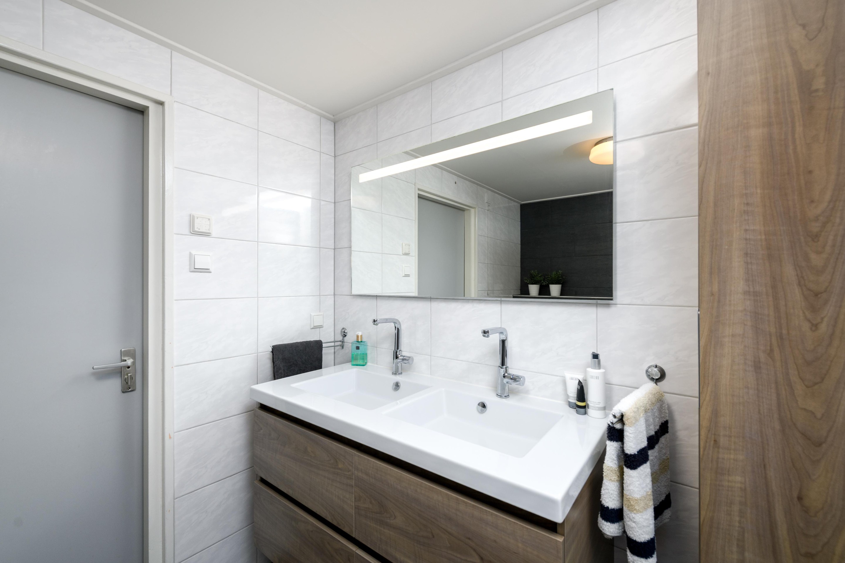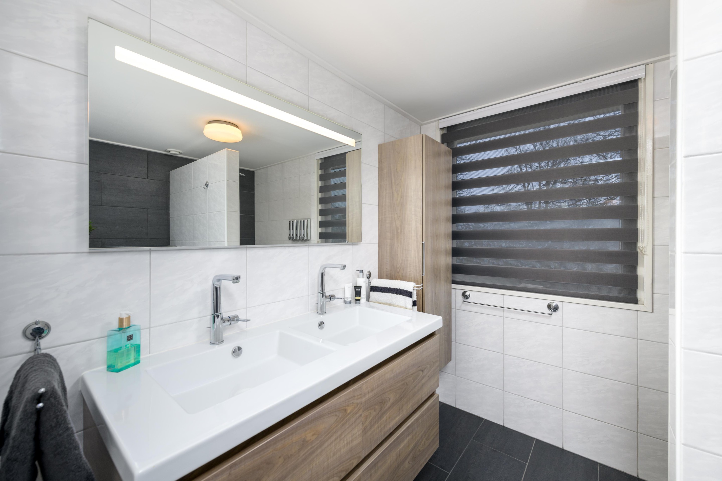 Nette moderne badkamer met inloopdouche, hangend toilet, meubel met dubbele wastafel en kast