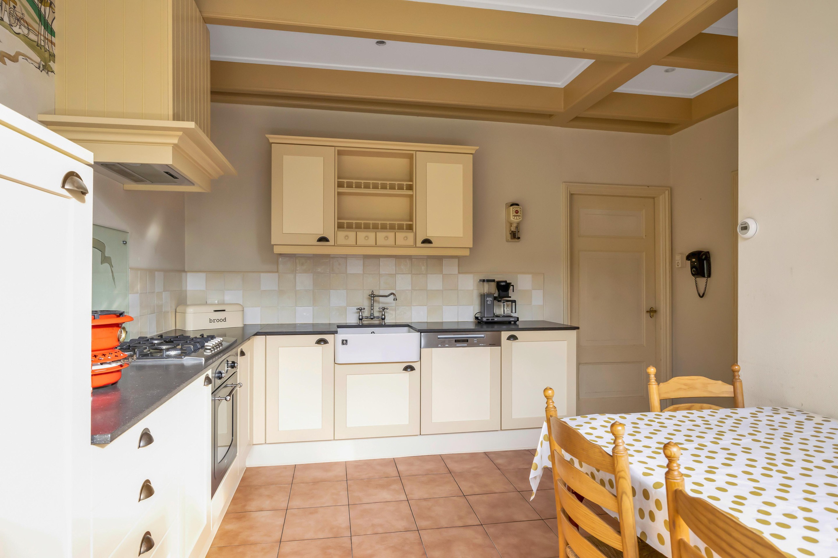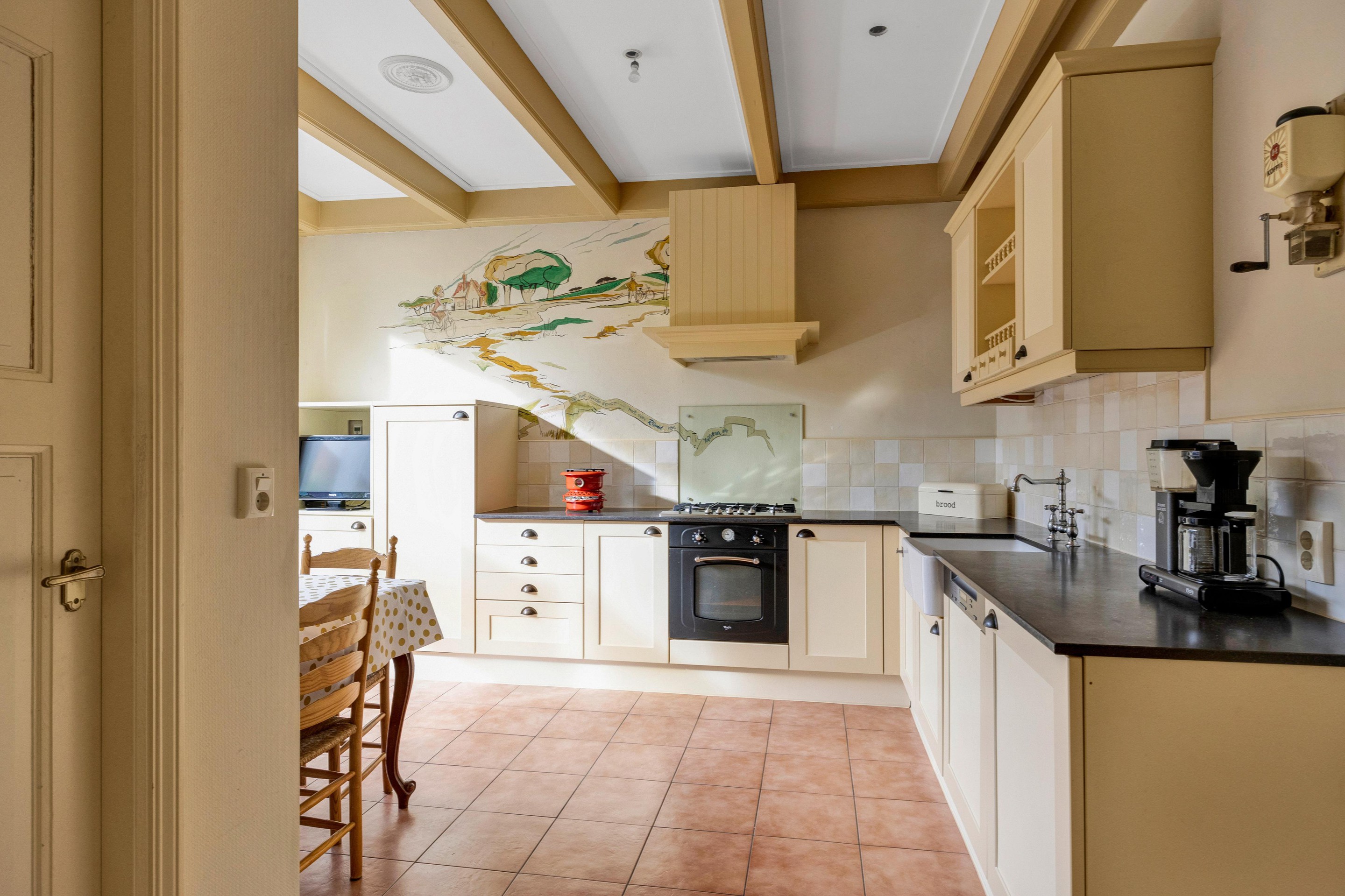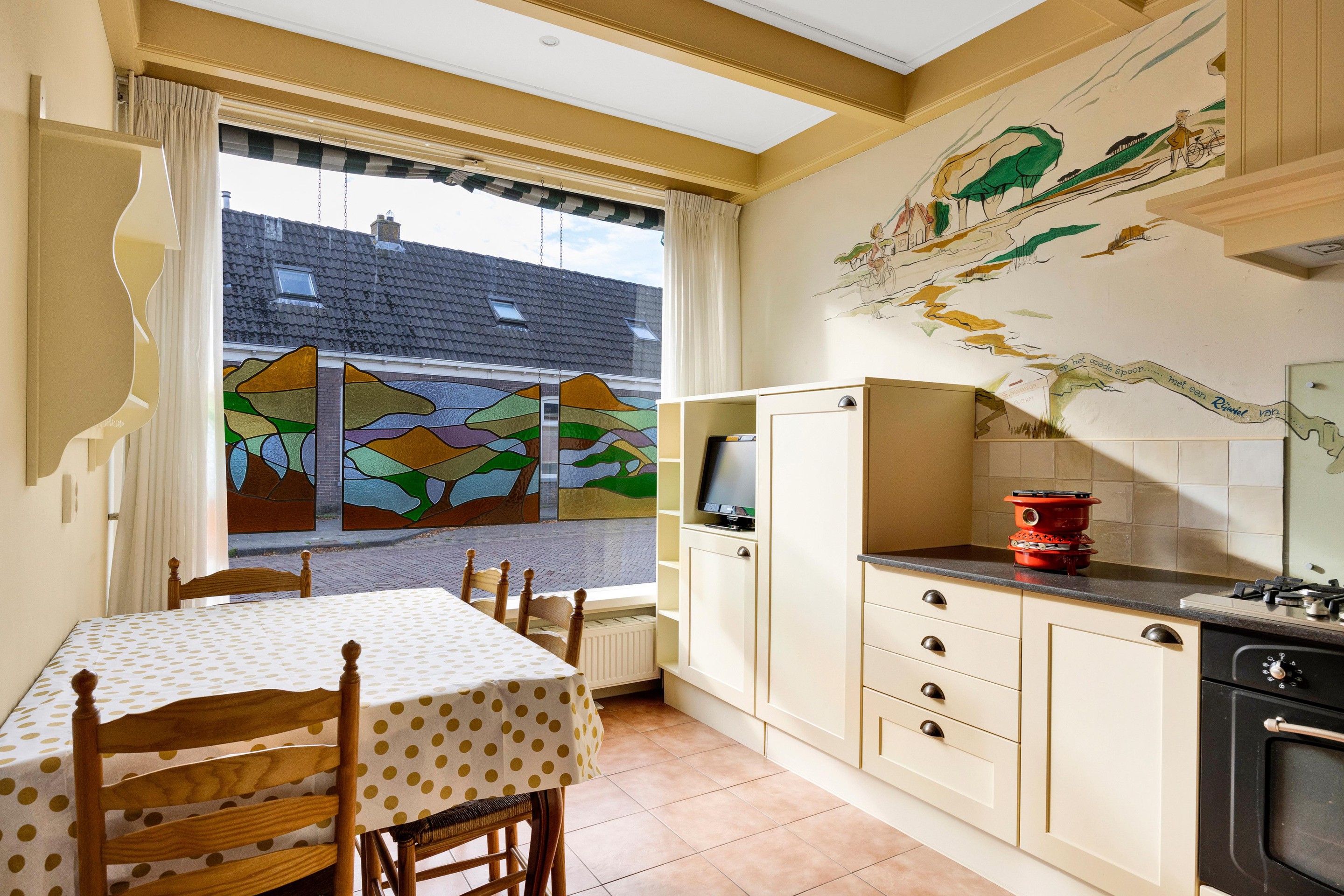 We betreden de woning via de voordeur en komen in de entree die toegang biedt tot de woonkeuken, deze is gesitueerd aan de voorzijde en heeft een grote hoek keukenopstelling in landelijke stijl welke voorzien is van diverse inbouwapparatuur zoals; koelkast, gaskookplaat, afzuigkap, vaatwasser en oven. Er is tevens vloerverwarming in de keuken. Rechts bevindt zich de woonkamer en suite, de prachtige authentieke schuifdeuren met glas-in-lood scheiden de voorkamer van de achterkamer, hier bevindt zich ook de kelder. Via de achterkamer maar ook via de woonkeuken is er toegang tot een hal met toegang tot een slaapkamer met wastafelmeubel, een bijkeuken met aansluiting voor de wasmachine en droger en het toilet. Via de bijkeuken is er toegang tot de achtertuin.