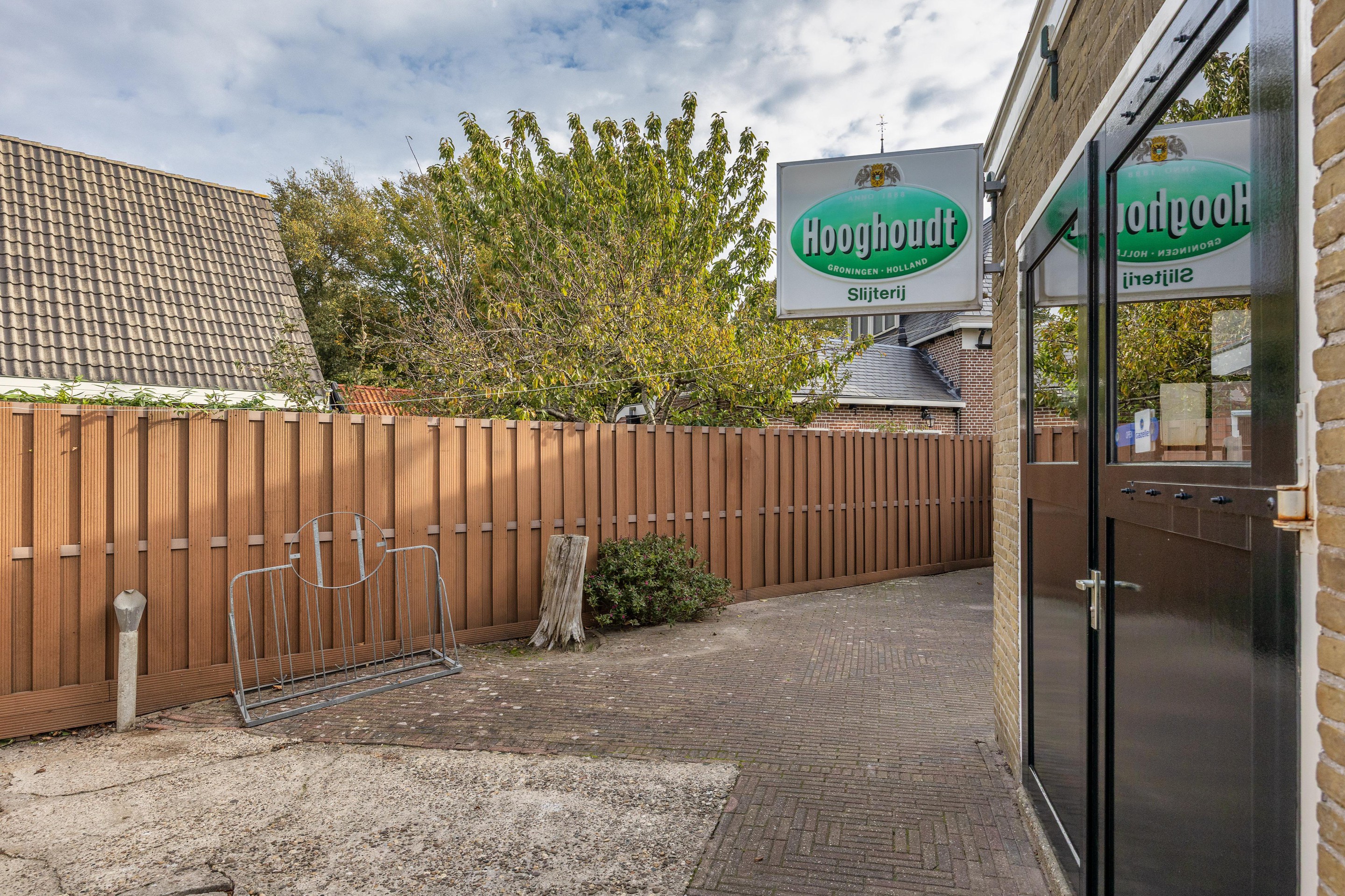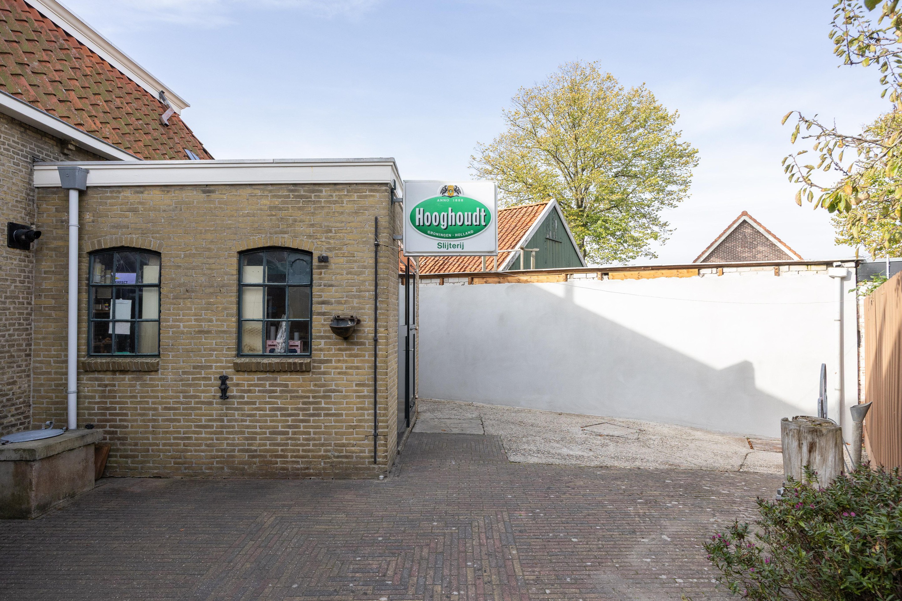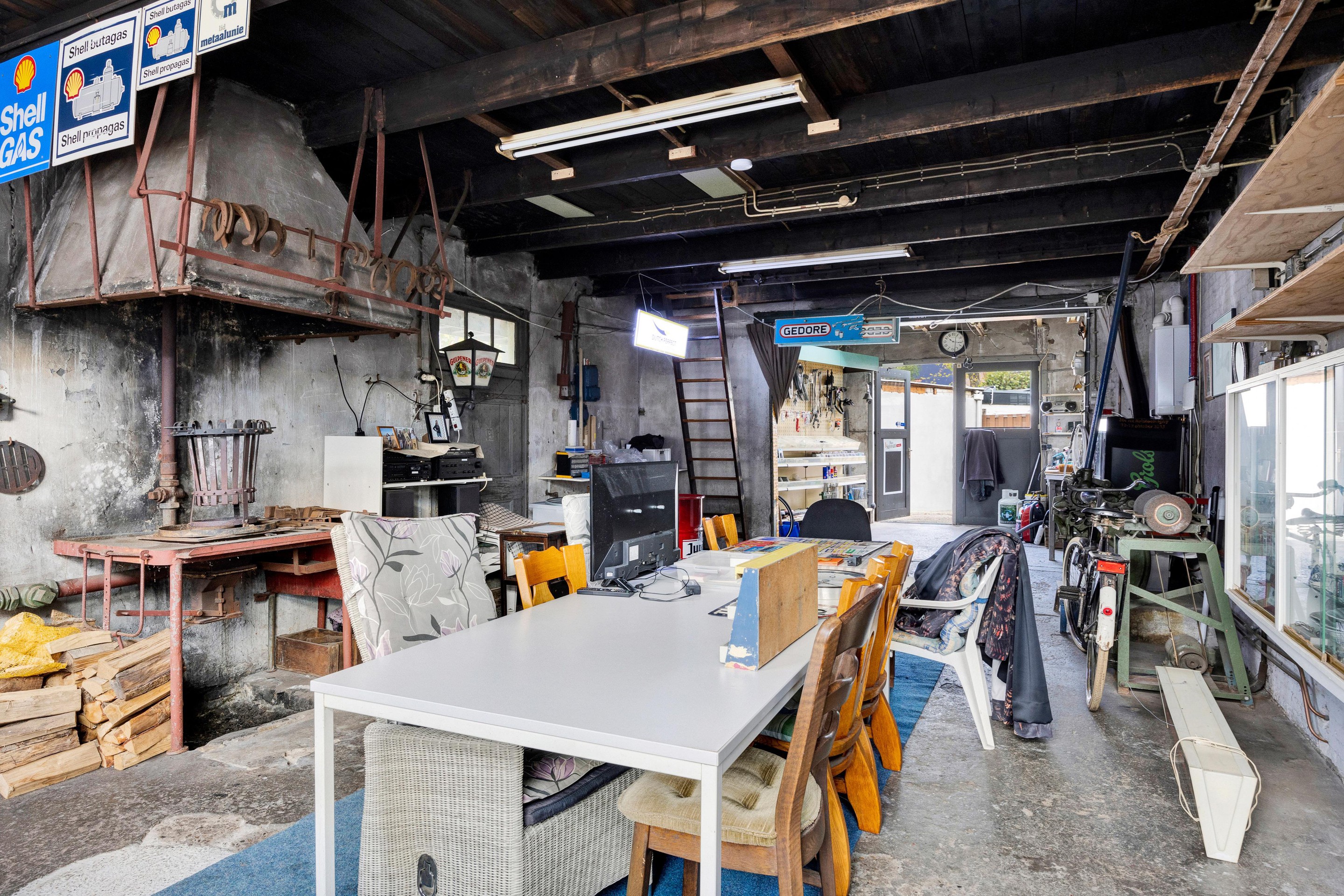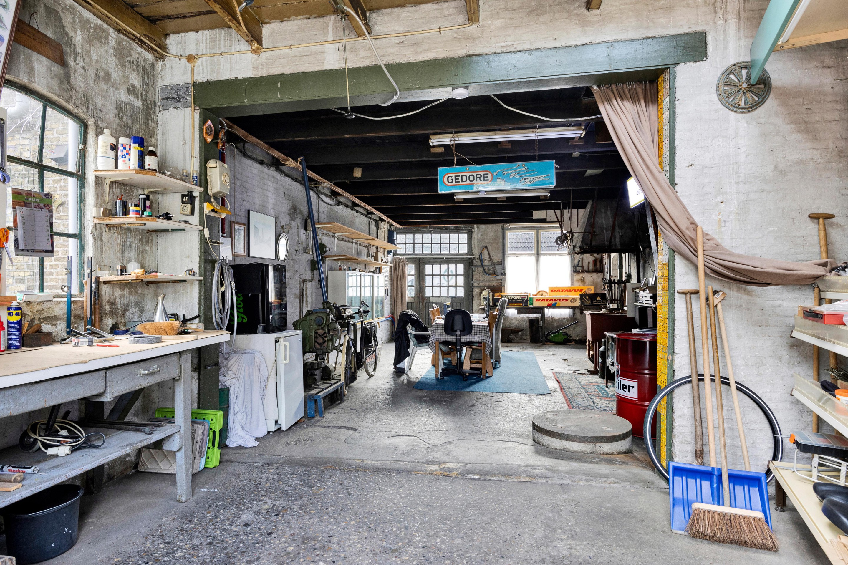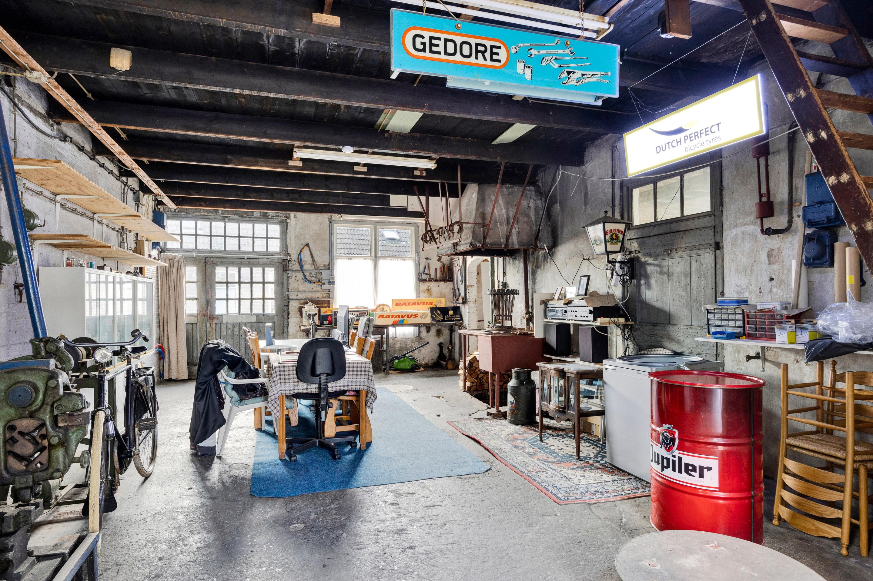 Via de voorzijde, linker- en achterzijde is de werkplaats/garage toegankelijk, de werkplaats was vroeger in gebruik als smederij, de originele smeedhaard is nog aanwezig. Aan de achterzijde is de ruimte uitgebreid met een berging, een optie is om deze te verwijderen zodat er een grotere achtertuin ontstaat. Naast de werkplaats bevindt zich nog een aangebouwde berging. Boven de werkplaats is een grote vliering. Er is krachtstroom aanwezig.