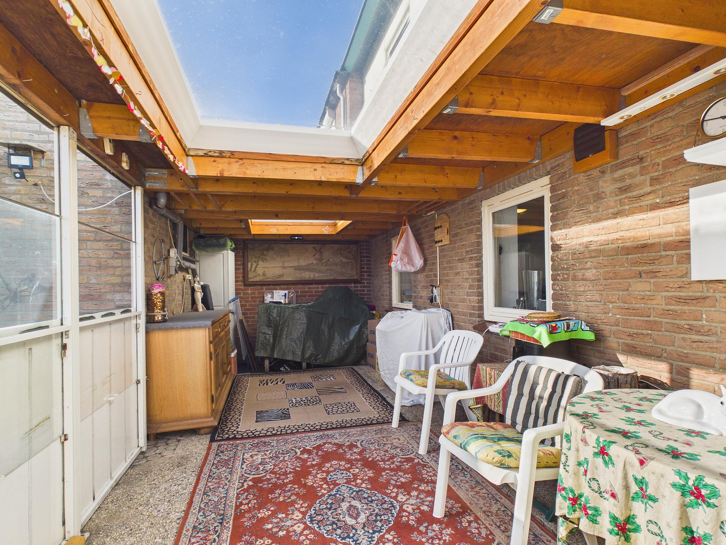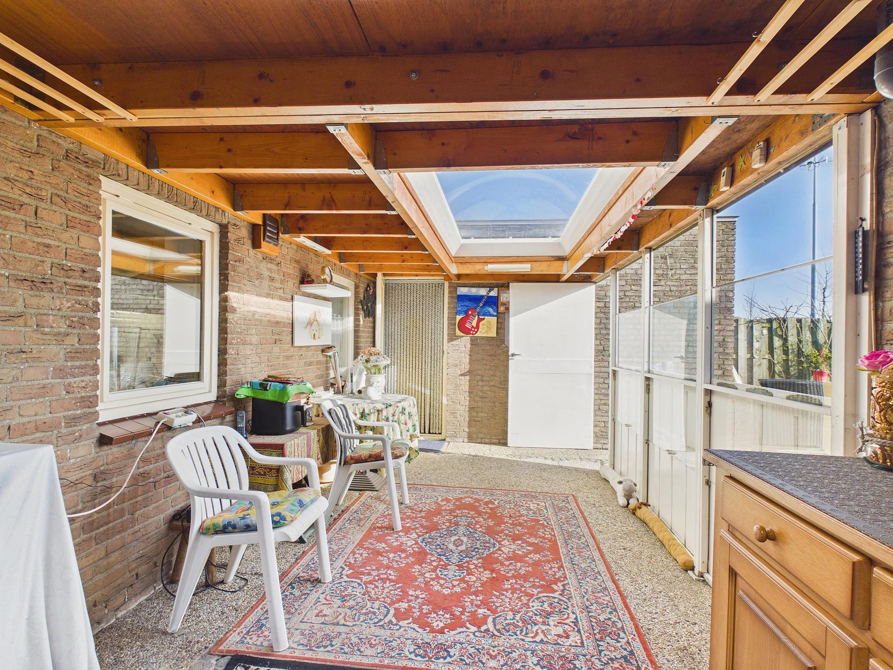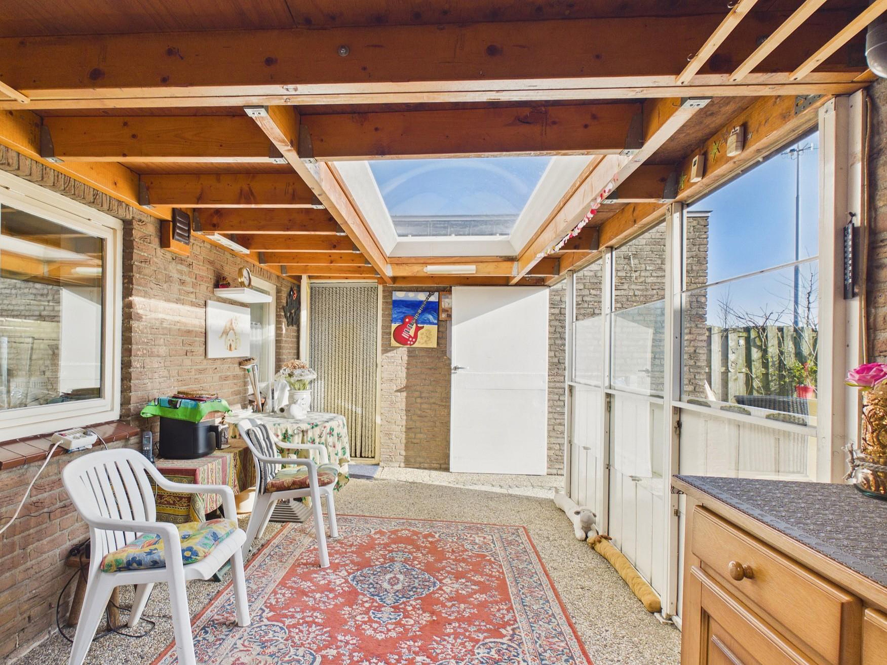 Een bijzonder pluspunt is de aangebouwde, afsluitbare overkapping met lichtkoepel. Dit is zo’n plek die je direct in gedachten al gaat gebruiken: in het vroege voorjaar met de eerste zonnestralen, op lange nazomeravonden of juist knus in het najaar en de winter. Een verlengstuk van de woning, waar binnen en buiten op een natuurlijke manier in elkaar overlopen.