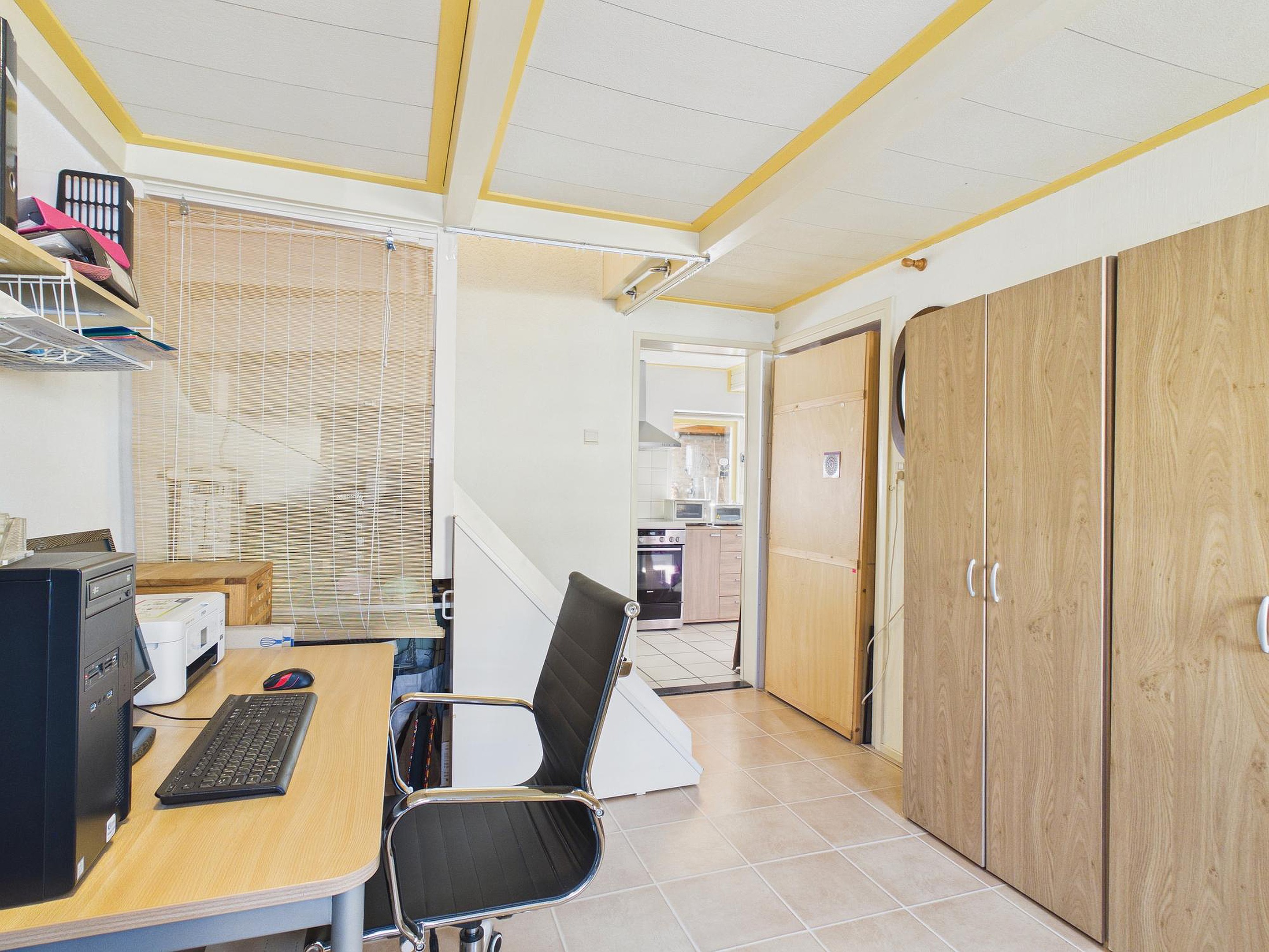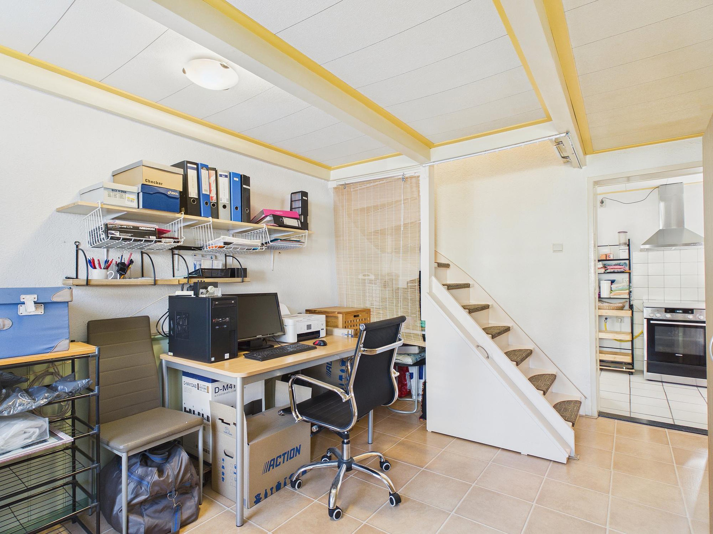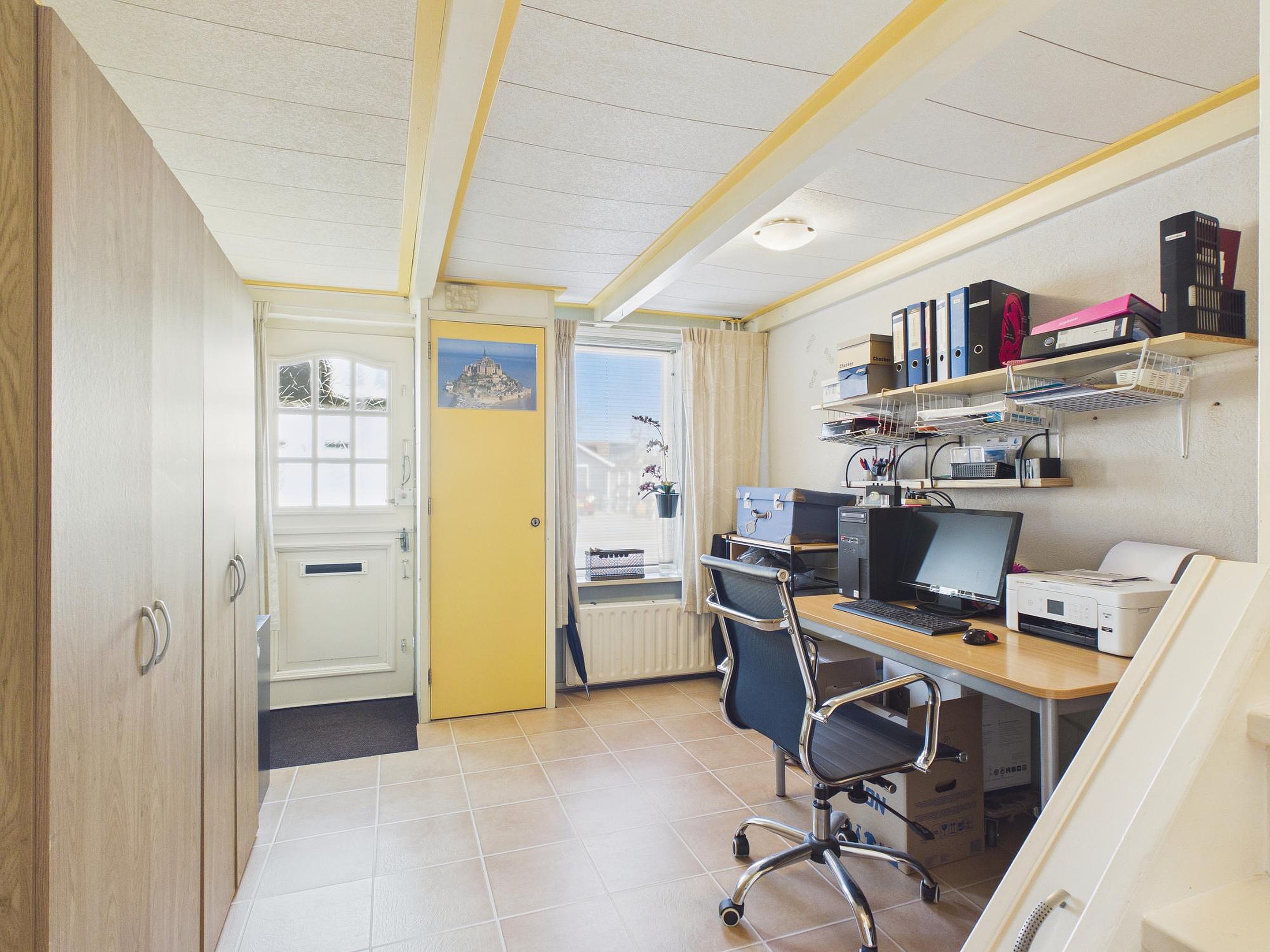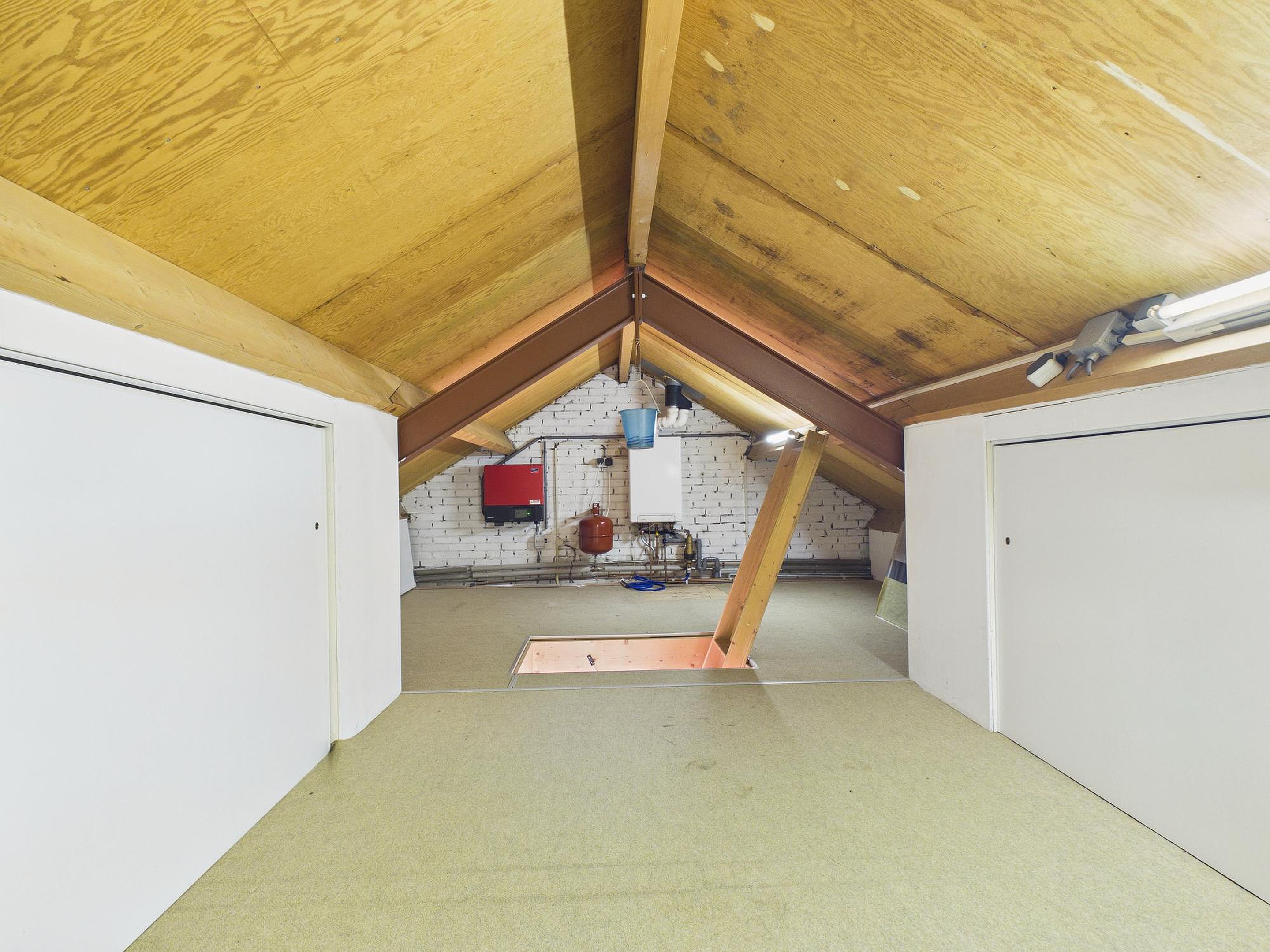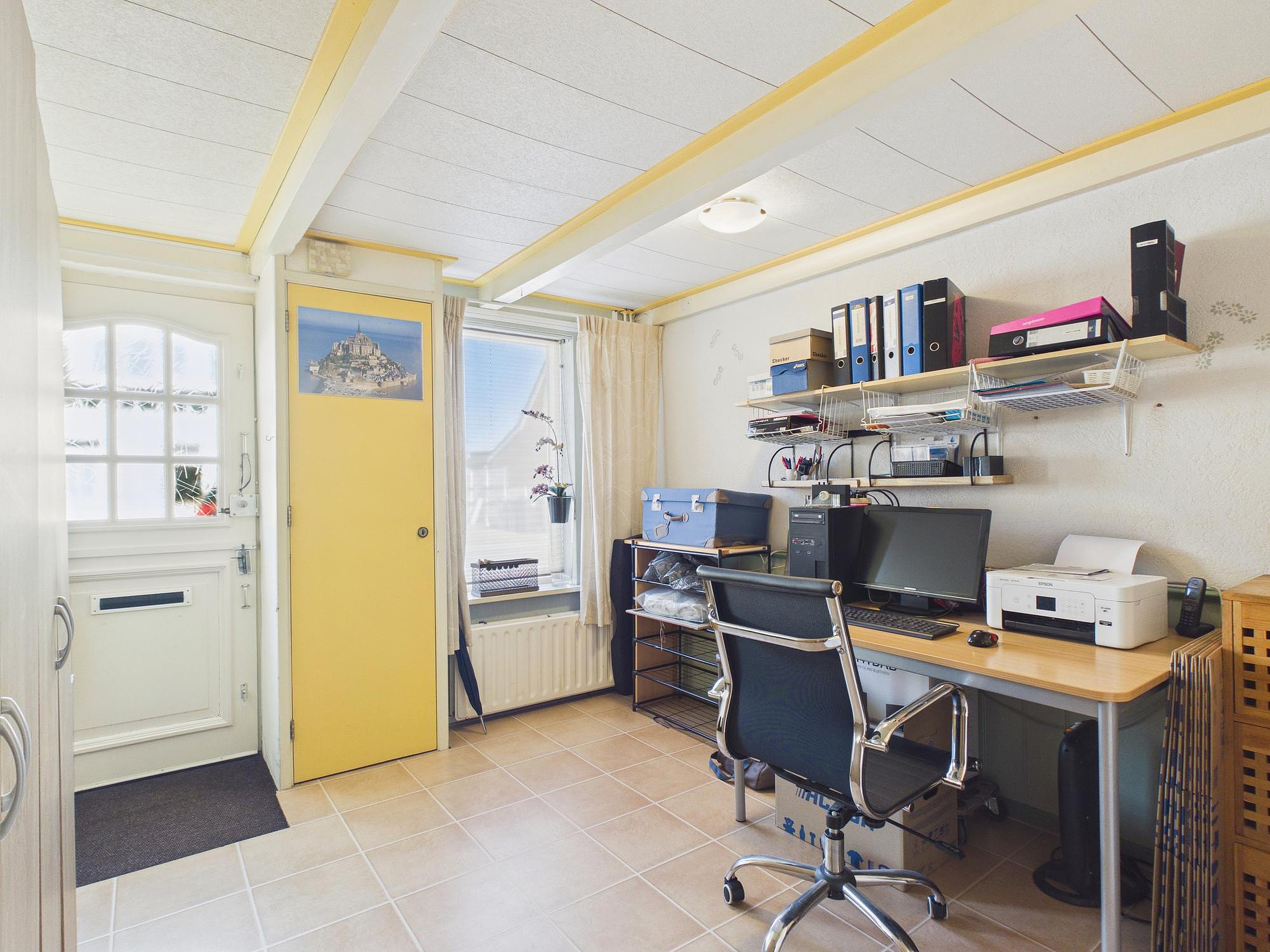 Verder beschikt de woning over een werkkamer/hal met trapopgang, een praktische bijkeuken met opstelplaats voor wasapparatuur en een via vlizotrap bereikbare bergzolder met de opstelplaats van de cv-ketel en de omvormer van de 14 zonnepanelen (Energielabel B).