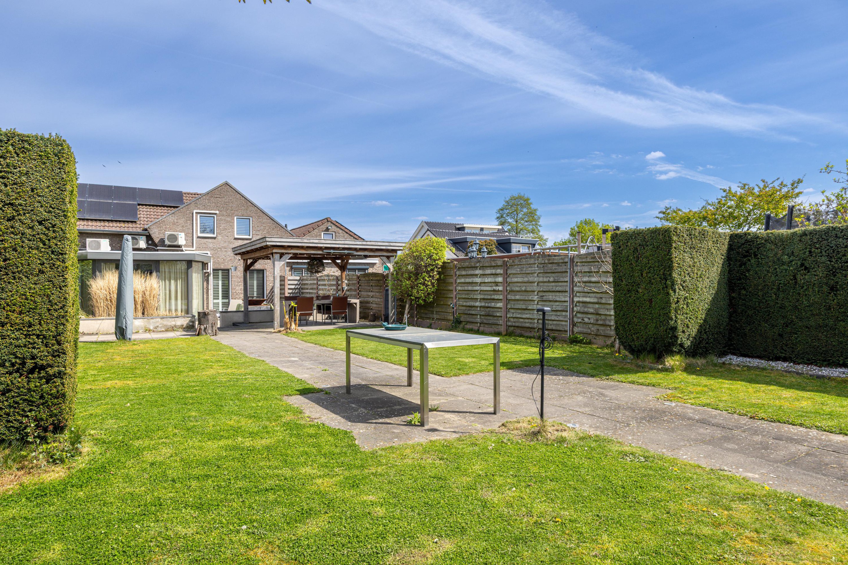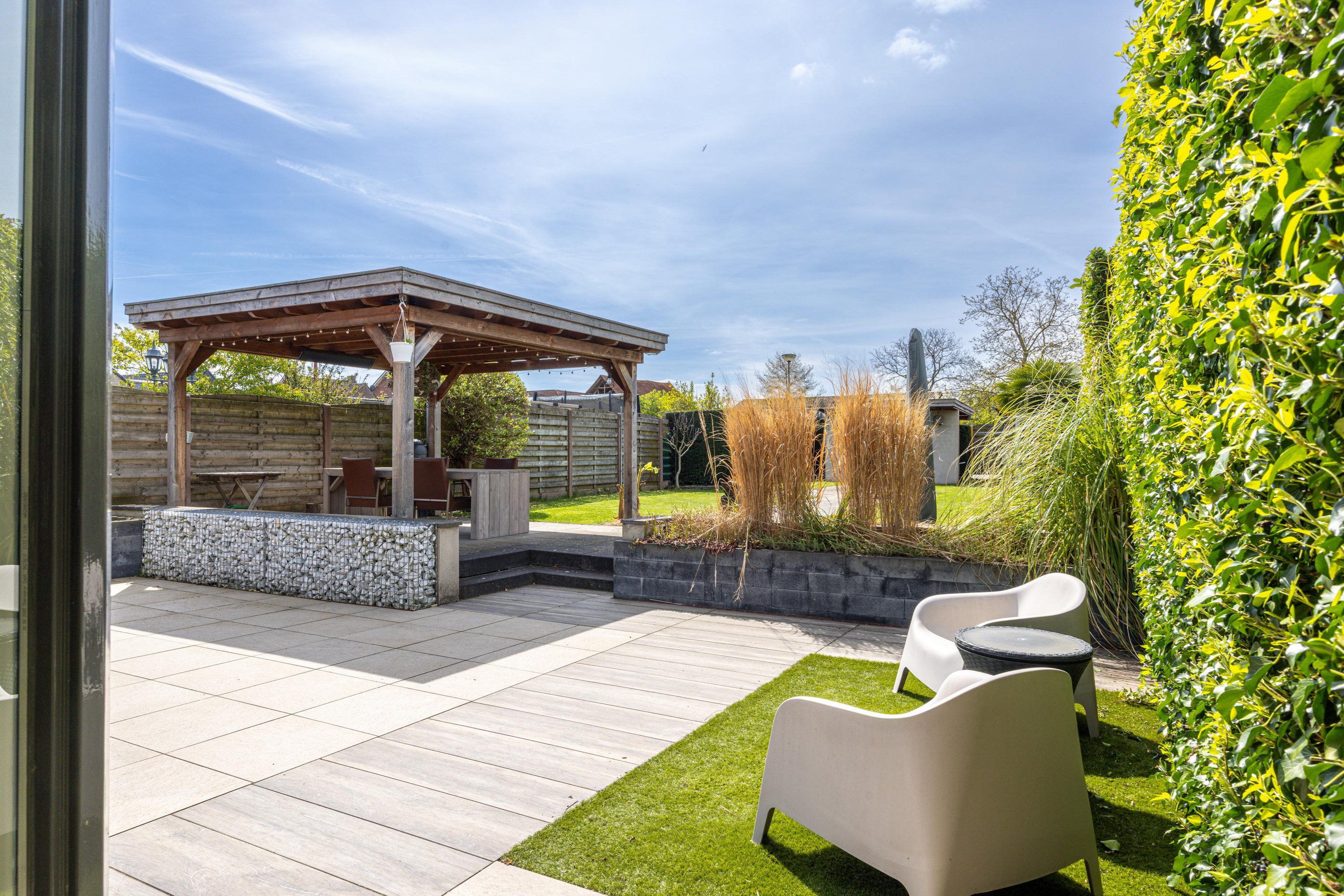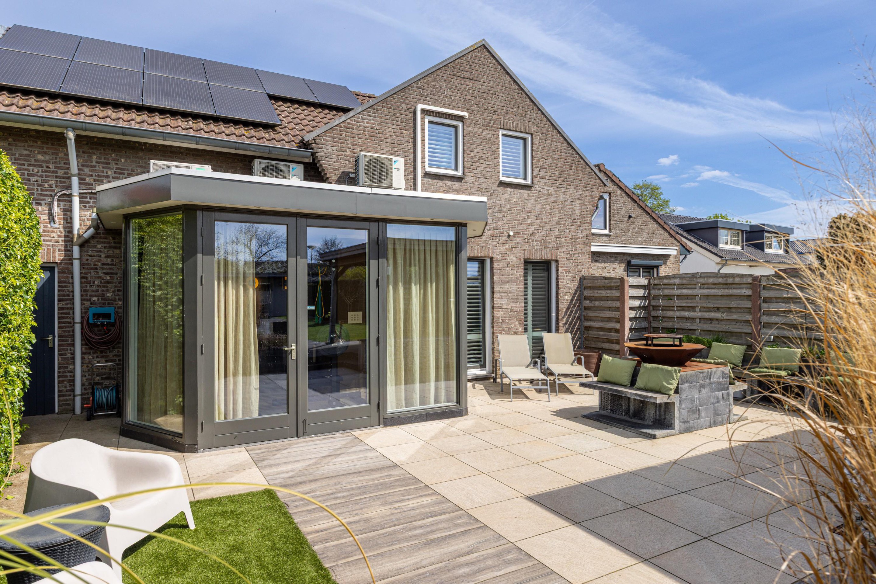 Direct achter de woning ligt een ruim terras, ideaal voor een zit- of eethoek. Aansluitend bevindt zich een sfeervolle overkapping, die zorgt voor een beschutte plek waar je al vroeg in het seizoen en tot laat in de avond comfortabel buiten kunt zitten. De combinatie van de overkapping met de vaste elementen, zoals de geïntegreerde zitgelegenheid, geeft deze plek een eigen karakter en maakt het een fijne plek om langere tijd buiten te verblijven.
