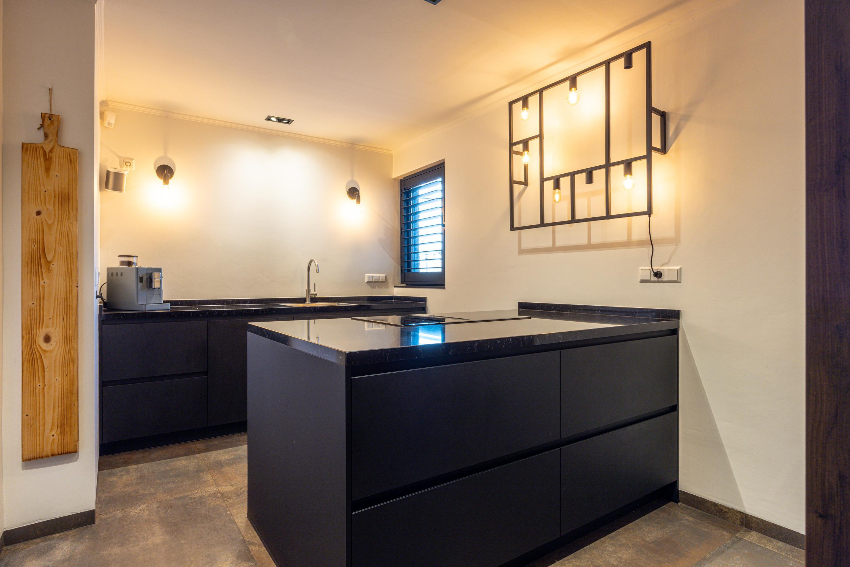 De open keuken (2021) sluit hier naadloos op aan en is uitgevoerd met een tegelvloer, hardhouten kozijnen met HR++ beglazing en hor, en beschikt over volop kast- en werkruimte. De keuken is compleet uitgerust met onder andere een 4-pits inductiekookplaat met geïntegreerde afzuiging, heteluchtoven, koelkast en vaatwasser. Aansluitend ligt de bijkeuken met witgoedaansluitingen en extra bergruimte.