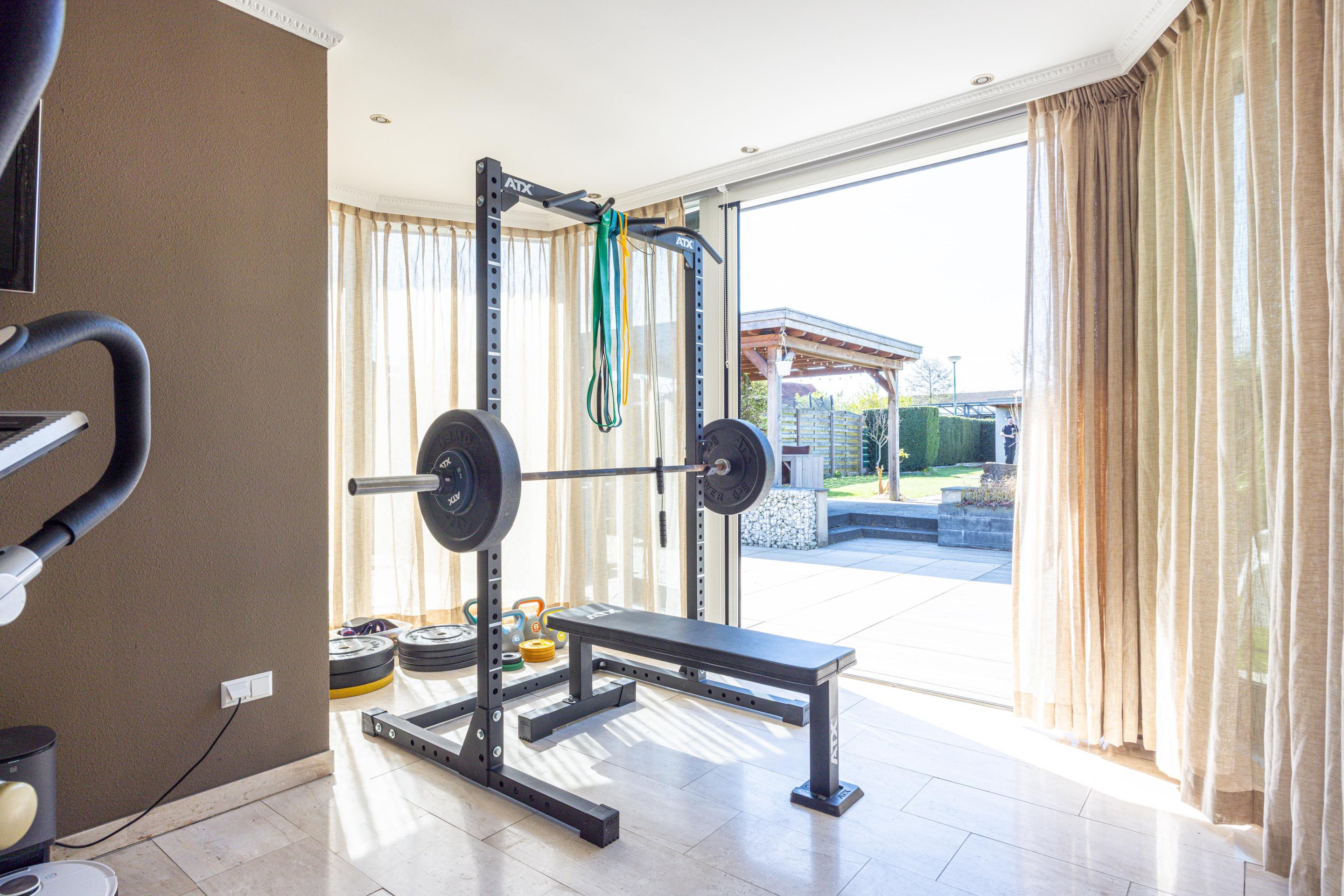 De woonkamer is ruim en licht dankzij de grote raampartijen en afgewerkt met een travertinvloer met vloerverwarming. De hardhouten kozijnen zijn grotendeels voorzien van HR++ beglazing. Via schuifdeuren sta je in directe verbinding met de aangrenzende kantoorruimte en de wellnessruimte. De wellnessruimte is in dezelfde hoogwaardige stijl uitgevoerd met een travertinvloer met vloerverwarming en hardhouten kozijnen met HR++ beglazing en staat via een trap in verbinding met de bovenliggende woonlaag. De kantoorruimte vormt een volwaardige werkruimte en wordt verwarmd middels een pelletkachel en een warmtepomp airco.