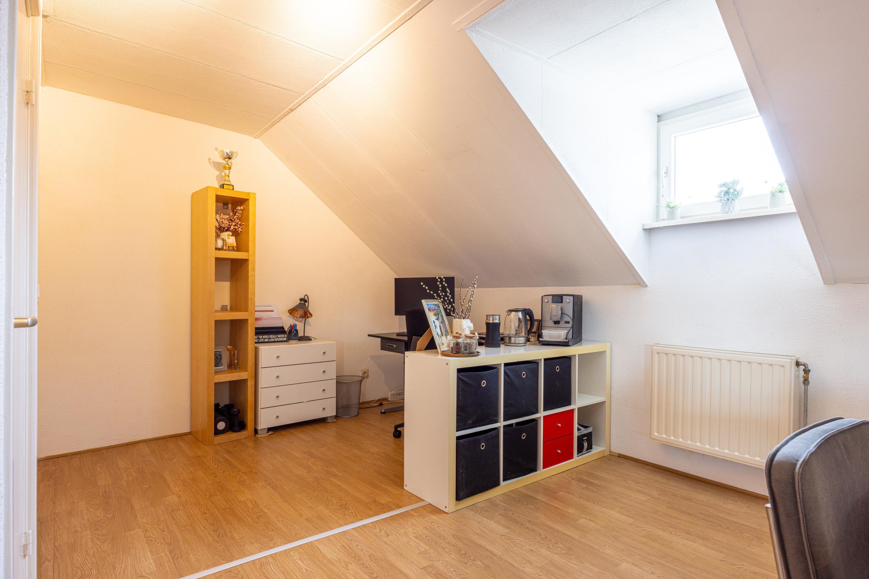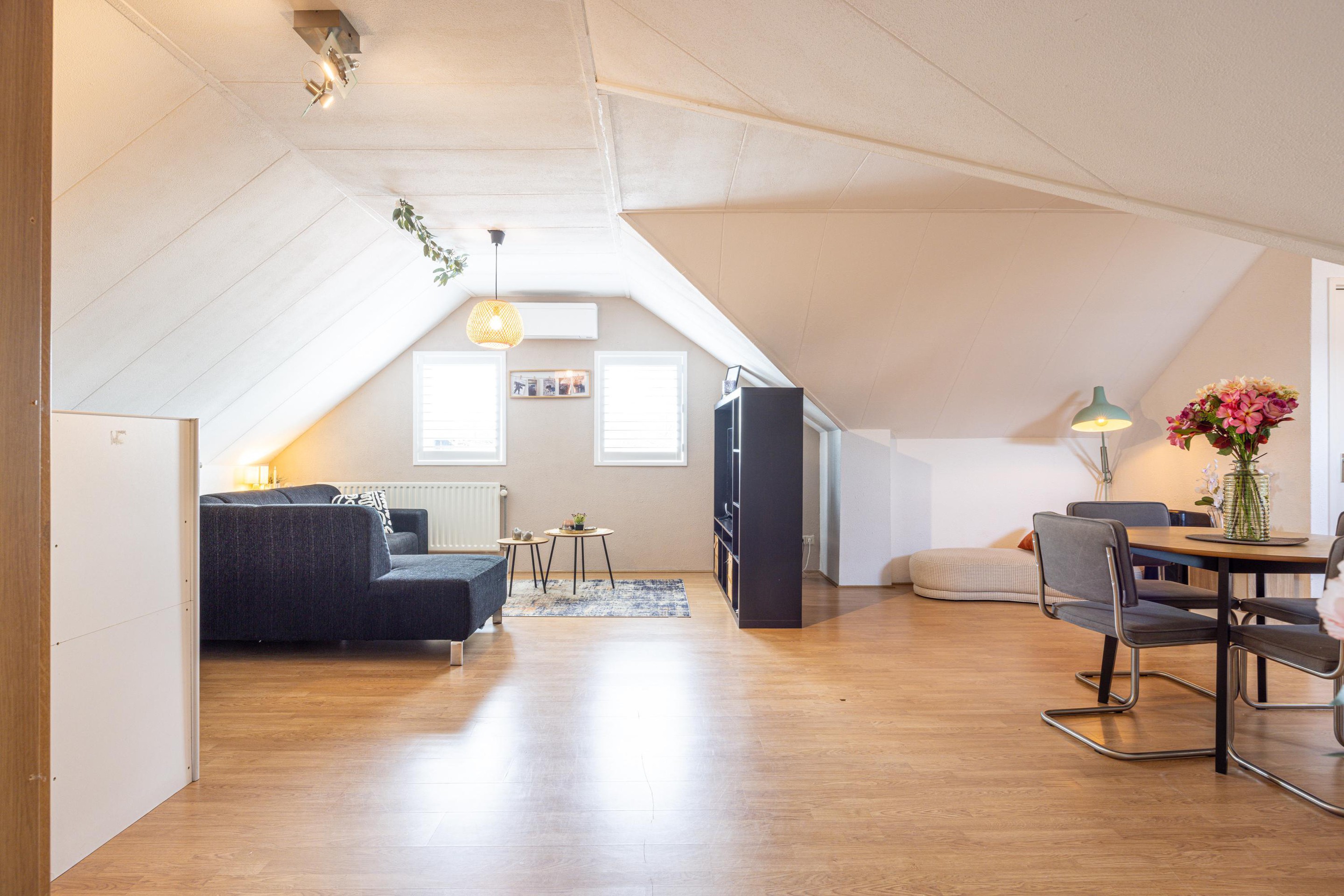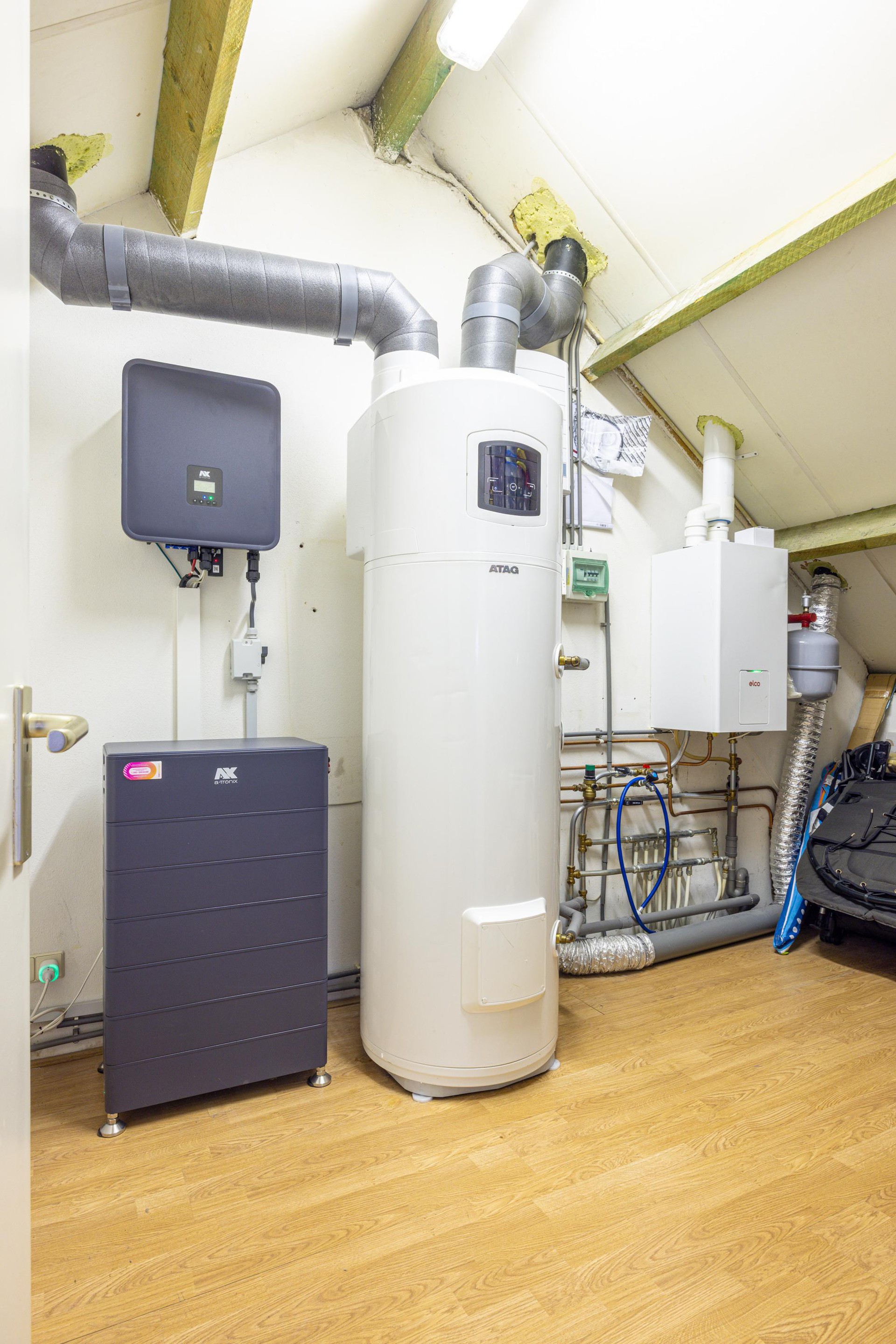 Eerste verdieping Deze verdieping maakt de woning extra veelzijdig en is ideaal voor dubbele bewoning, een inwonend gezinslid of een separate leefruimte. Via de houten trap bereik je de ruime overloop. Hier heb je toegang tot een ruime zolderkamer die eenvoudig is in te richten als extra slaapkamer, de badkamer, de hoofdslaapkamer, en de technische ruimte met cv-installatie, warmteboiler en thuisbatterij. De overloop is afgewerkt met een pvc-vloer en voorzien van een raam met hardhouten kozijnen, dubbel glas en hor.