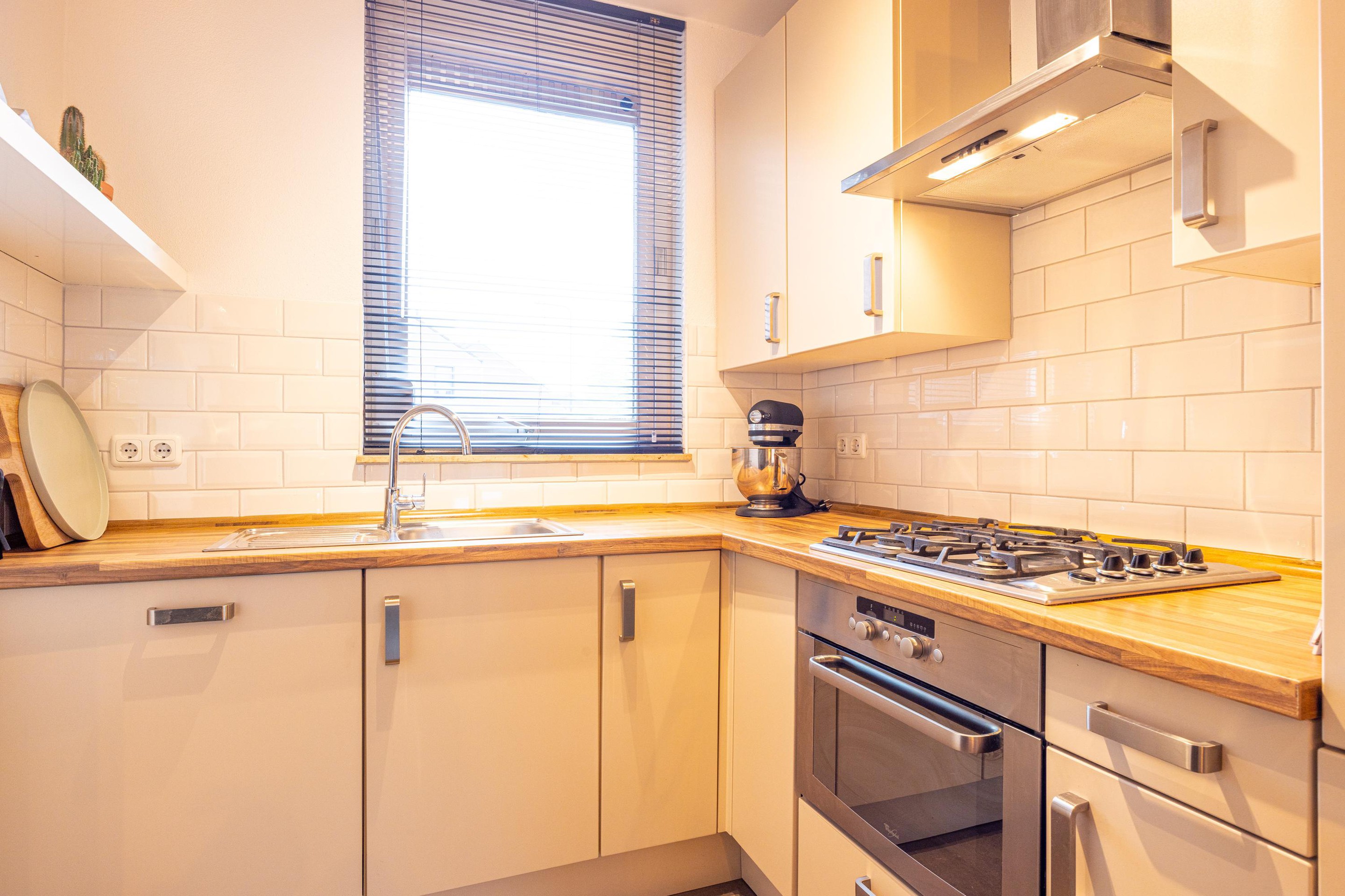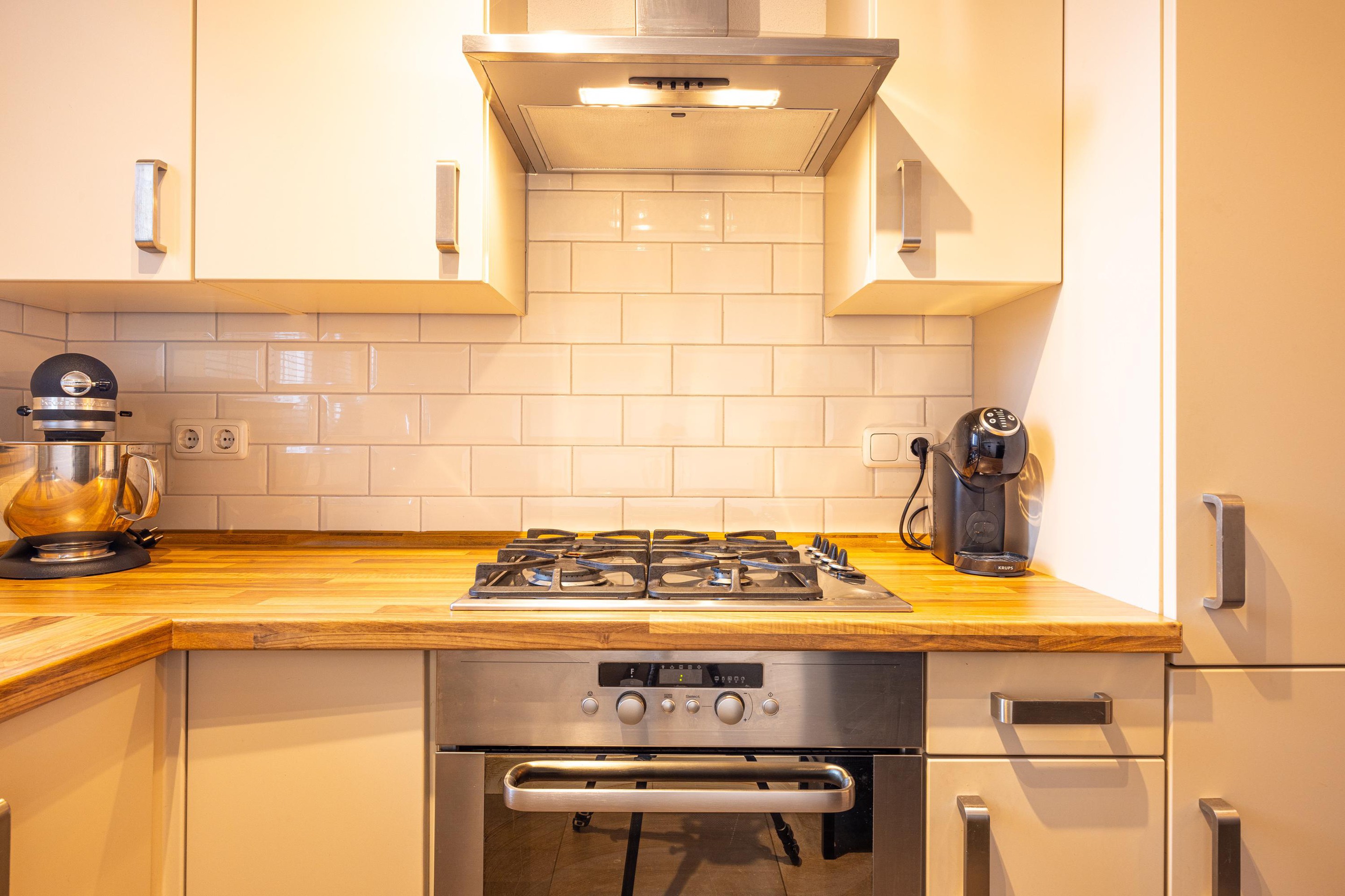 De open keuken, in hoekopstelling is voorzien van dezelfde vloertegels. De keuken is voorzien van een 4-pits gasfornuis, combi heteluchtoven, koelkast, vriezer en een vaatwasser.