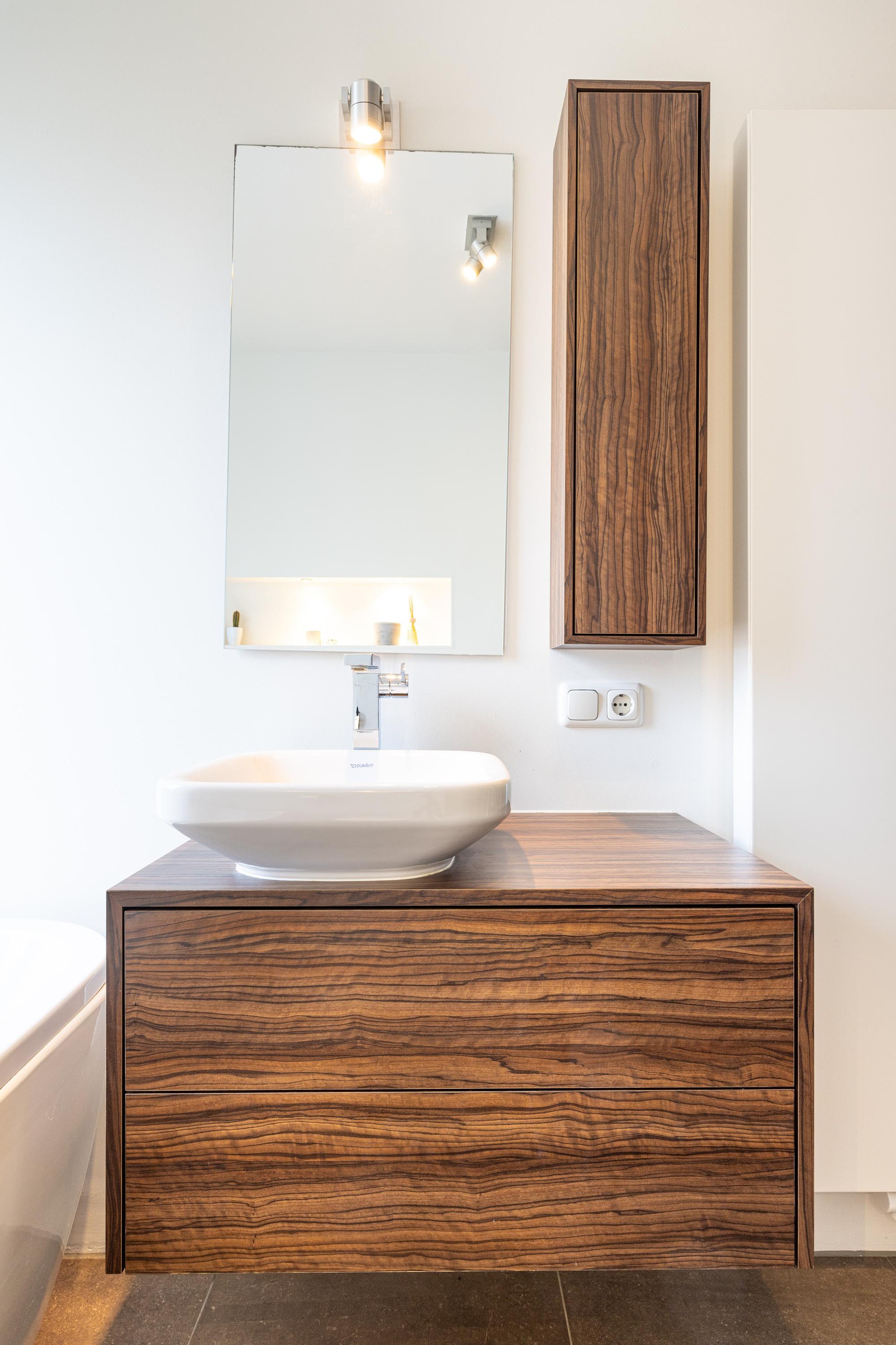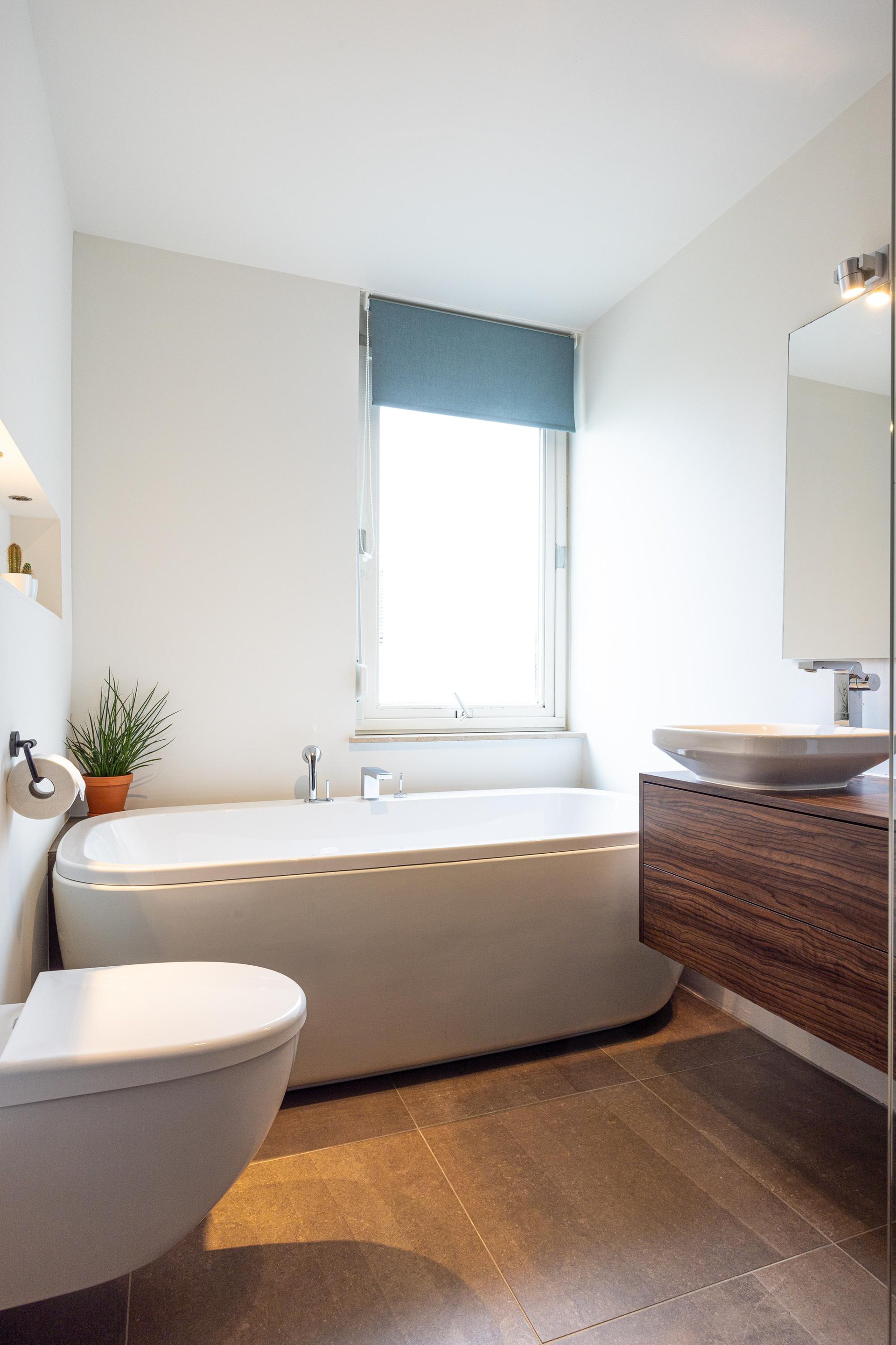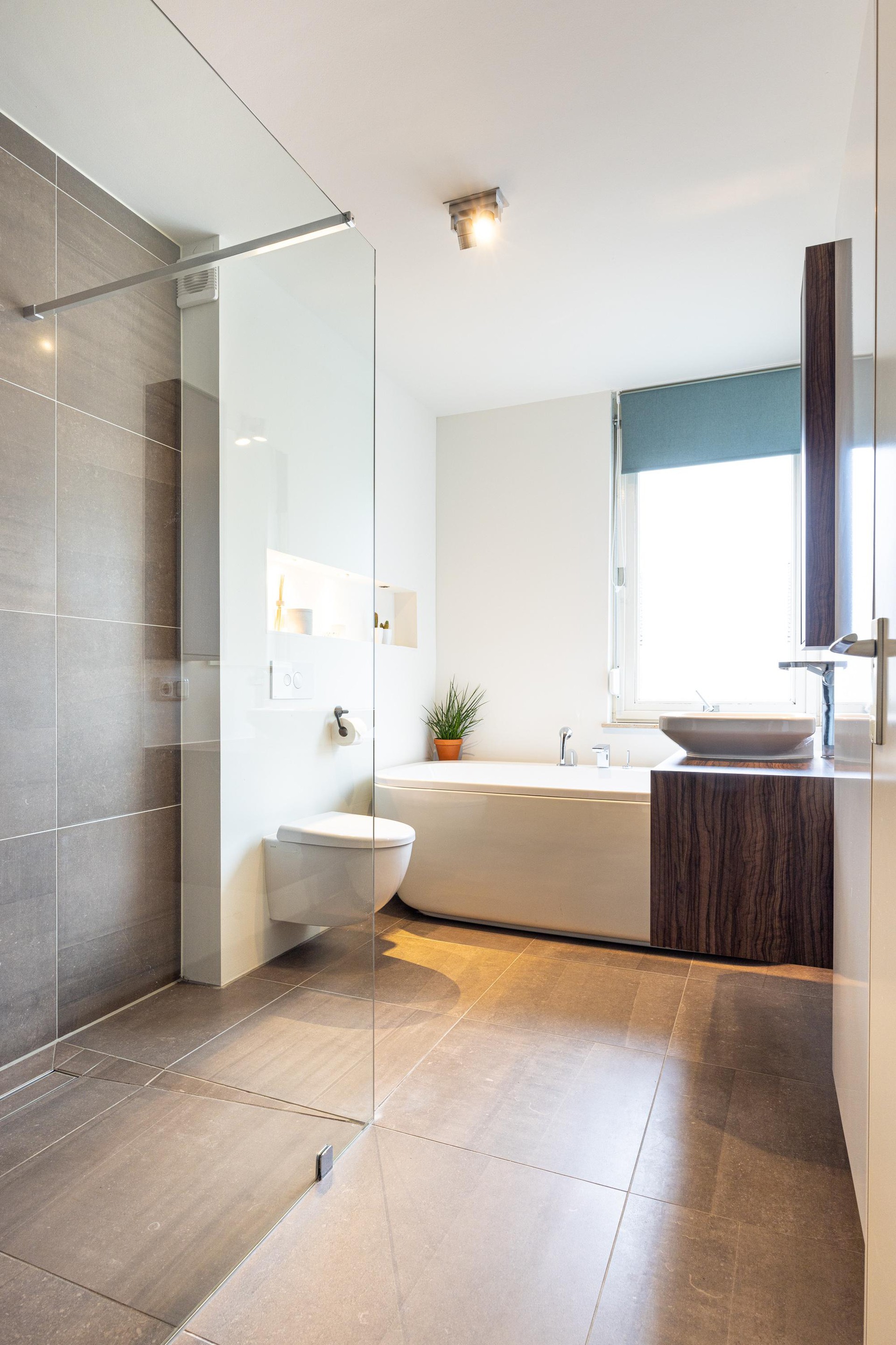 De stijlvolle badkamer combineert praktisch design met moderne elegantie. Voorzien van een ruime inloopdouche met een glazen wand, een vrijstaand bad, een tweede toilet en een badkamermeubel, compleet met een waskom en een spiegel voorzien van een warmfunctie die beslaan voorkomt (anti-condens). Een design radiator zorgt voor een aangename temperatuur en het rolluik biedt privacy wanneer gewenst.