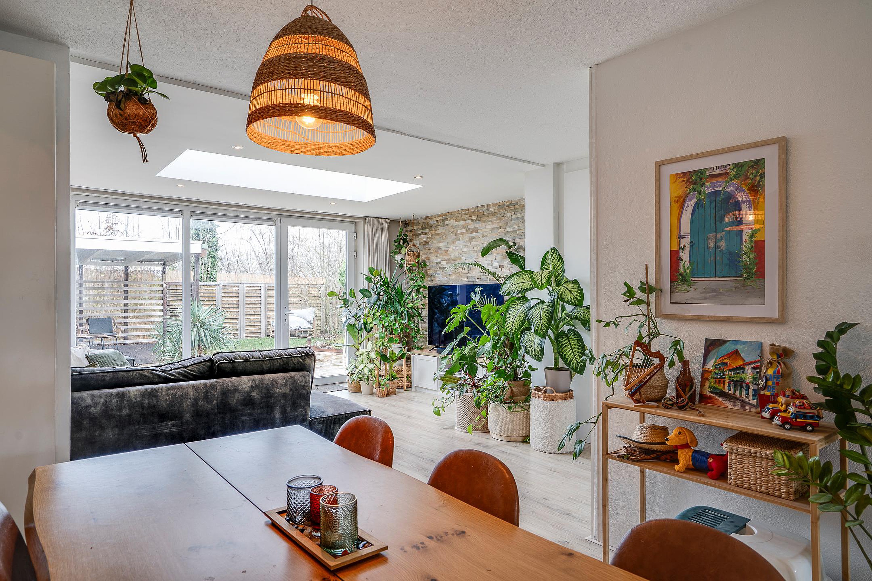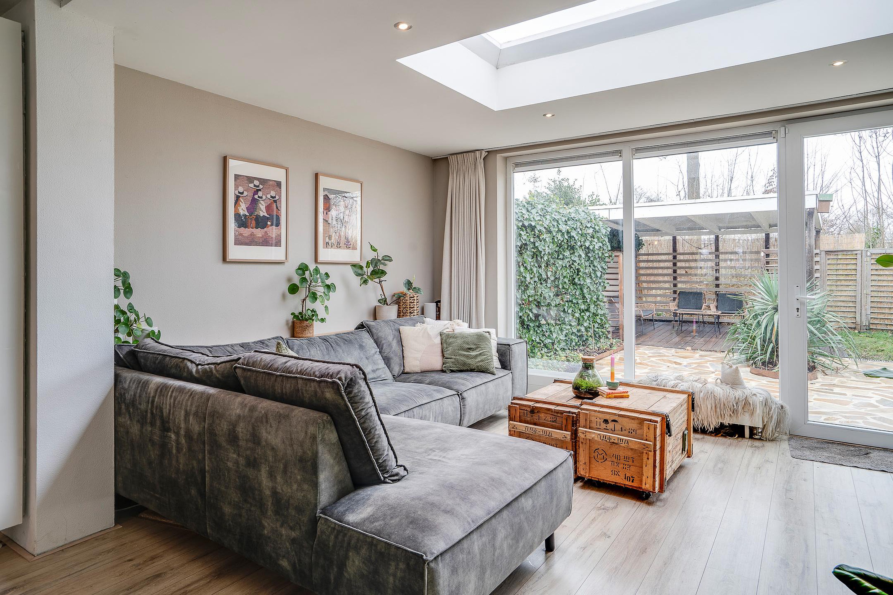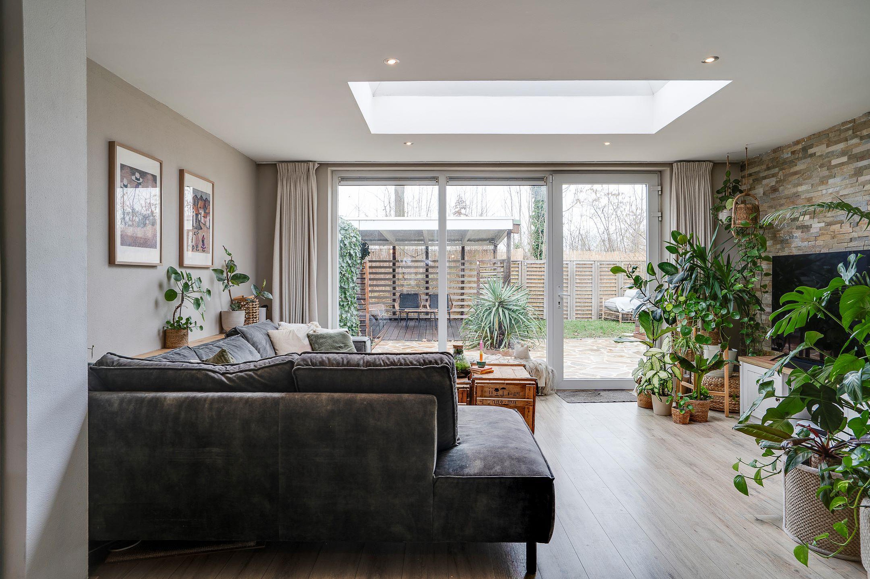 De living, gesitueerd in de in 2007 gerealiseerde aanbouw, straalt ruimte en licht uit dankzij de drempelloos doorlopende laminaatvloer, de lichtkoepel, de ramen aan de voorzijde en de volledig glazen achterpui met openslaande tuindeur. Zo geniet u niet alleen van een overvloed aan natuurlijk licht, maar ook van een directe verbinding met de prachtig aangelegde tuin.