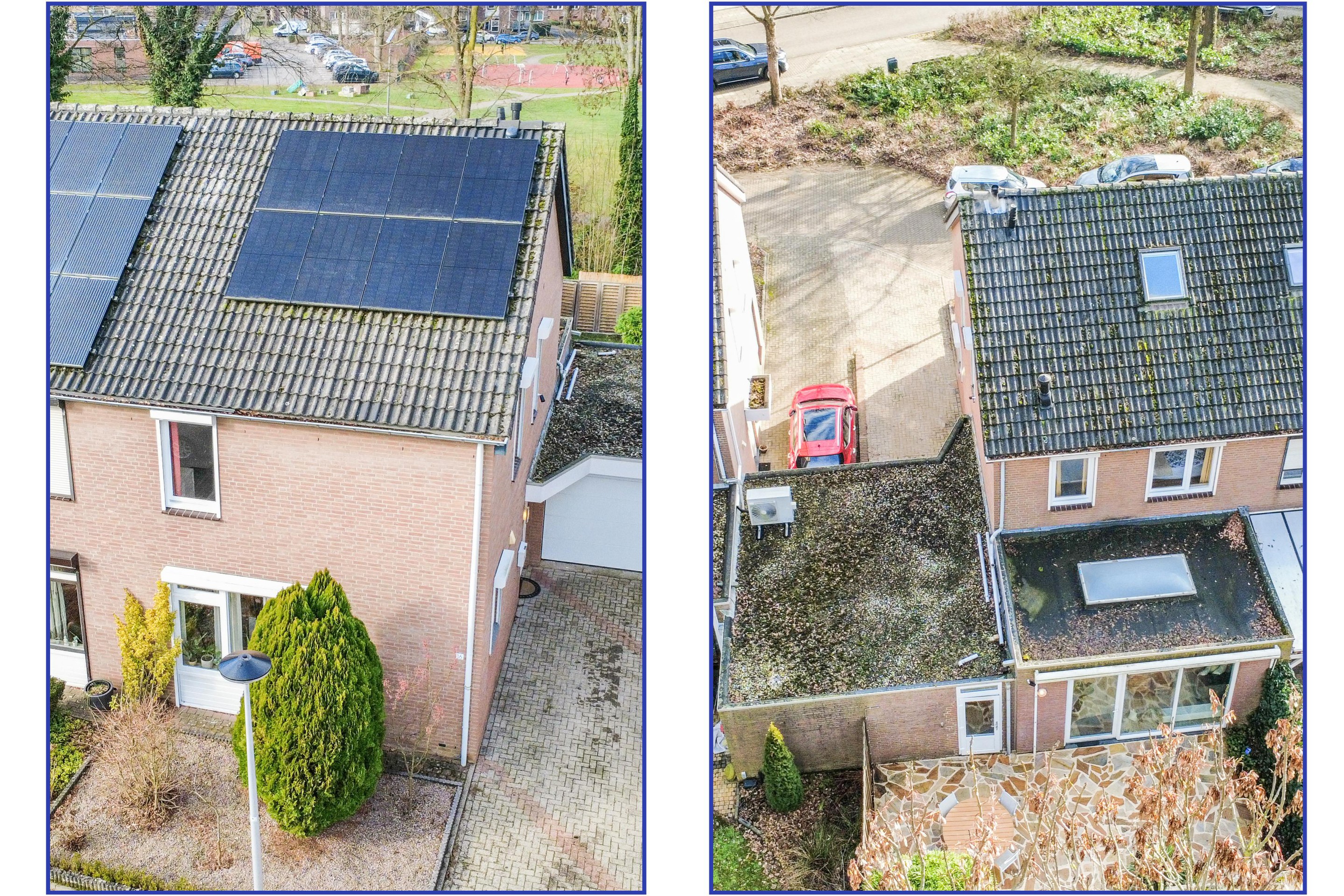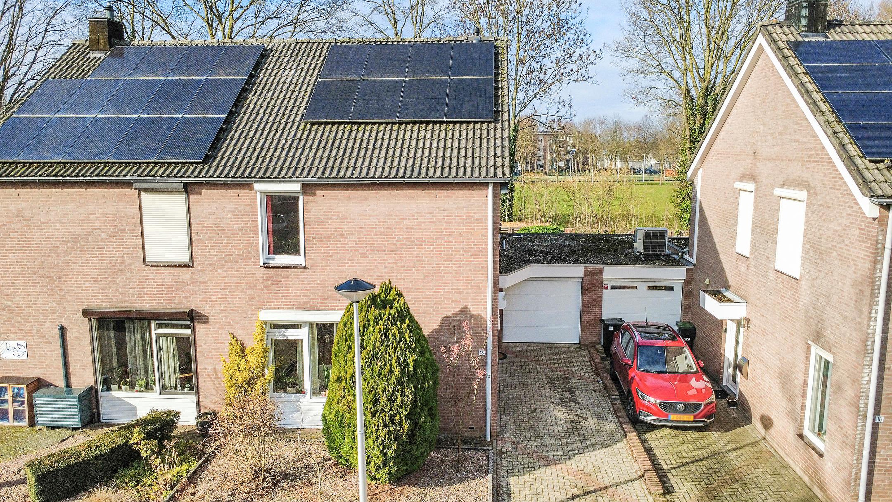Vanuit de tuin is er toegang tot de ruime garage, voorzien van elektra en een sectionaalpoort met afstandsbediening. Aan de voorzijde van de woning bevindt zich een eigen oprit met ruimte voor twee auto’s. Direct voor de tuin ligt een fraaie groenstrook die zorgt voor een vrij uitzicht, en dankzij de openbare parkeerplaatsen in de straat is er altijd voldoende parkeergelegenheid voor gasten.