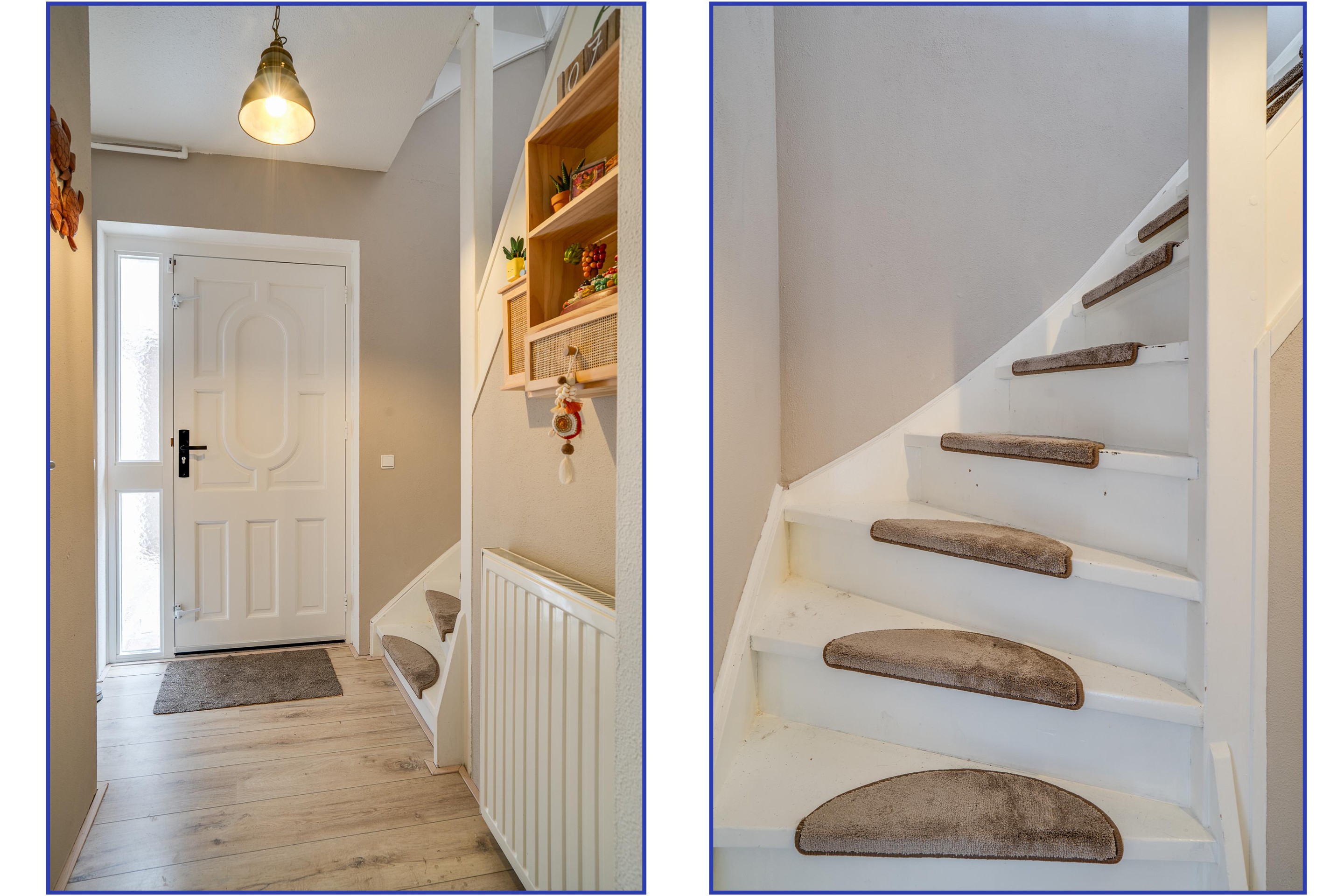 Via de nette entree aan de zijkant van de woning, waar je een moderne meterkast, de opgang naar de 1e verdieping, een stijlvol toilet met fonteintje en volledig betegelde wanden vindt, betreed je de ruime, uitgebouwde woonkamer met leefkeuken. De entree is afgewerkt met een prachtige, drempelloos gelegde laminaatvloer die voor een mooie, strakke uitstraling zorgt.