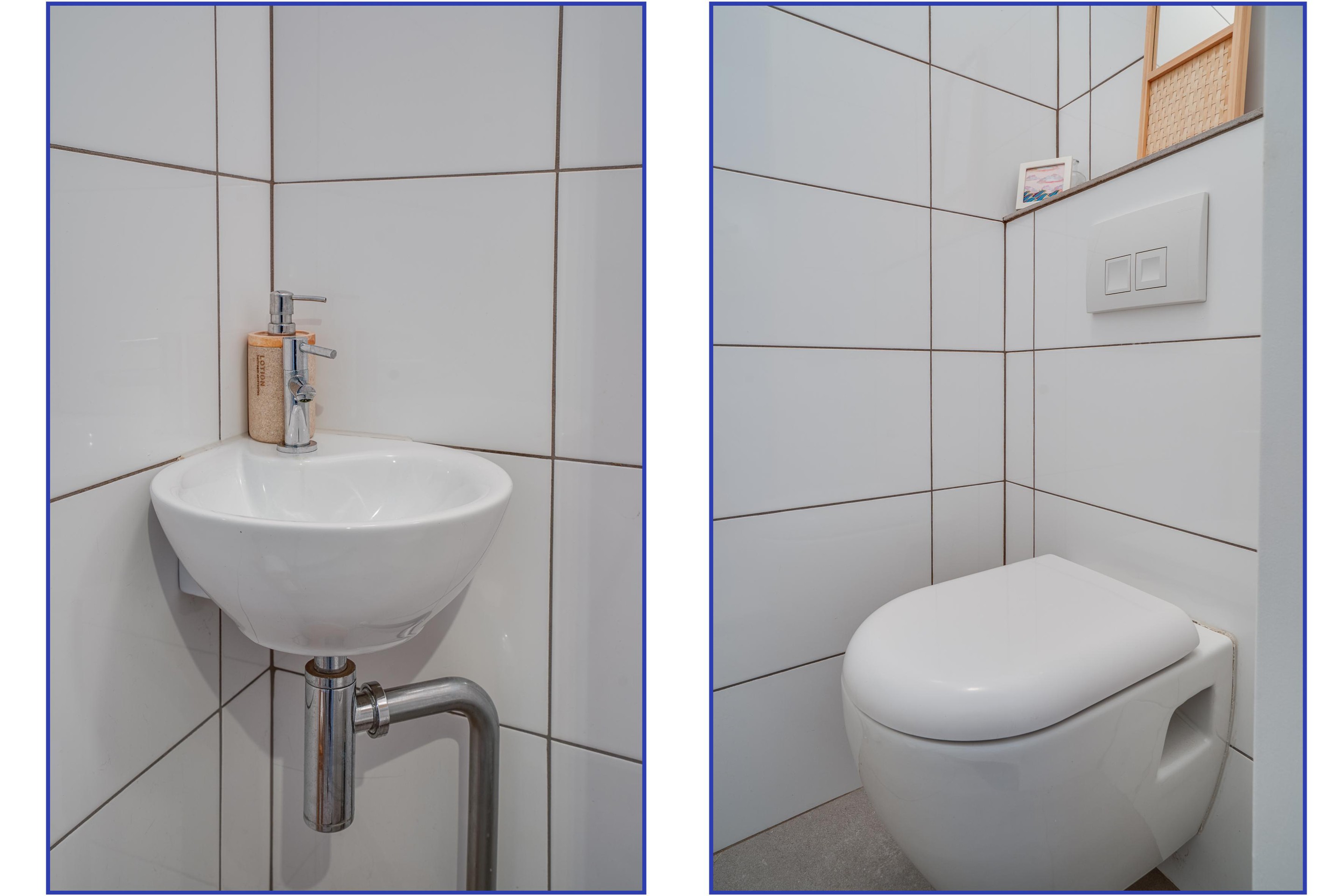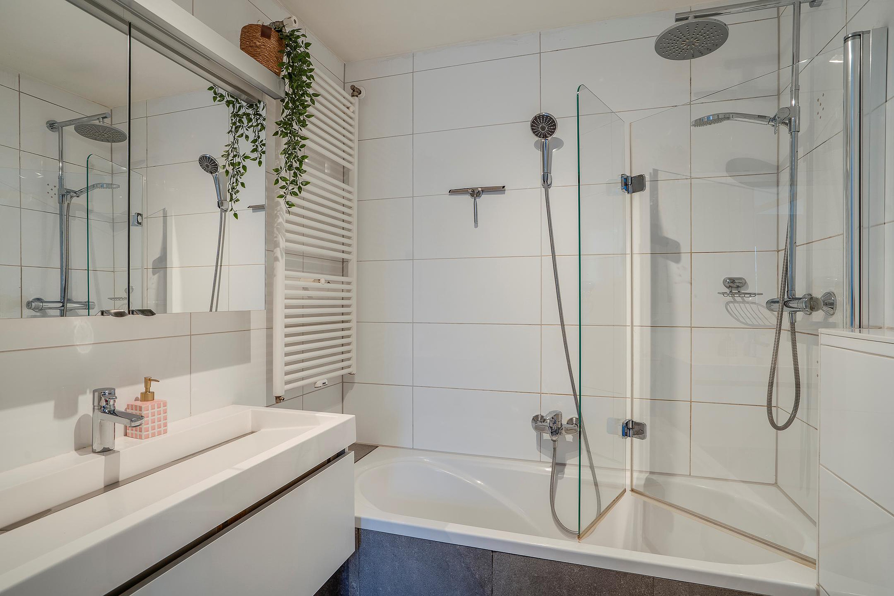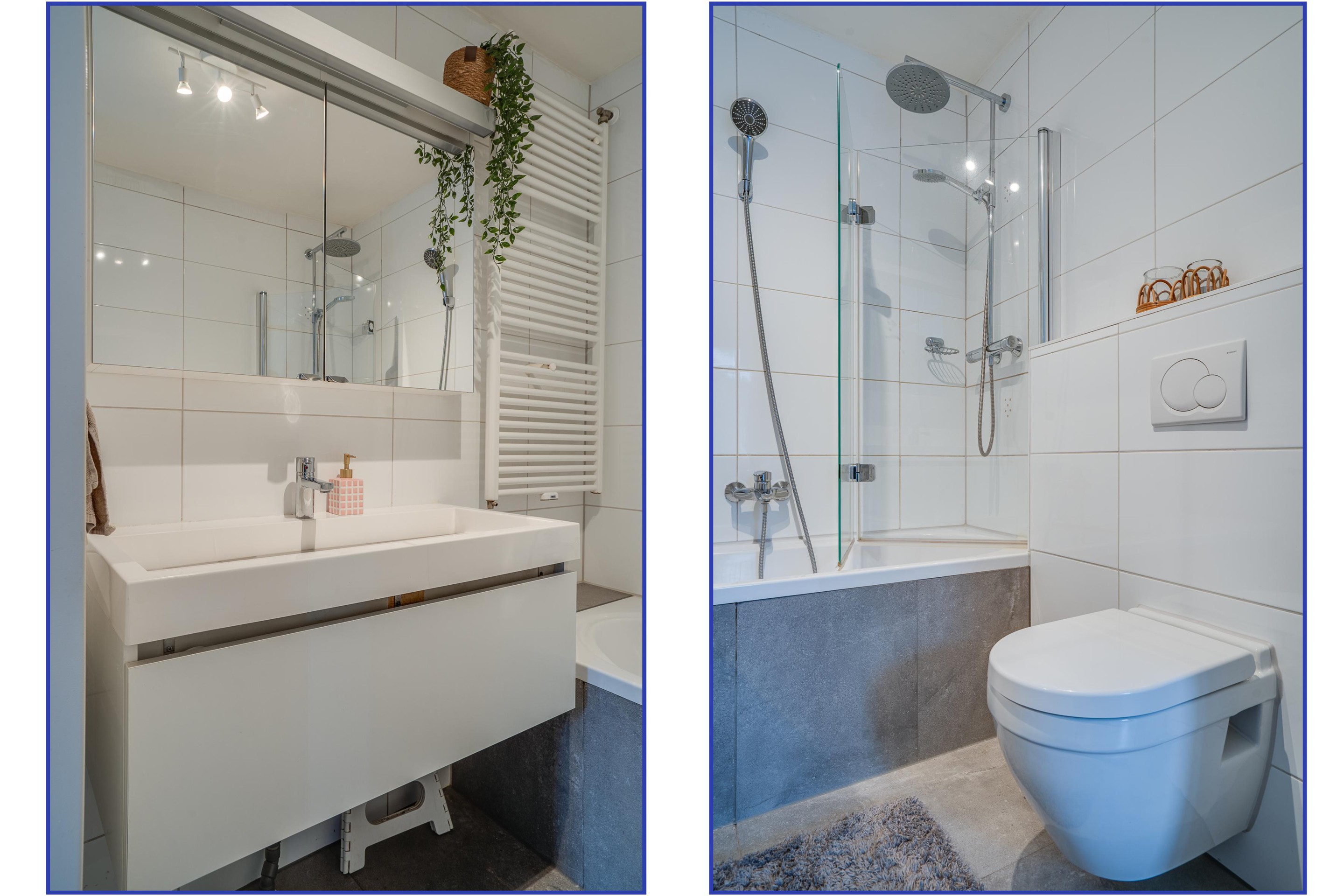 De verzorgde badkamer is volledig betegeld en uitgerust met een ligbad-/douchecombinatie, een wastafelmeubel, een designradiator en een tweede toilet.