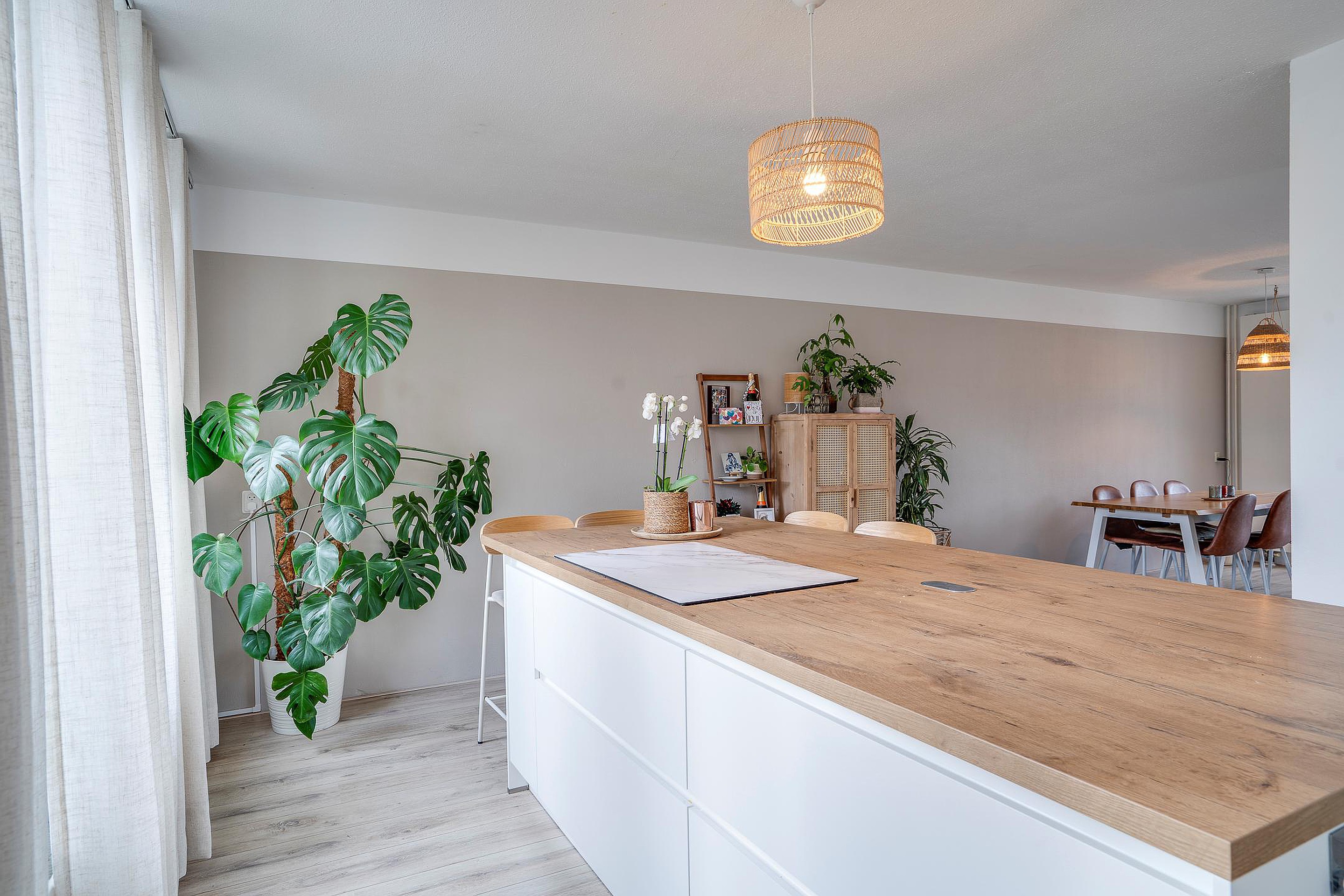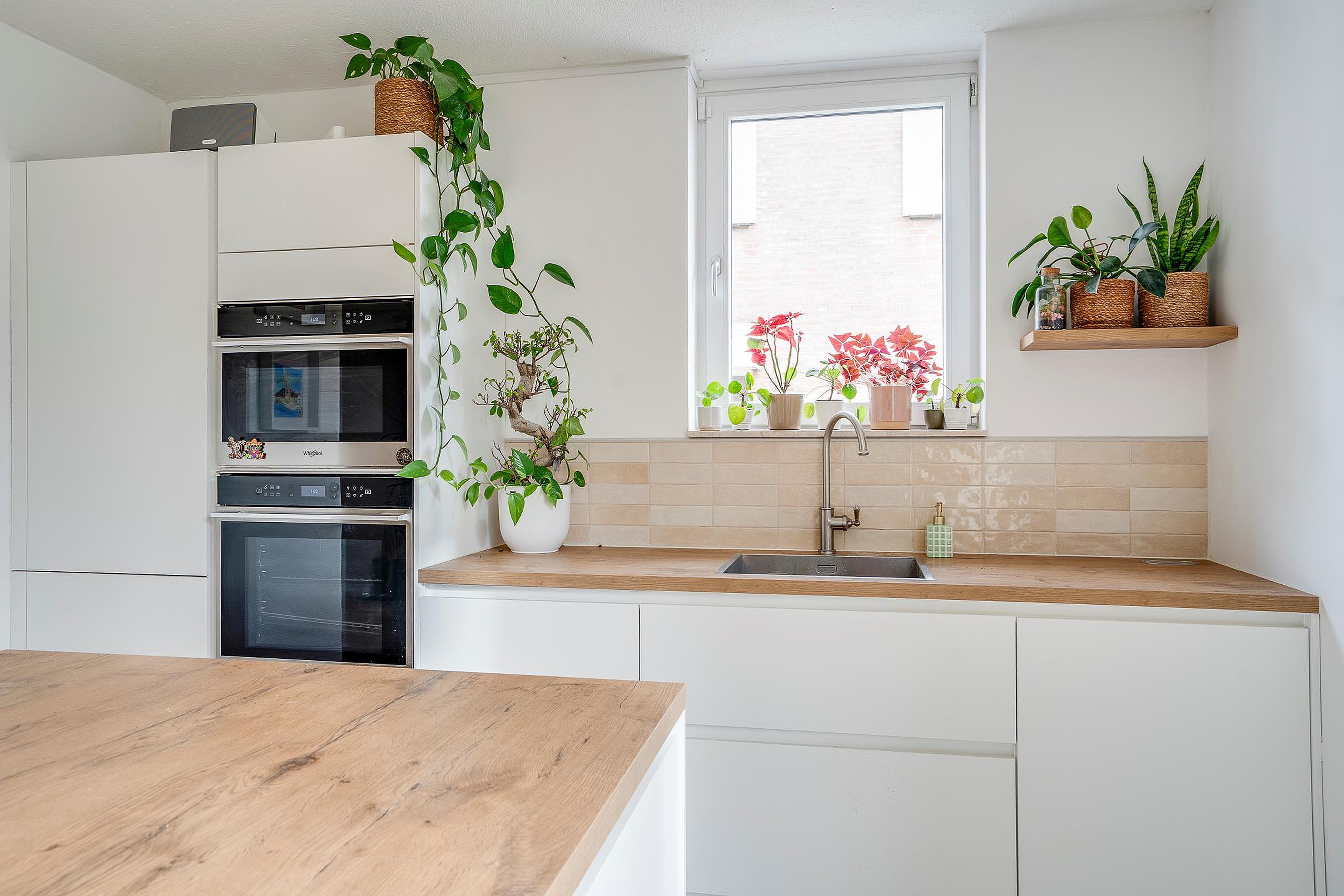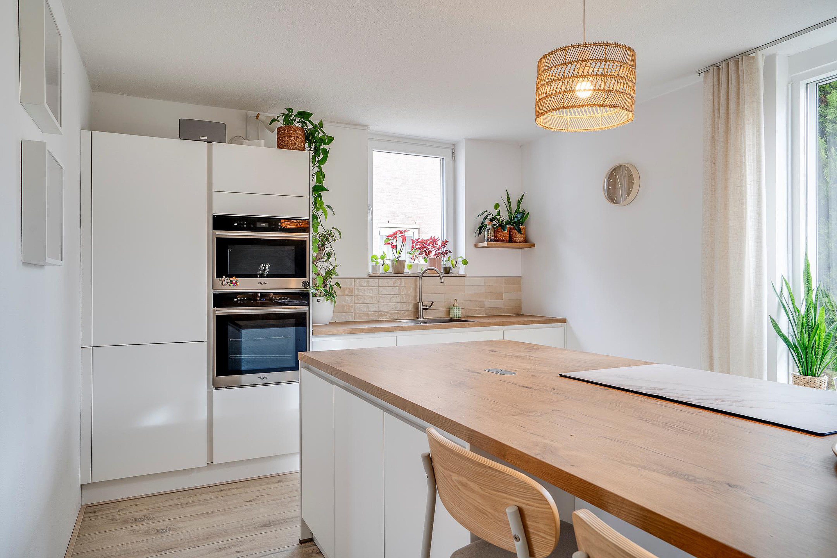 De open keuken, aan de voorzijde van de woning, vormt samen met de eetkamer het hart van het huis. Deze ruimte verbindt op elegante wijze keuken, woonkamer en tuin en is in 2022 volledig vernieuwd met hoogwaardige A-merk apparatuur. Het kookeiland met 4-pits inductiekookplaat en ingebouwde afzuiging, de combimagnetron, oven, koel-vriescombinatie en vaatwasser maken koken hier tot een genot. Een handige kast naast de keuken biedt extra bergruimte.