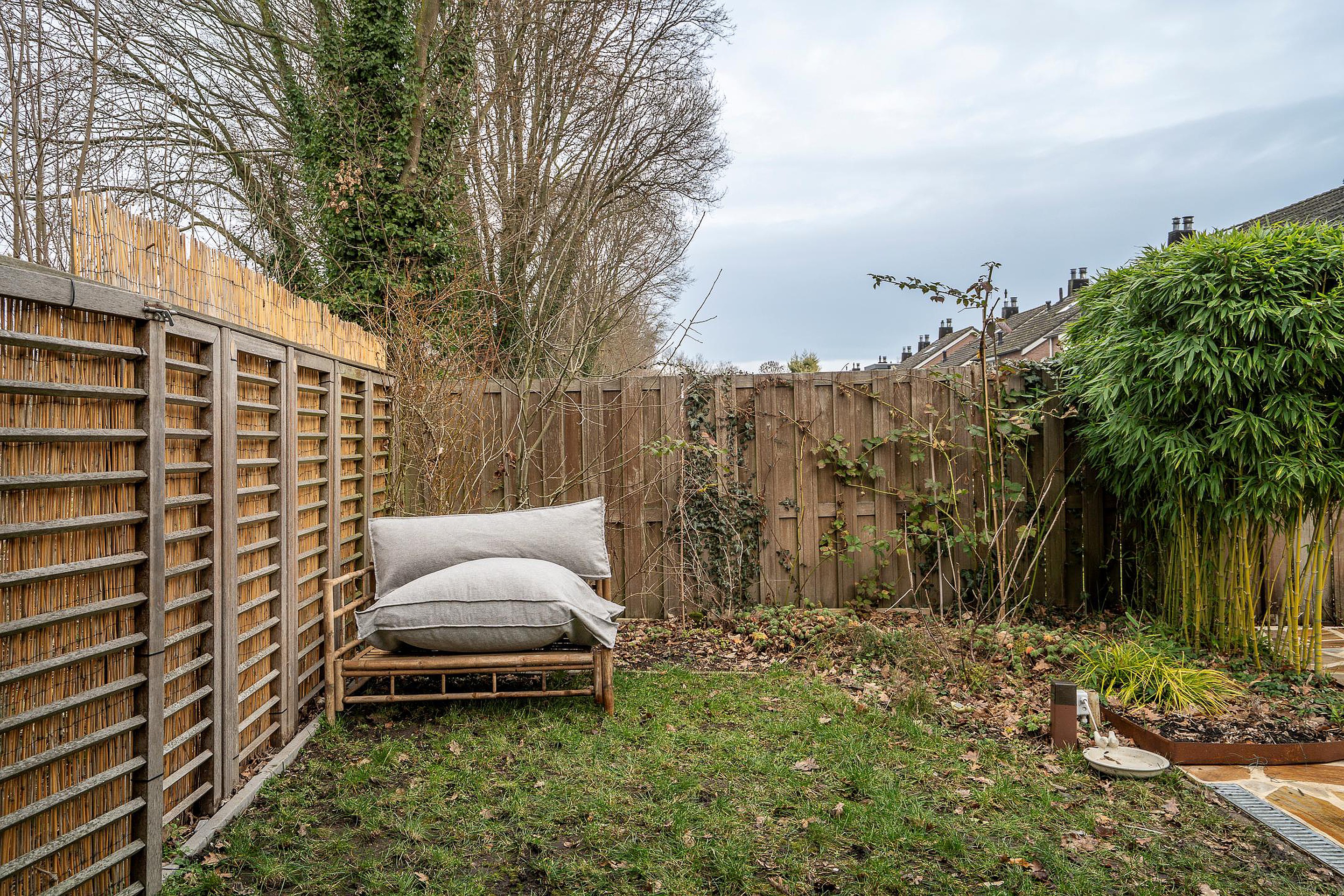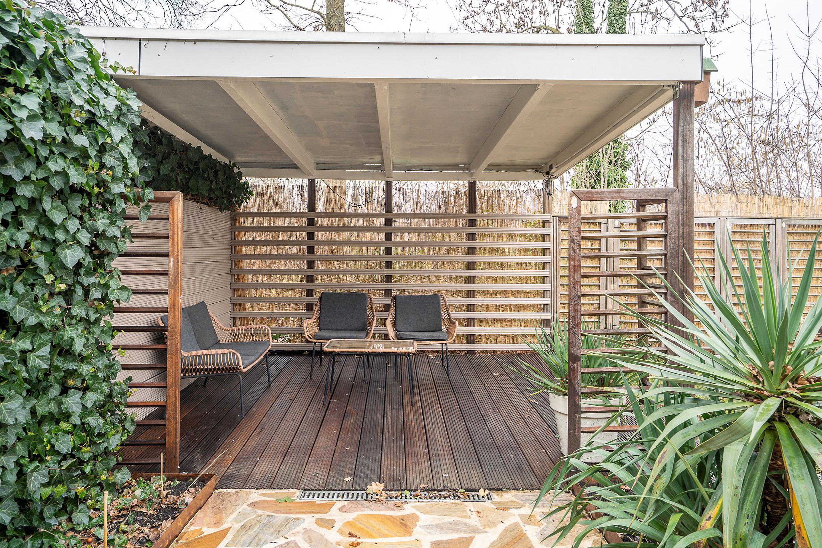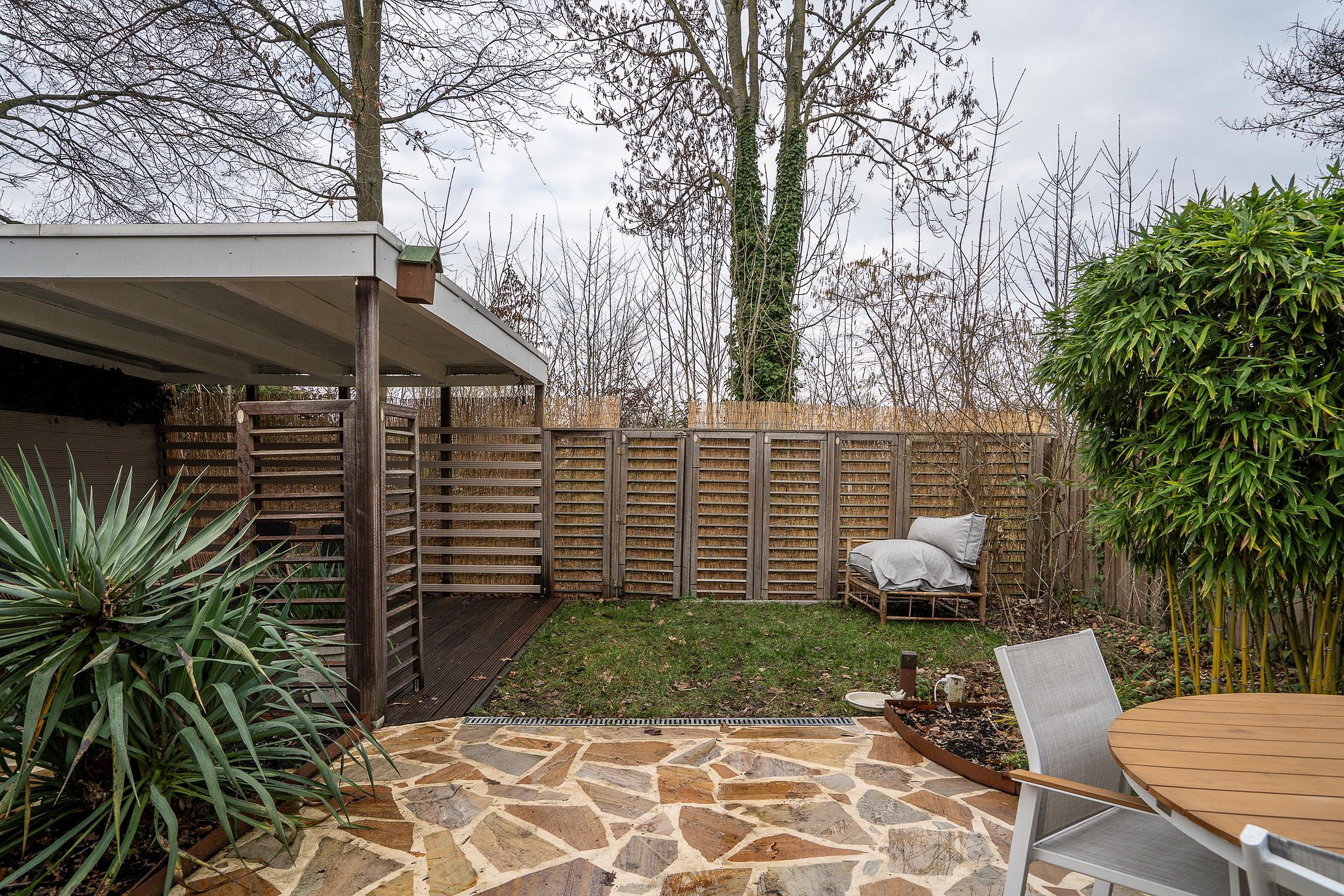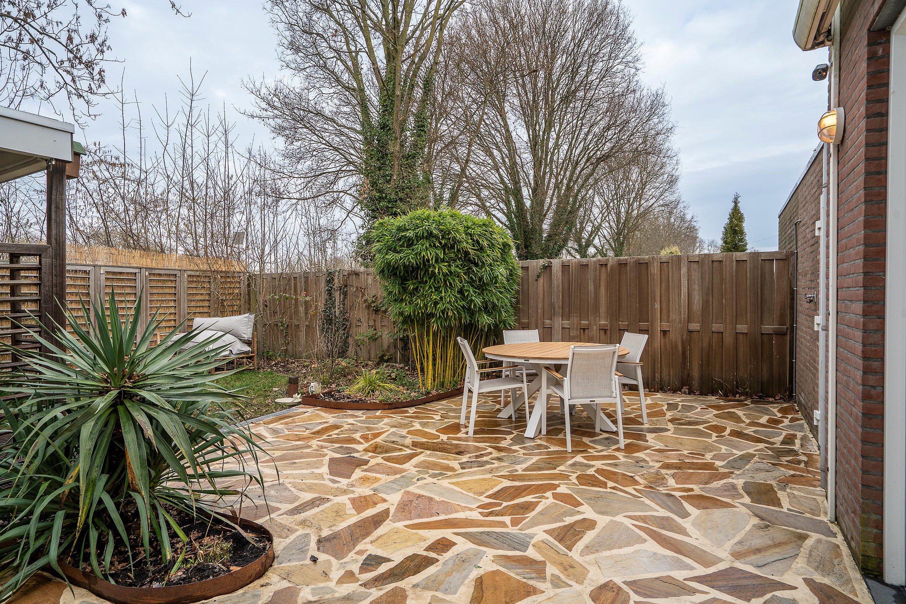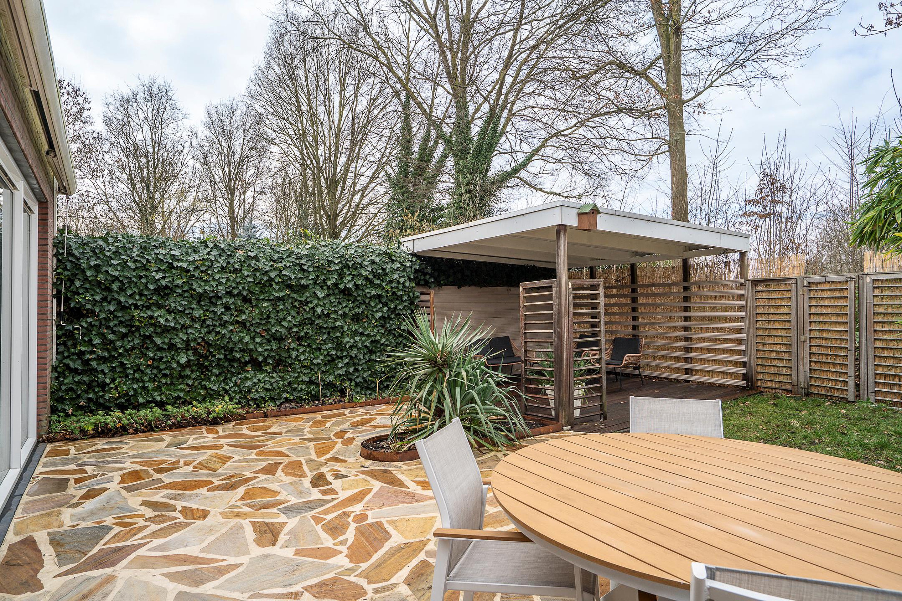 De achtertuin, gelegen op het noordoosten, biedt volop privacy dankzij het ontbreken van achterburen. Onder de open pergola geniet je het hele jaar door van het buitenleven, van lange zomerse avonden tot gezellige herfstmiddagen. De tuin is onderhoudsvriendelijk aangelegd, met een terras van flagstone-tegels en een verzorgd gazon.