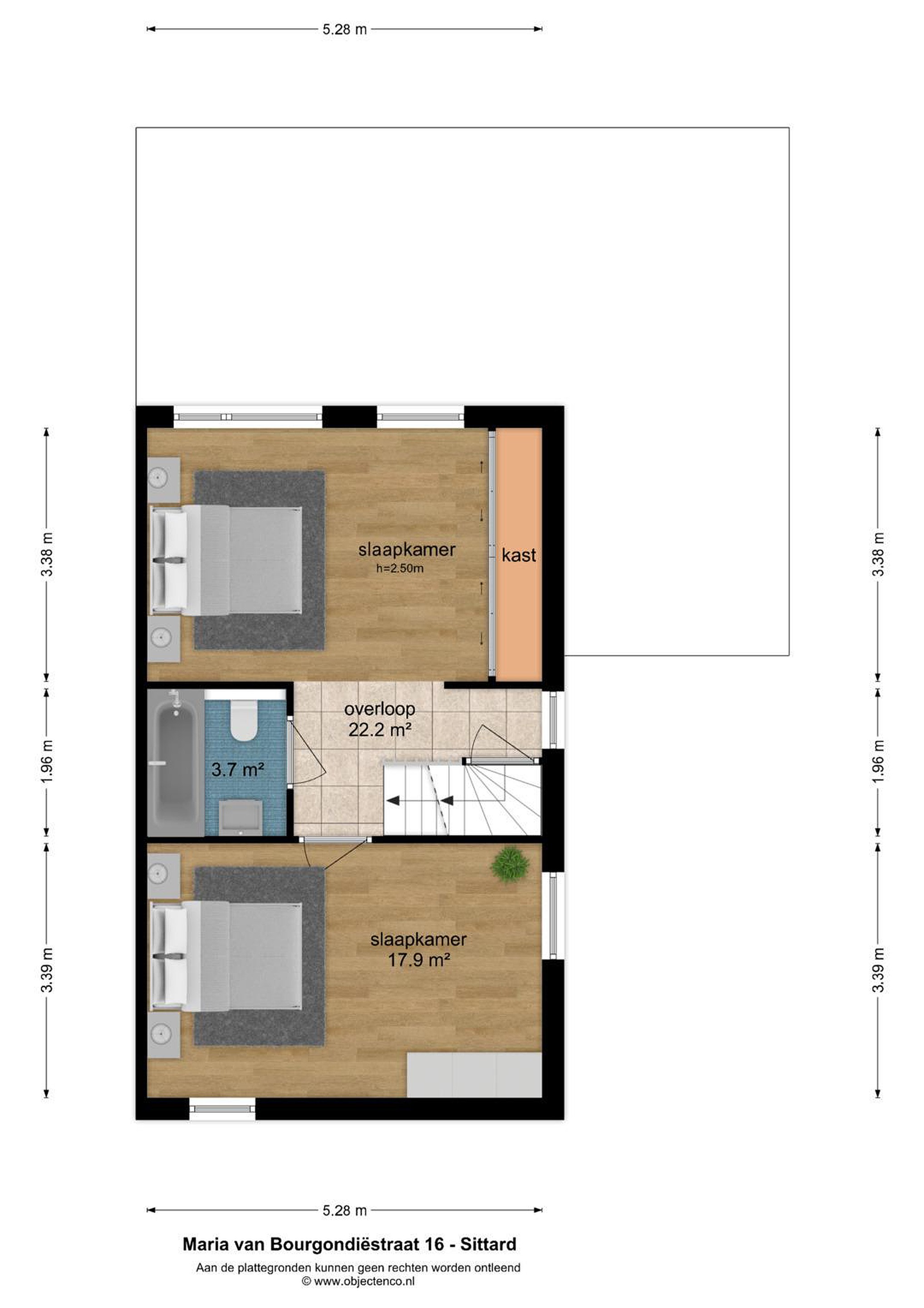 De tweede slaapkamer is eveneens royaal, met een oppervlakte van 18 m2, en beide kamers zijn voorzien van rolluiken, wat bijdraagt aan extra comfort en privacy.