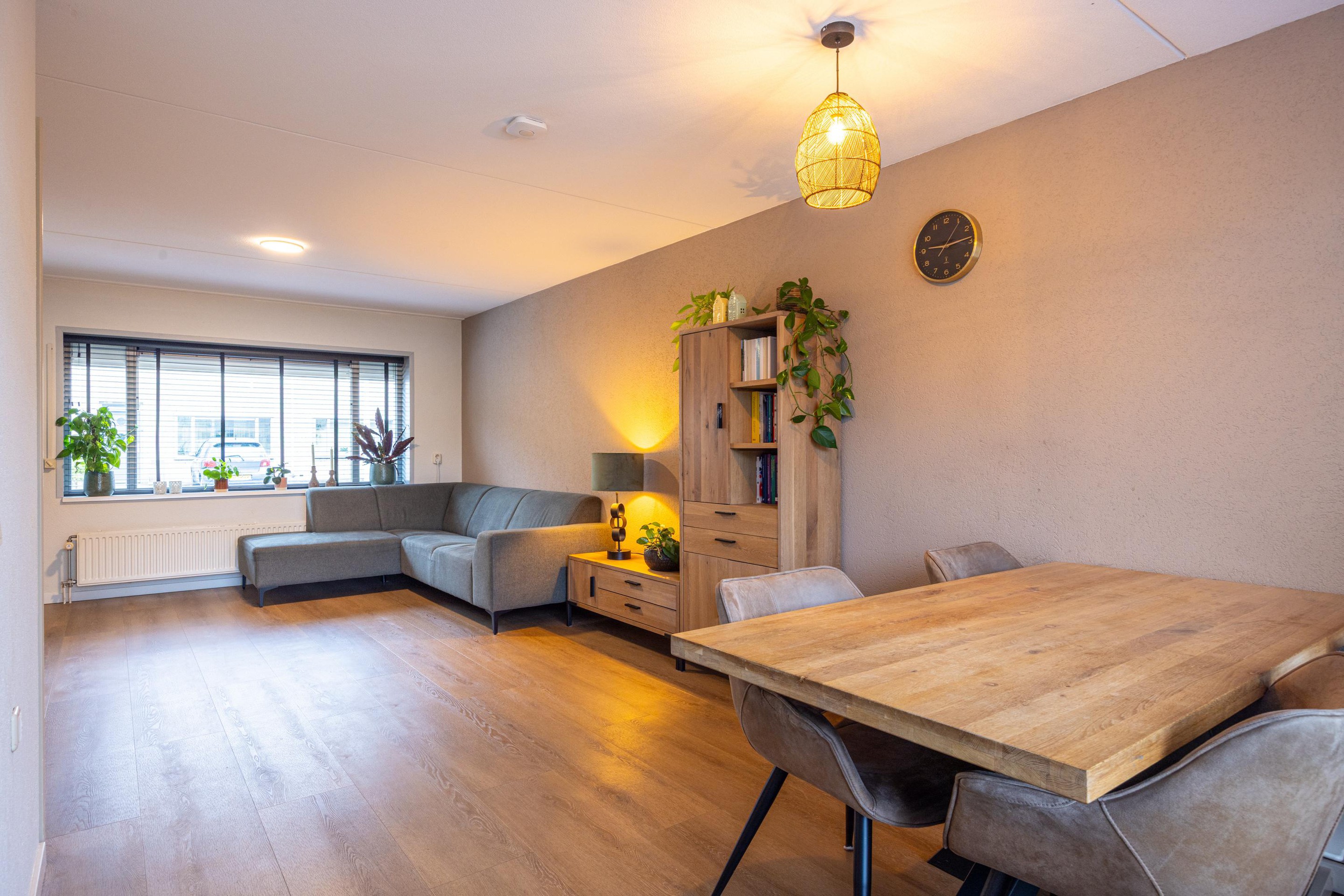 De ontvangsthal is voorzien van een tegelvloer, garderobe en meterkast. Vanuit hier loopt u door naar de doorzon woonkamer, die dankzij de grote ramen geniet van veel daglicht. De pvc-vloer en de strakke afwerking zorgen voor een warme uitstraling. Aan de voorzijde is een rolluik geplaatst en via de woonkamer is er toegang tot de achtertuin. De trapopgang is netjes afgesloten met een deur.
