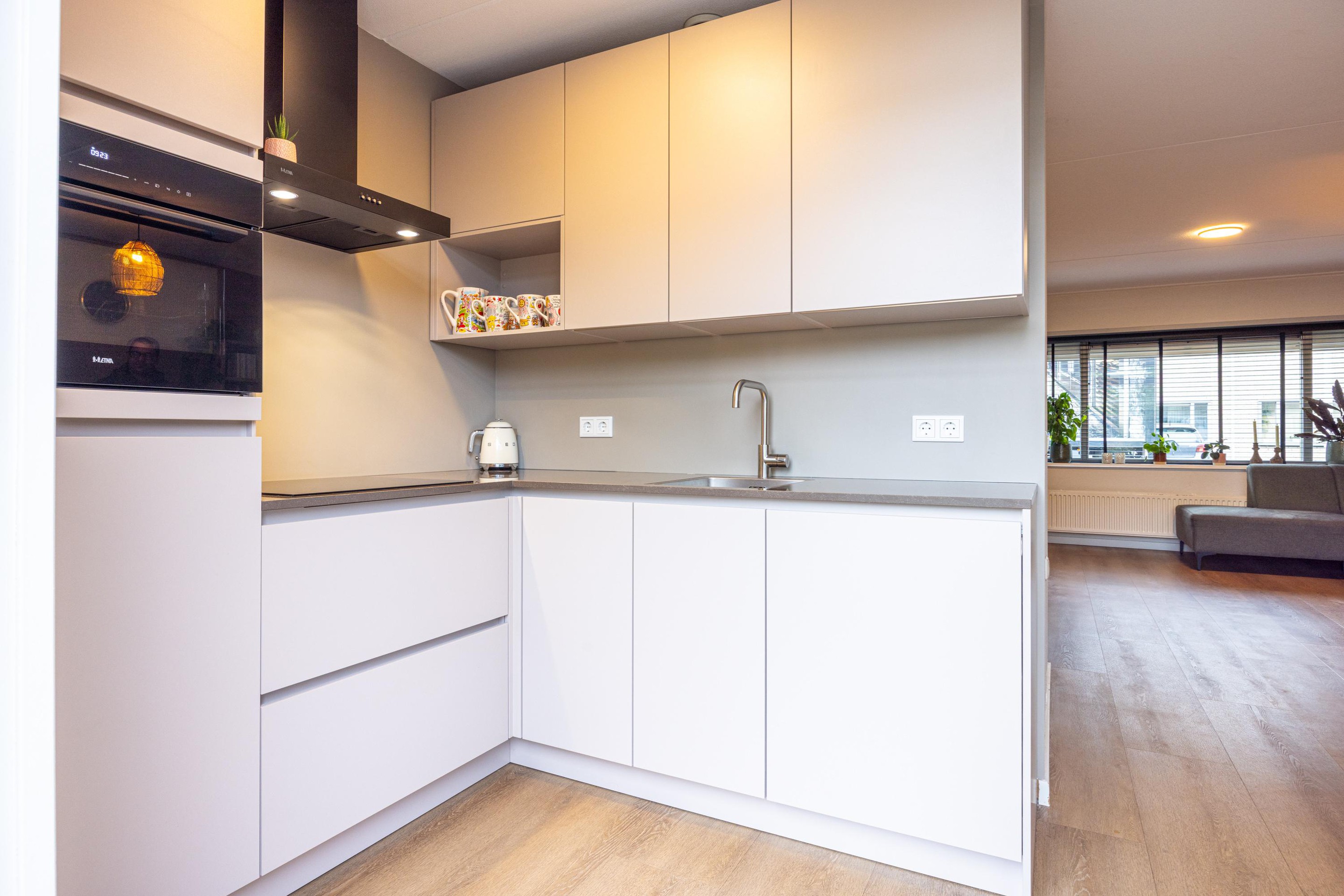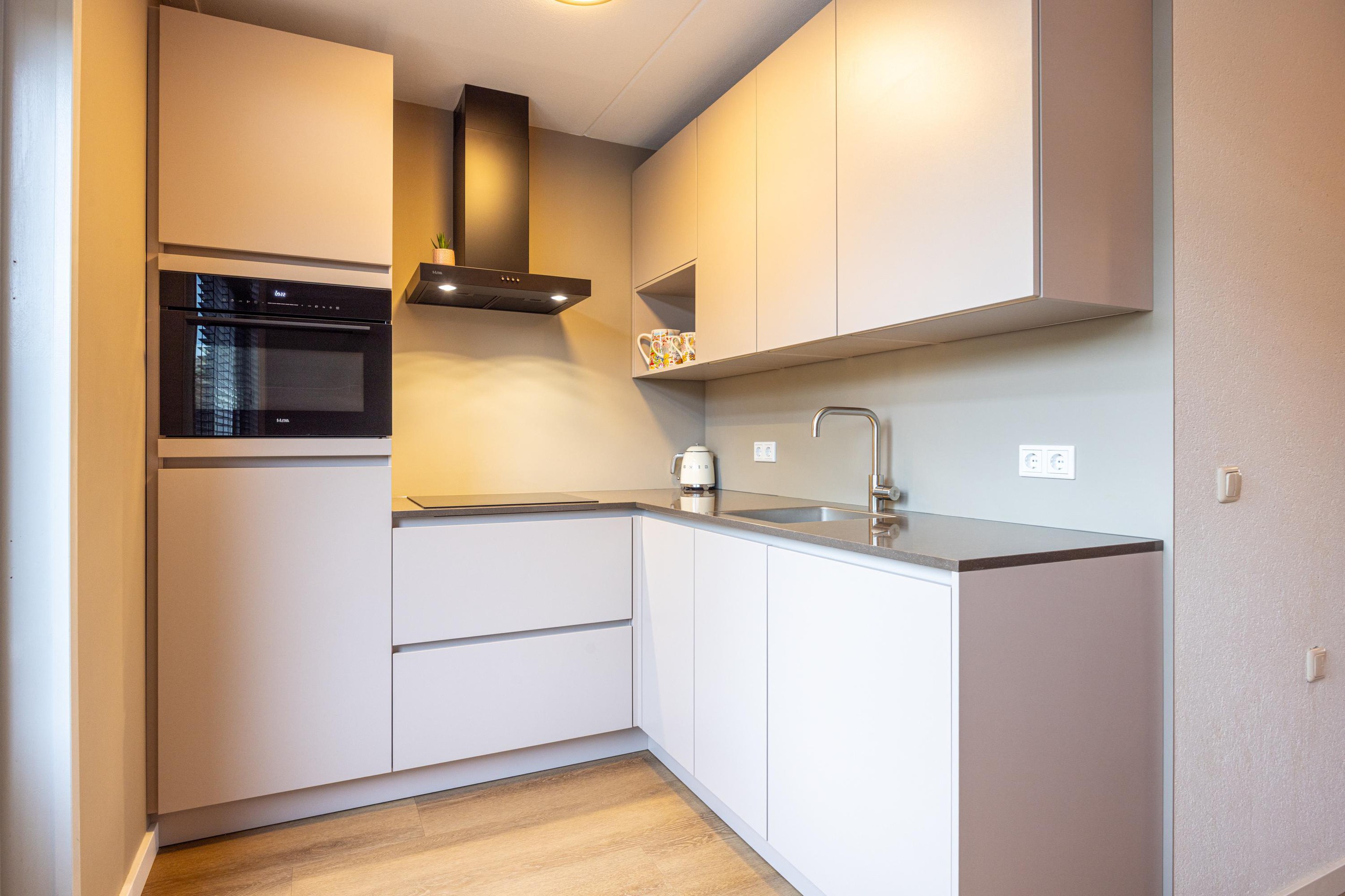 De open keuken (2024) sluit prachtig aan op de stijl van de woonkamer en is voorzien van dezelfde pvc-vloer. De keuken is modern uitgevoerd, beschikt over veel kastruimte en is uitgerust met inbouwapparatuur: inductiekookplaat, afzuigkap, combi-heteluchtoven, koelkast en vaatwasser.