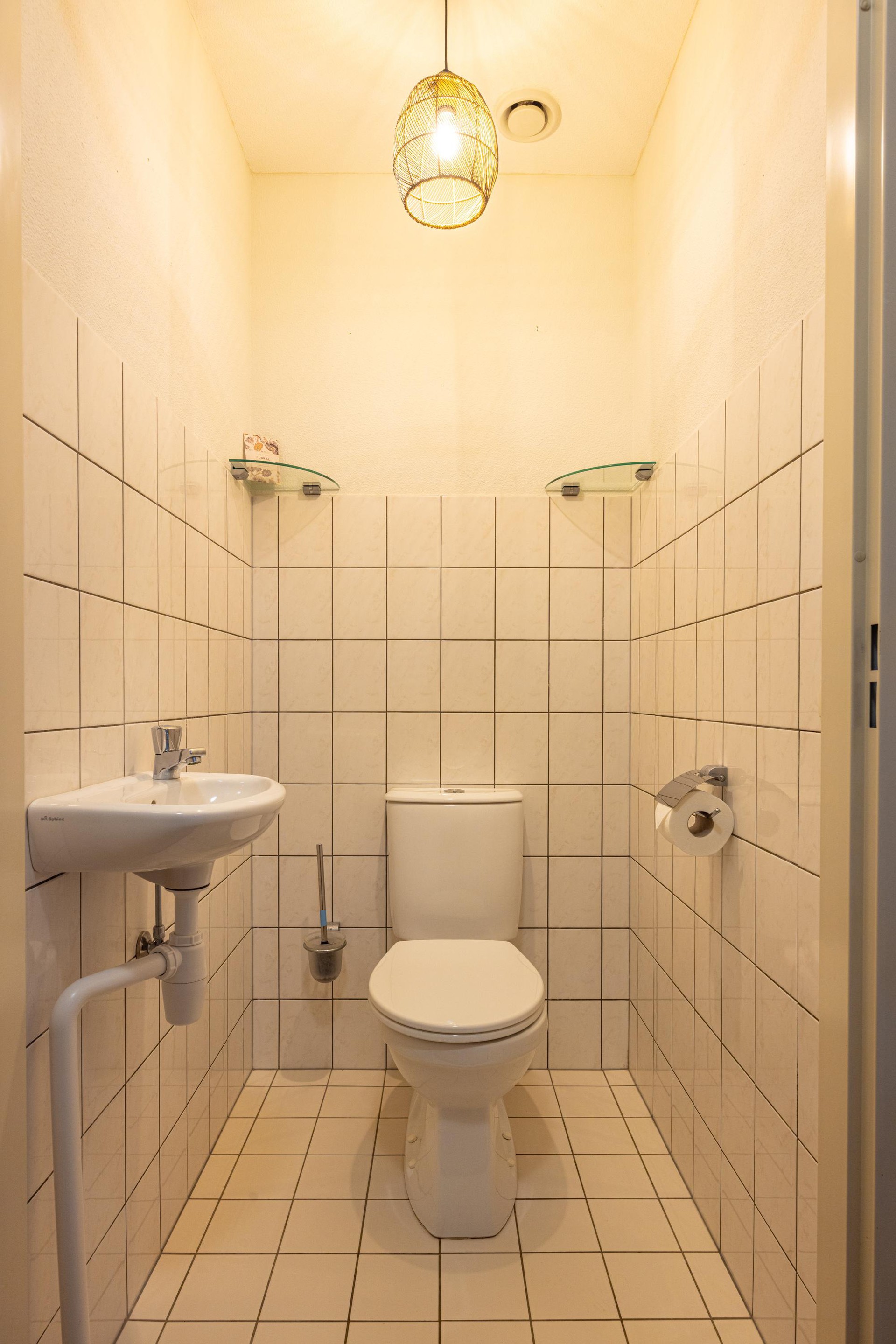 Aan de woonkamer grenst een tussenportaal met toegang tot het toilet, uitgerust met staand closet en fonteintje.