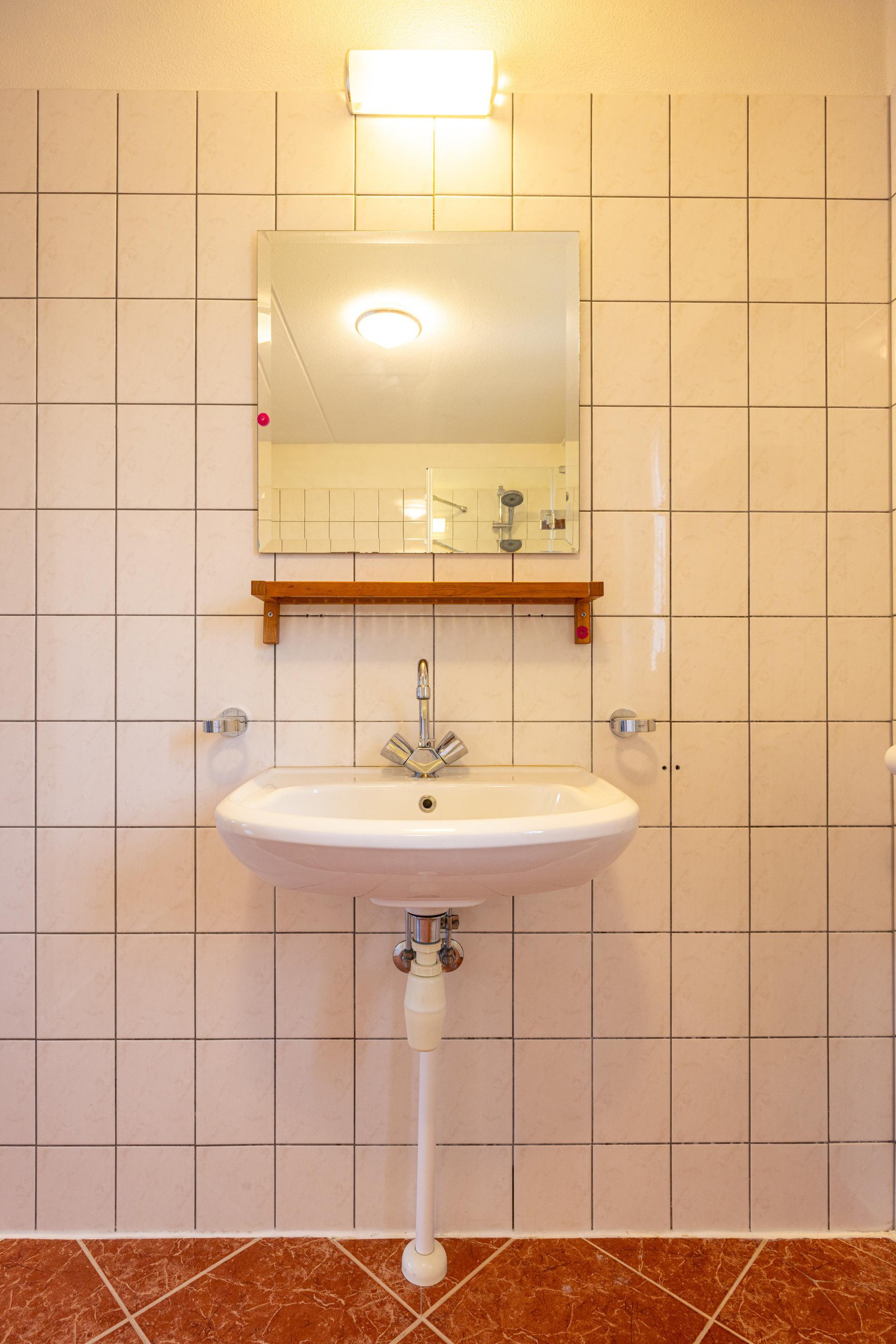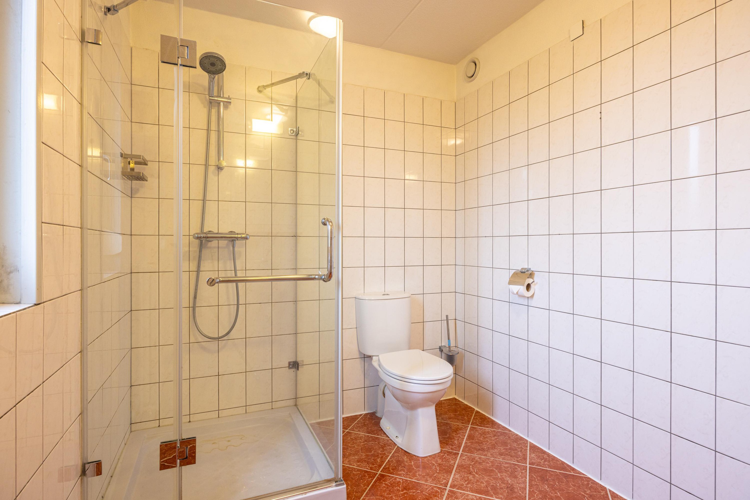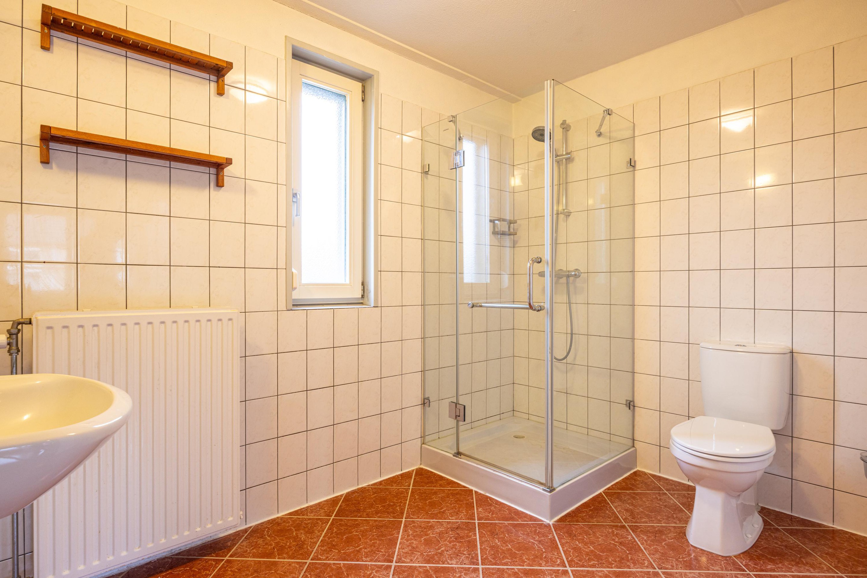De badkamer is compleet en praktisch ingedeeld met een douchecabine met glazen wand en deur, een tweede toilet, een wastafel met spiegel en een raam met rolluik.