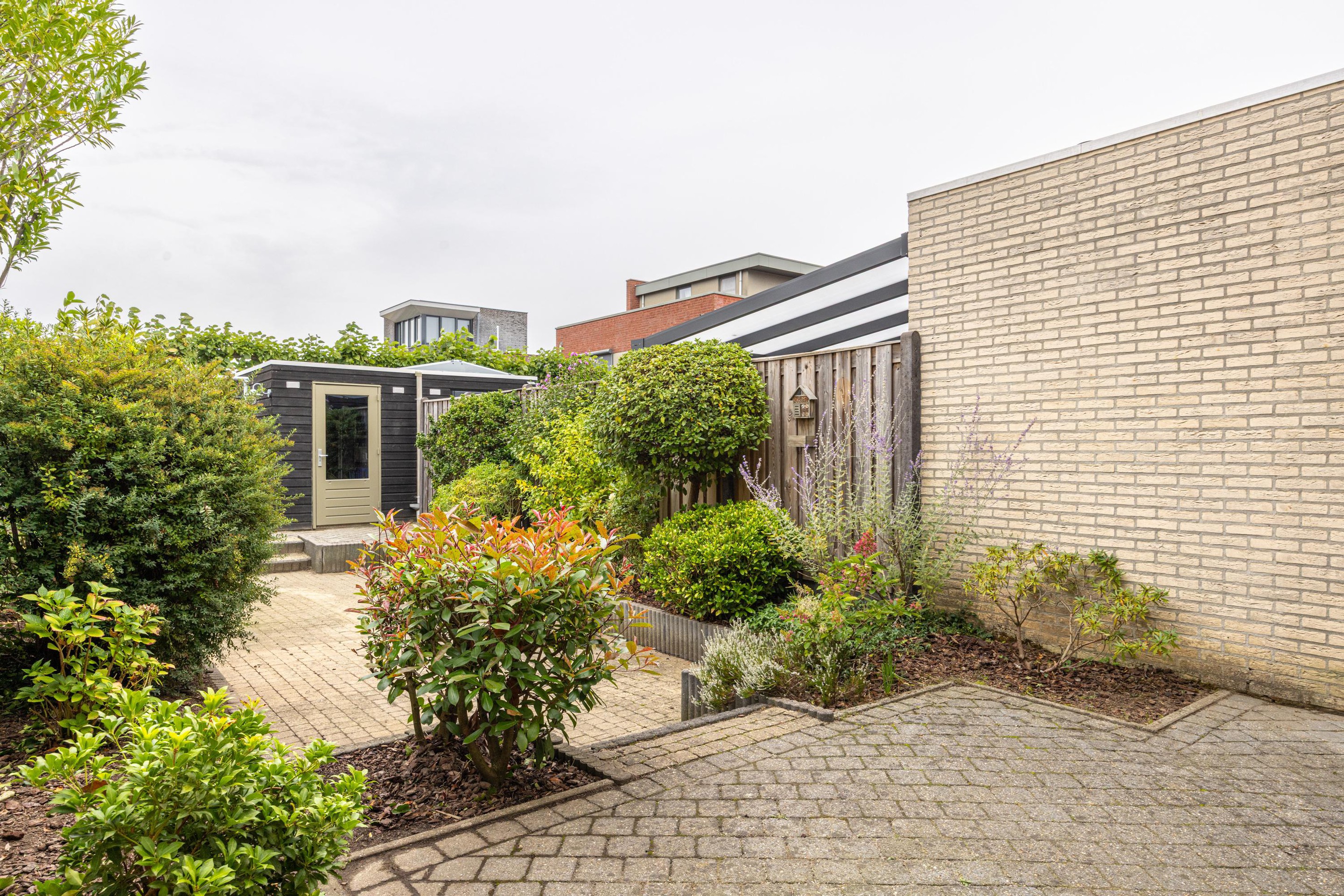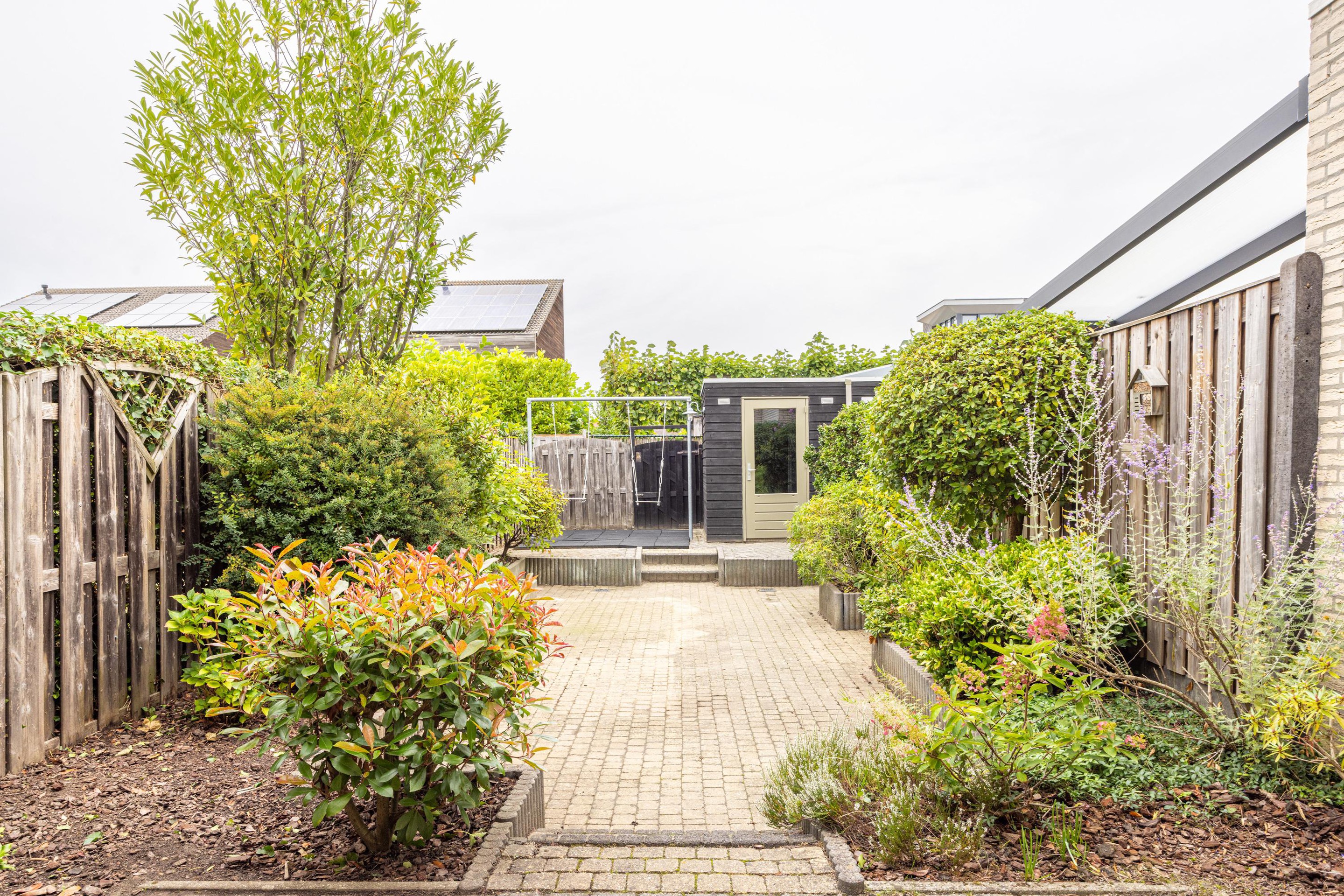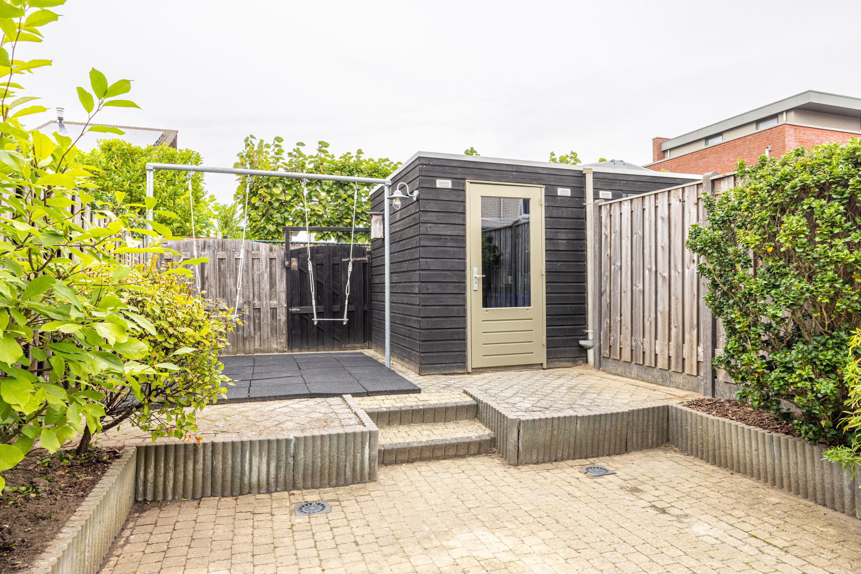 Tuin De achtertuin is netjes onderhouden en verzorgd met een combinatie van bestrating en groene borders. Er zijn meerdere zitplekken gecreëerd, waardoor u zowel van de zon als de schaduw kunt genieten. Achterin bevindt zich een ruime houten schuur met elektra en verlichting, ideaal voor fietsen, opslag of hobby’s. Via de praktische achterom is de tuin ook gemakkelijk bereikbaar.