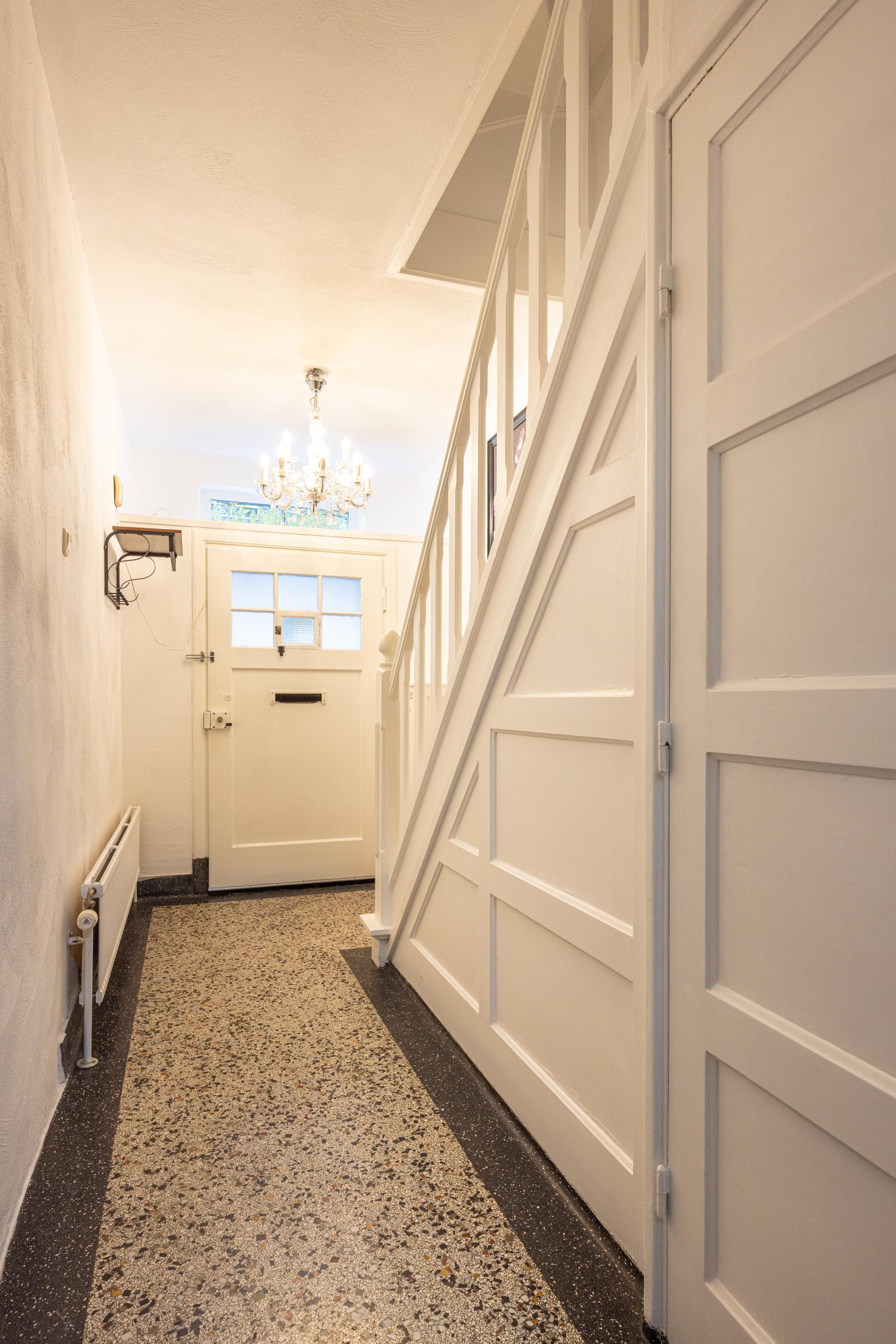 Begane grond Bij aankomst parkeer je op de eigen oprit, met directe toegang tot de inpandige garage. Via de voordeur kom je binnen in de hal met een fraaie terrazzo vloer. Vanuit hier bereik je de woonkamer, de trap naar boven, de werkkamer en de kelder.