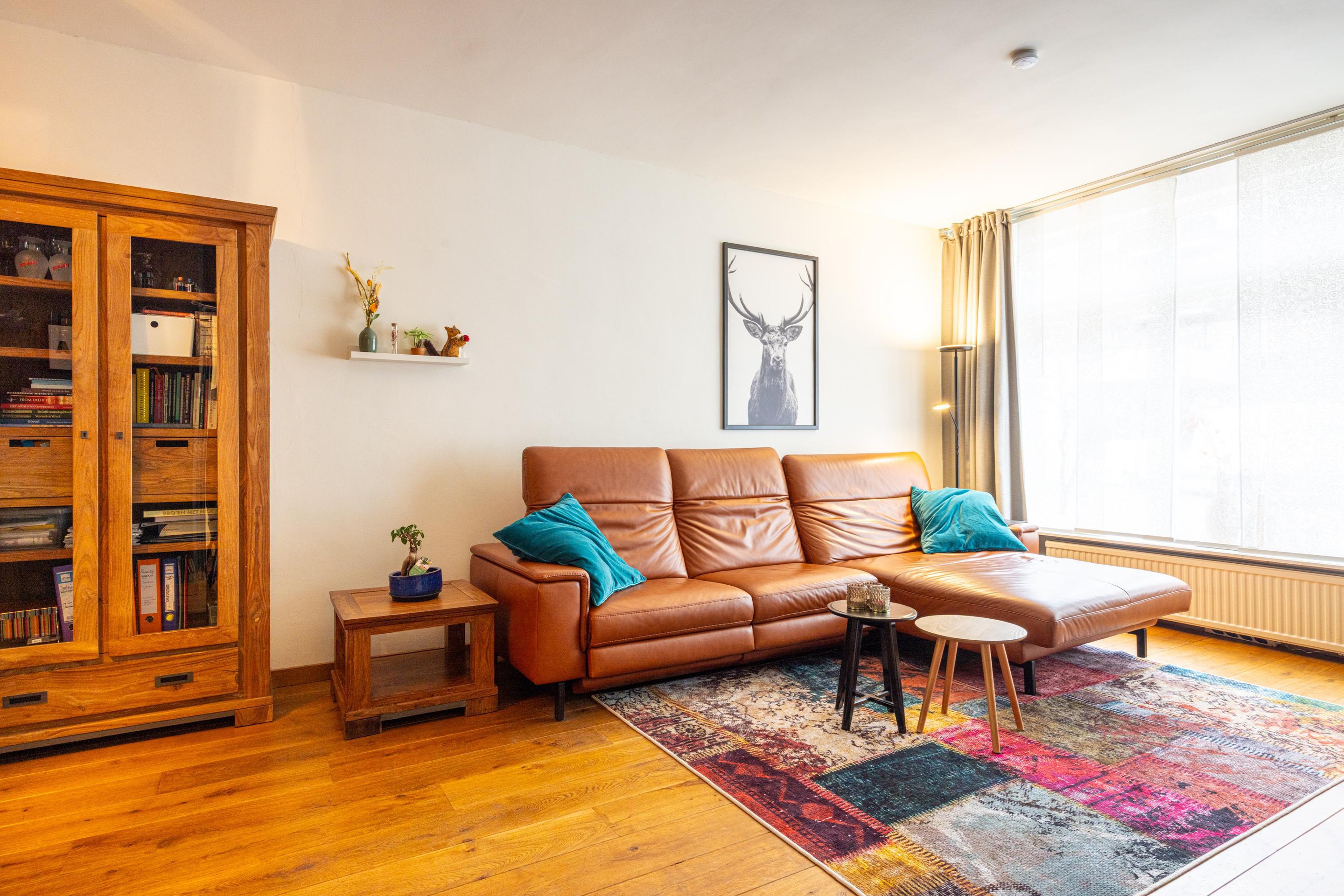 De woonkamer heeft een warme uitstraling dankzij de parketvloer en het vele daglicht. Vanuit de zithoek is er een directe doorgang naar de werkkamer, handig voor thuiswerk, studeren of als speelkamer voor de kinderen.