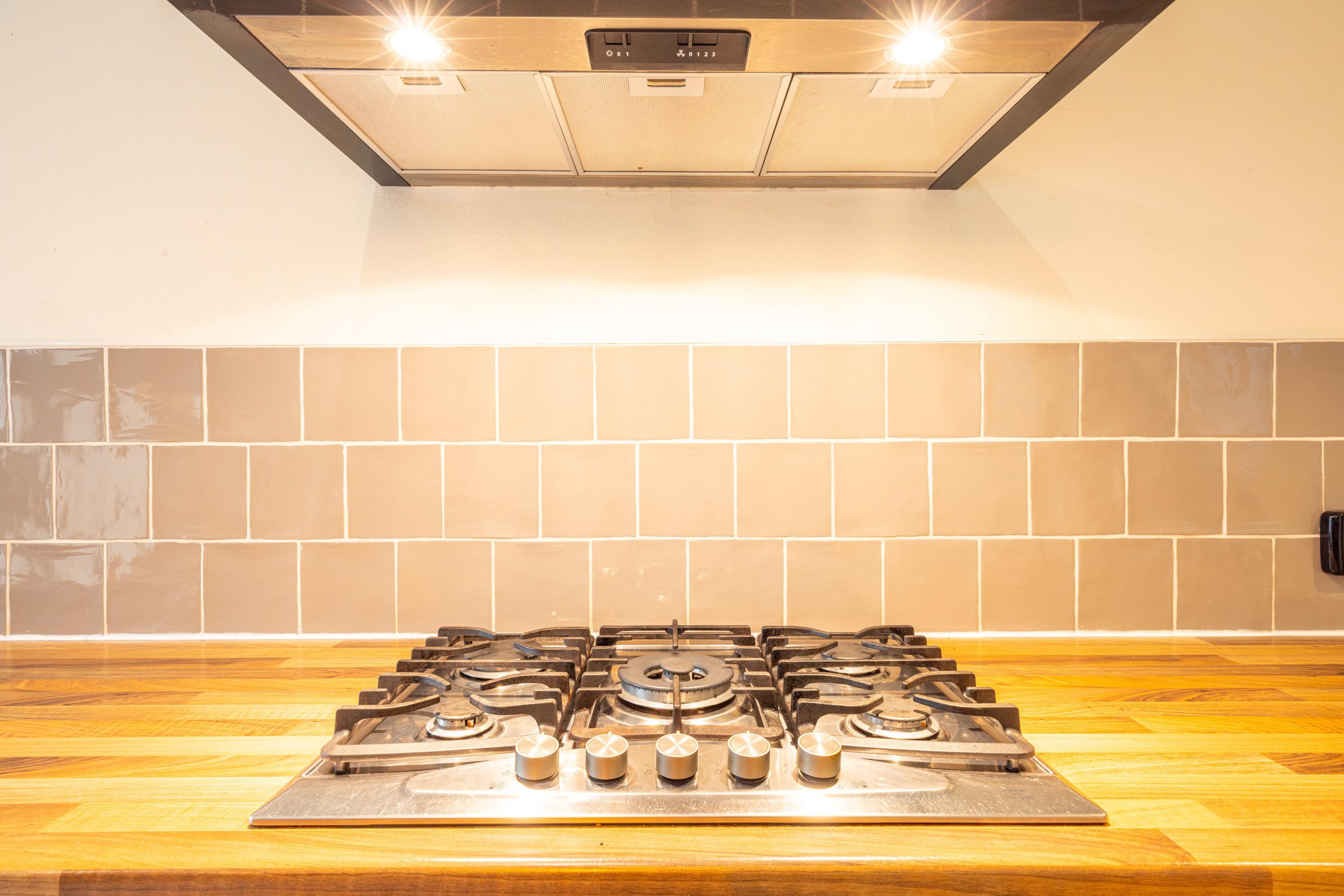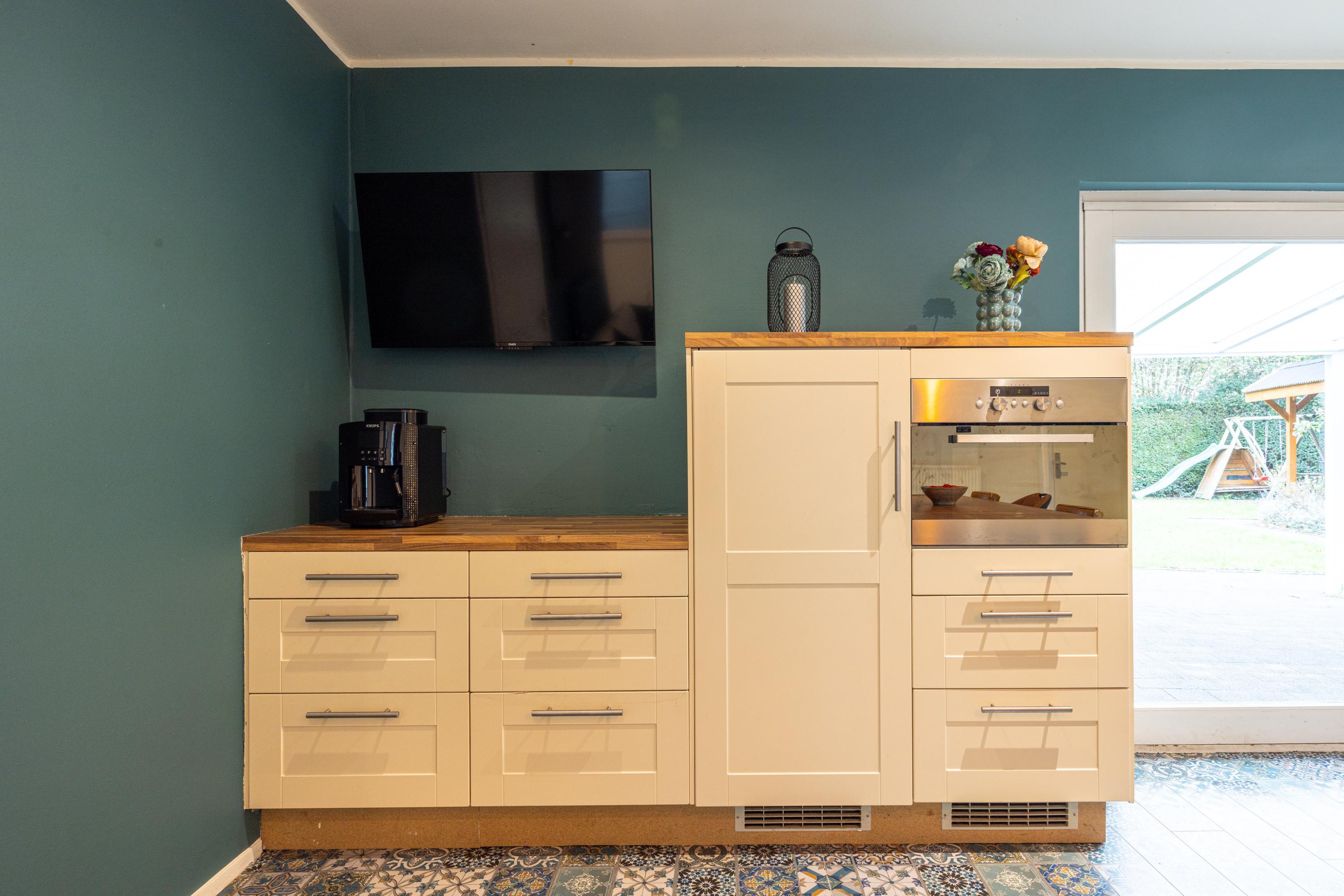 De ruime, open keuken is een fijne plek om samen te zijn. Deze is vernieuwd in 2005 en uitgevoerd met veel werkblad en kastruimte. De vloer met tegelmotief past mooi bij de sfeervolle stijl. De keuken is ingericht met: 5-pits gasfornuis, afzuigkap, combi-heteluchtoven, koelkast en vaatwasser.