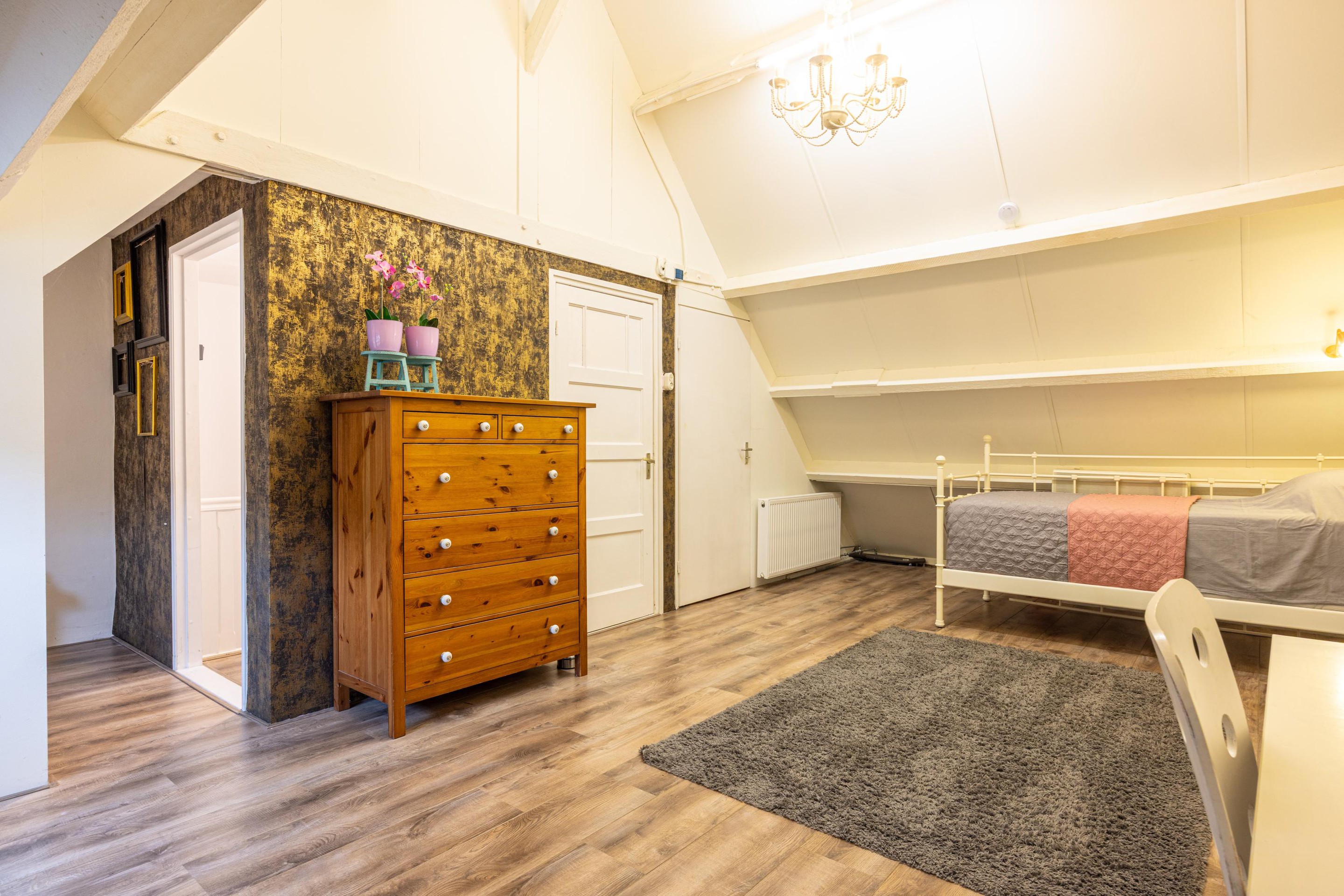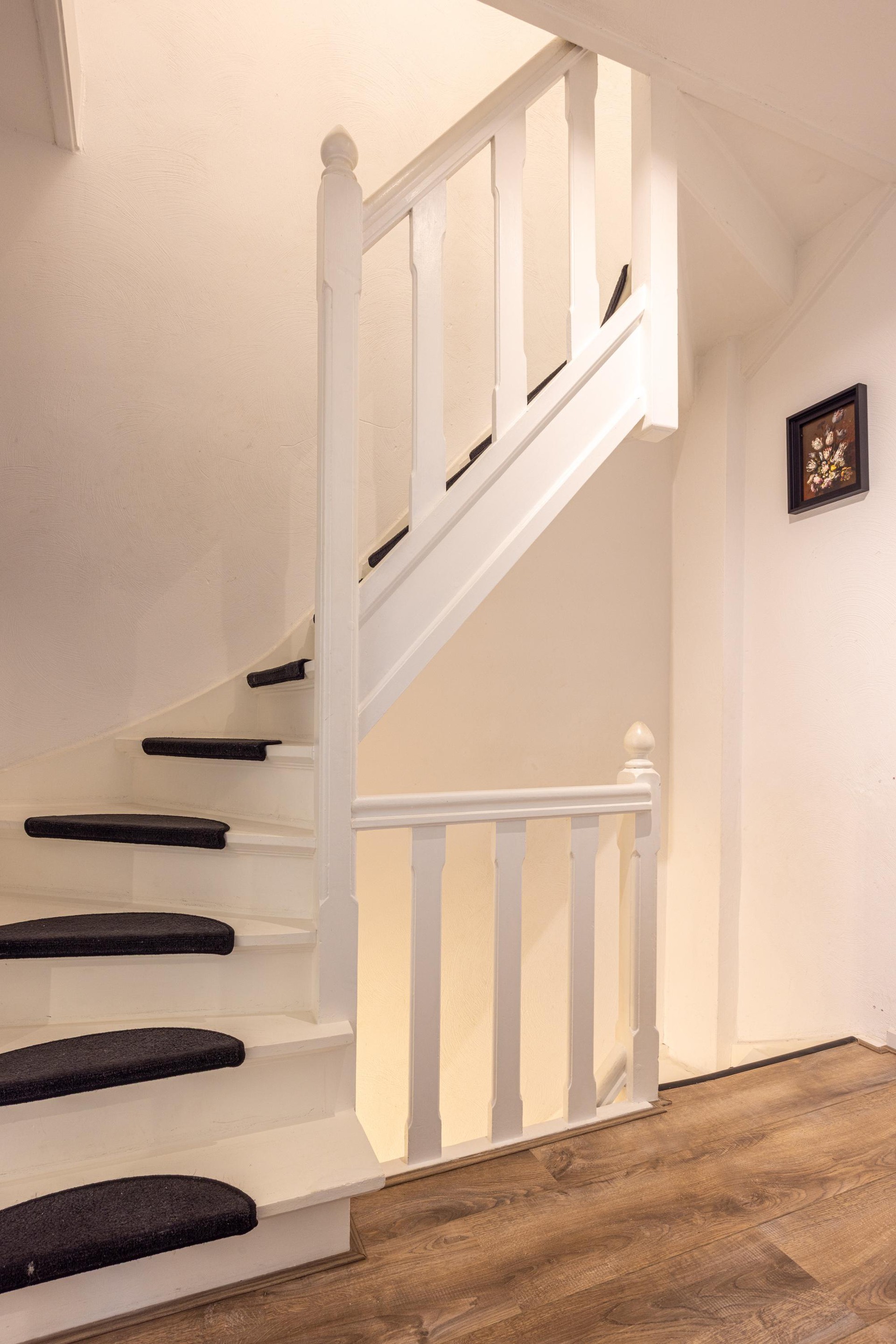 Eerste verdieping De originele houten trap brengt je naar de overloop waar drie slaapkamers en de badkamer liggen. De slaapkamers hebben allemaal een laminaatvloer, kunststof kozijnen met HR++ glas en rolluiken. Dankzij de grote ramen hebben de ruimtes een prettige lichtinval.