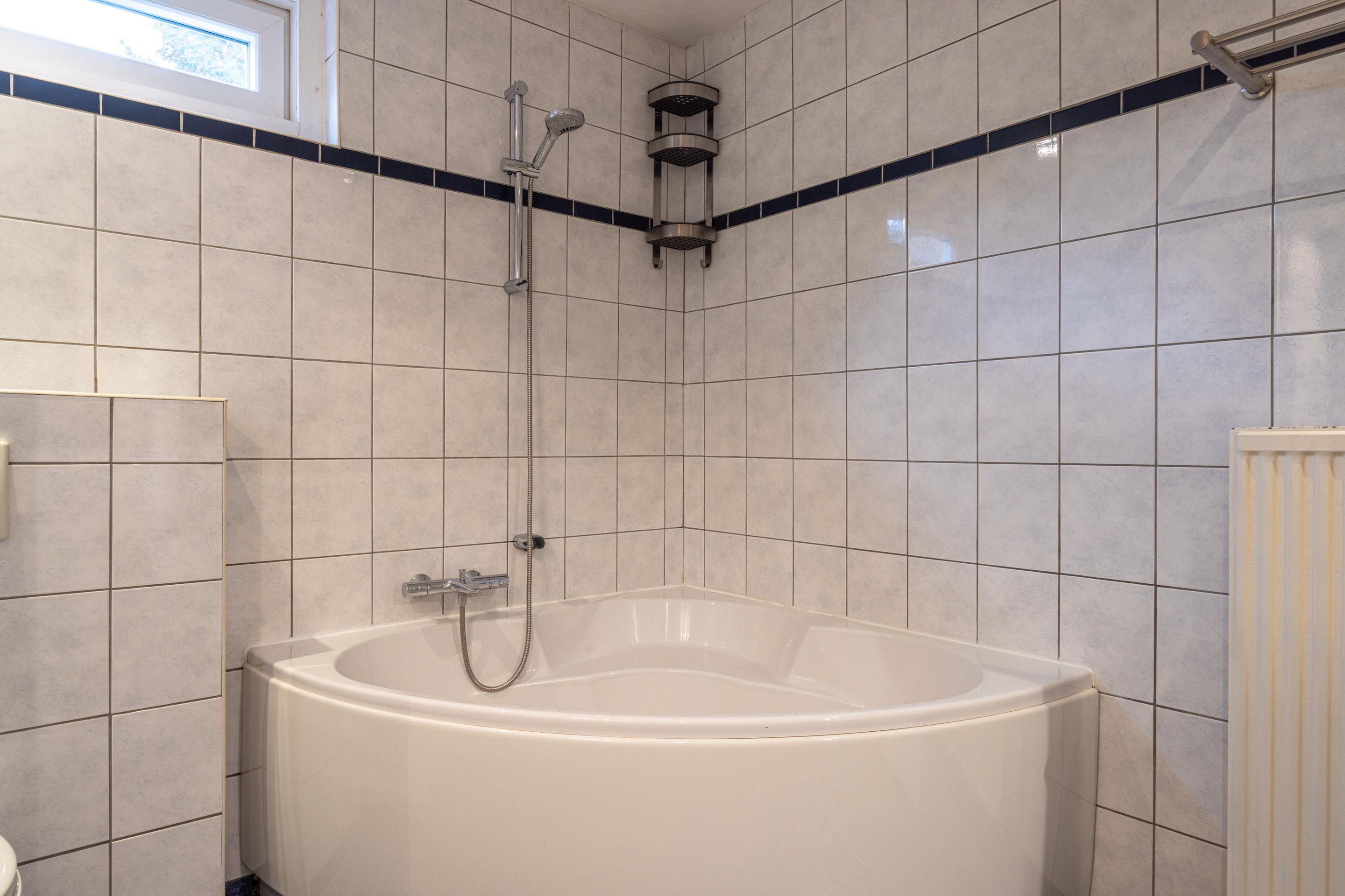 De badkamer is praktisch ingedeeld met een hoekbad, wastafelmeubel met spiegel, zwevend toilet en radiator.