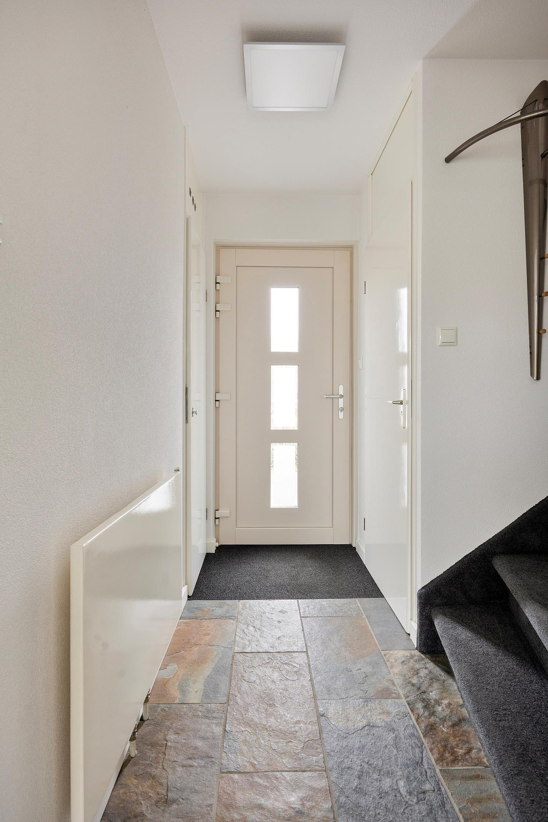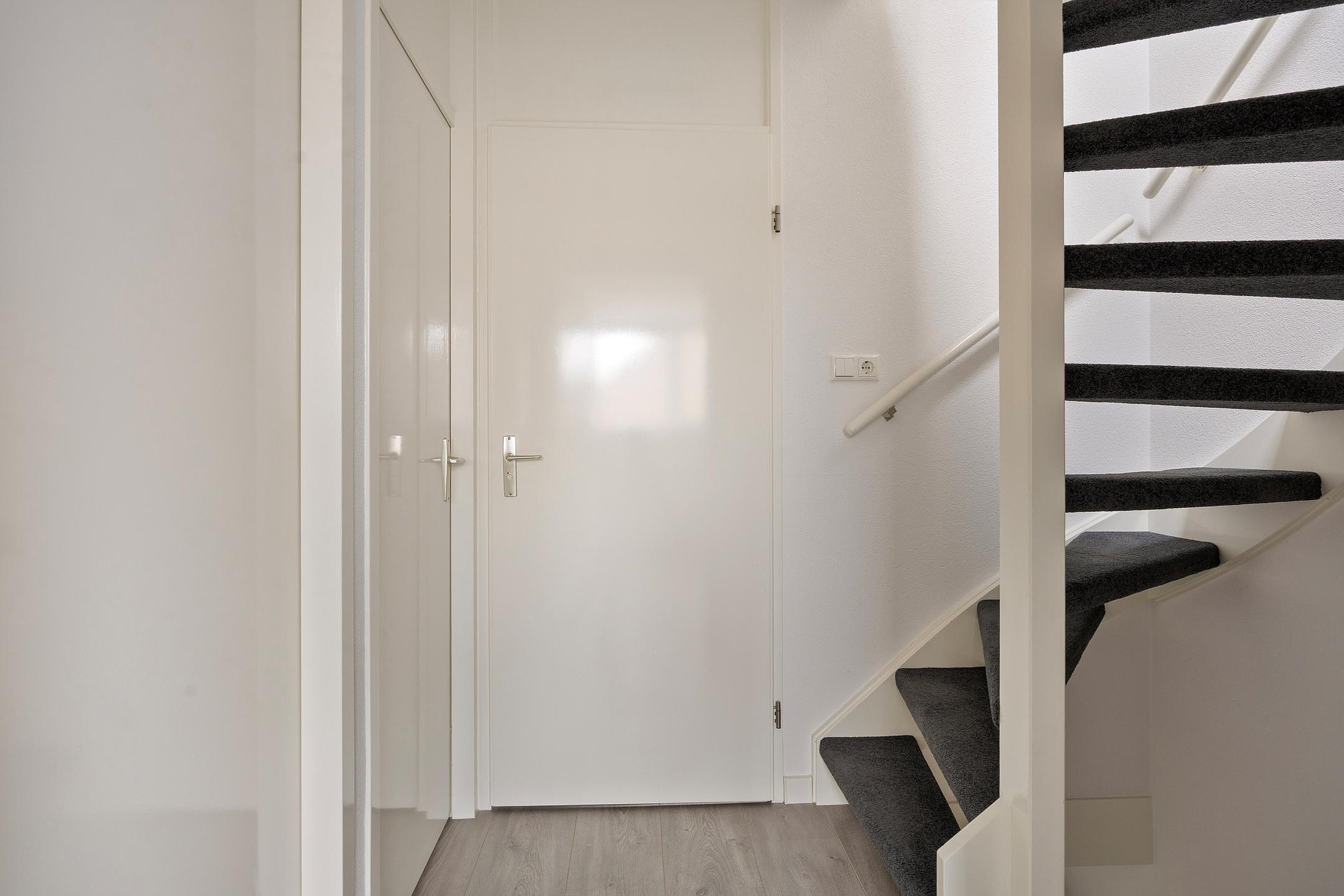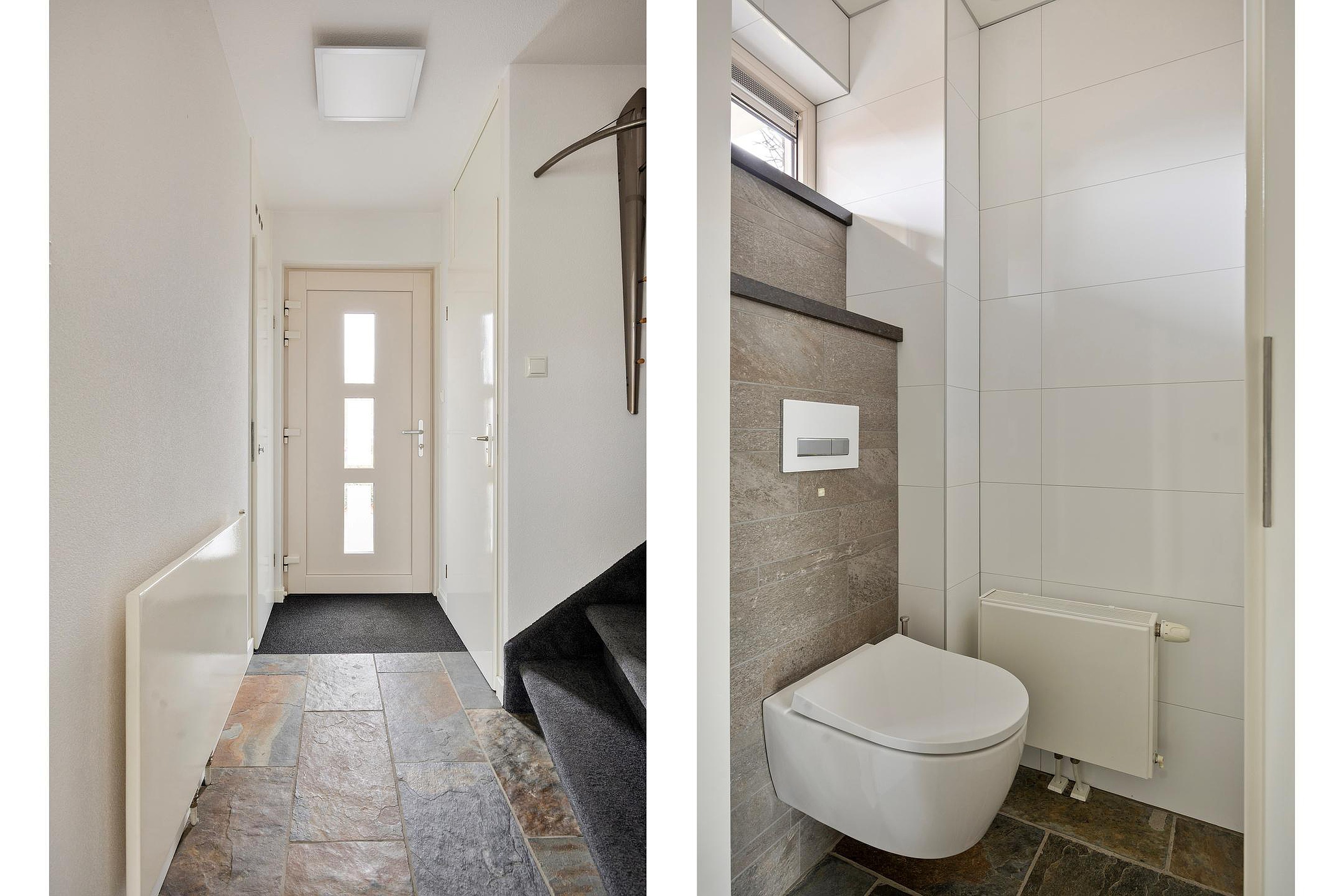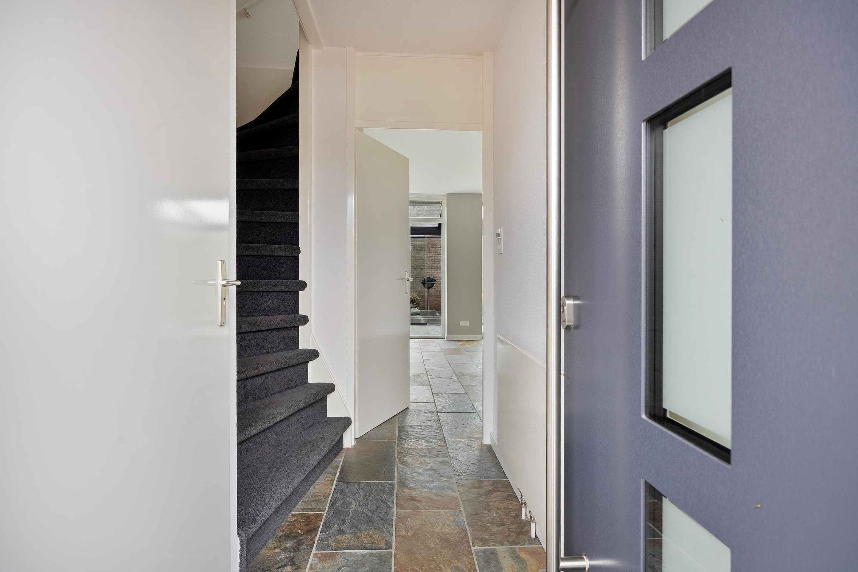 De woning ligt middels parkeerhavens en een trottoir met groenstrook rustig afgeschermd van de straat. Via de beschutte voortuin komt u bij de fraaie gevel van de woning waar u via de moderne deur binnenkomt in de hal. Deze biedt plaats aan de meterkast, de trapopgang naar de 1e verdieping, een nette toiletruimte en de toegang naar de living.