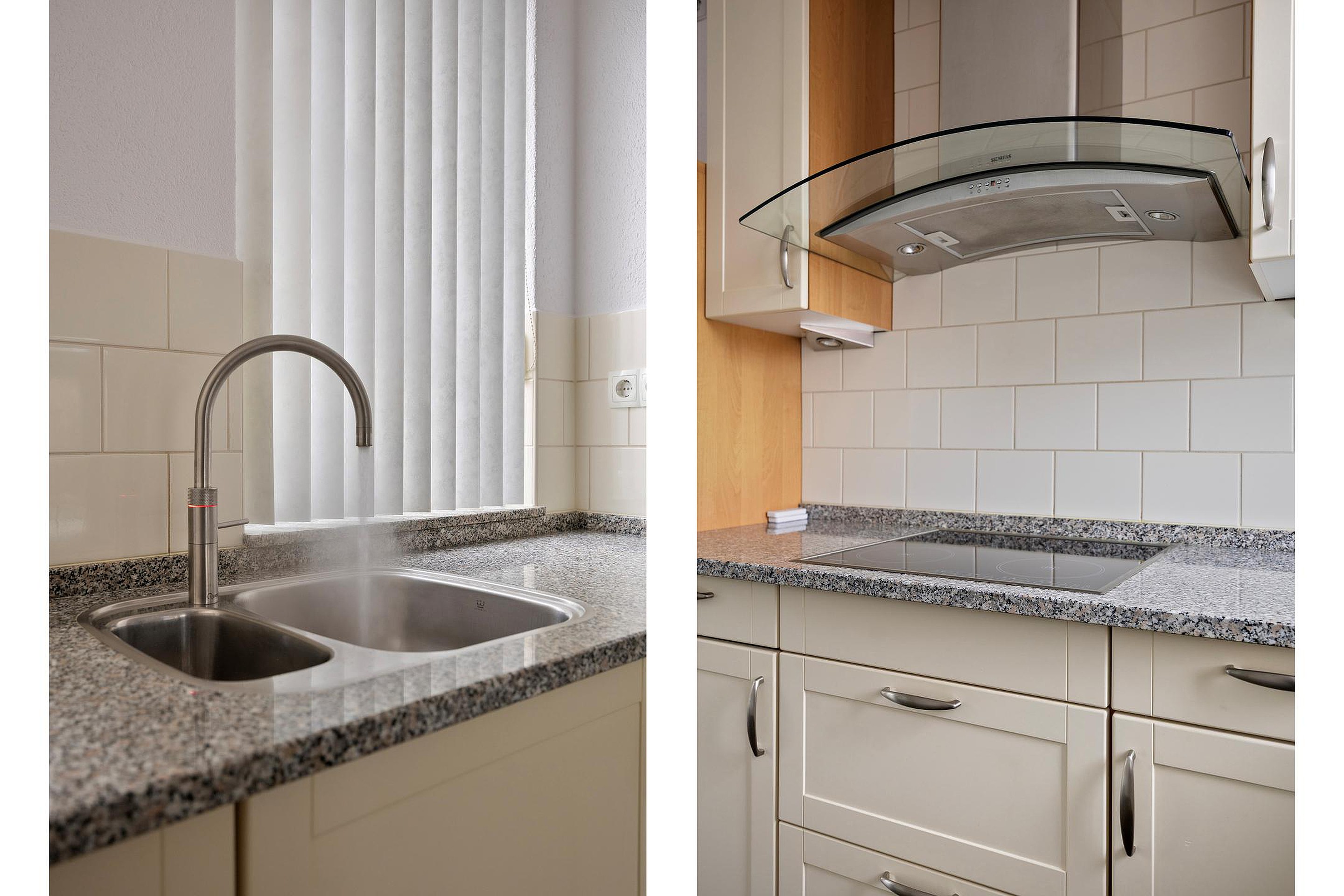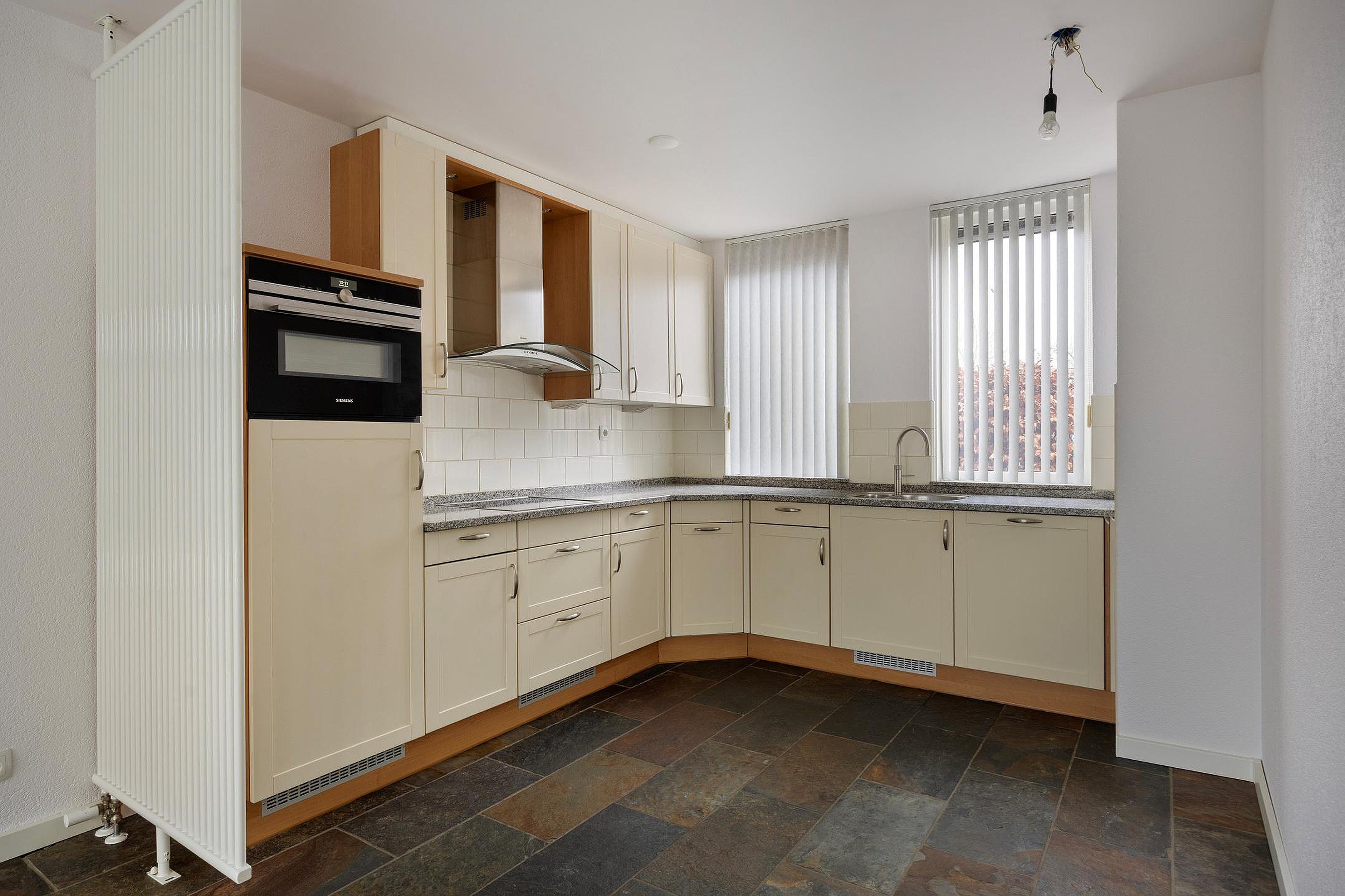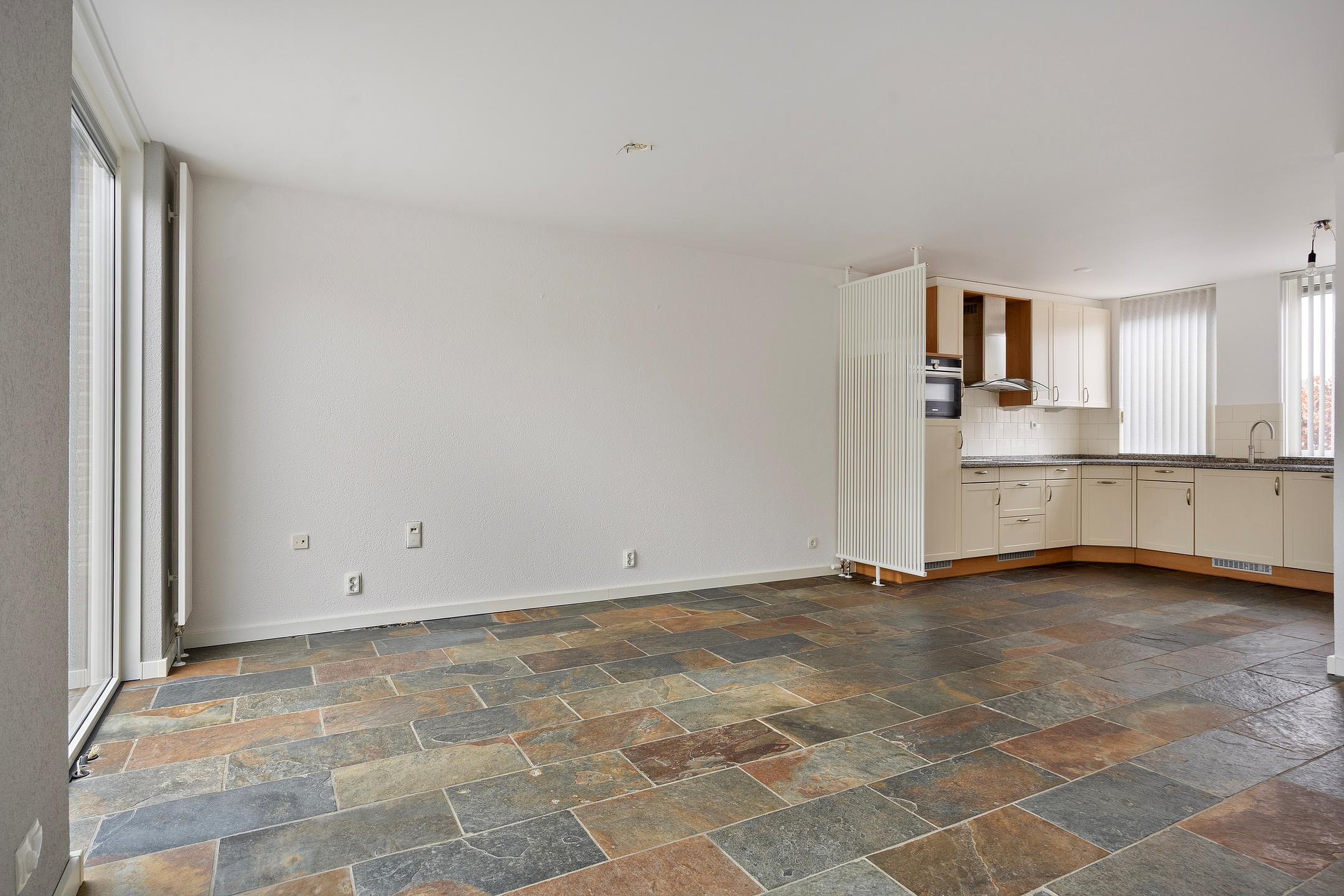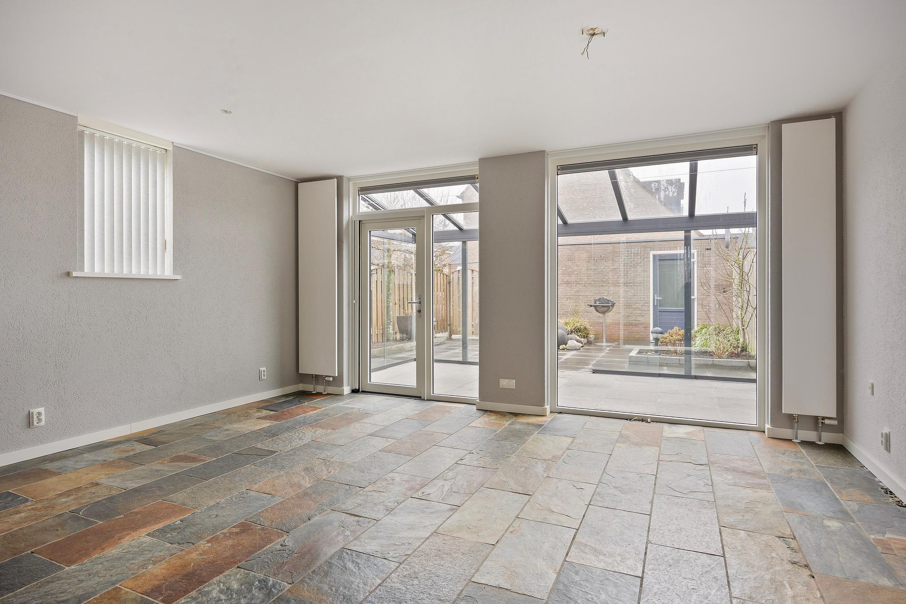 De fijne lichte woonkamer is afgewerkt met strakke wanden en plafonds en de gehele begane grond is voorzien va een robuuste leisteen vloer. Achter in de woonkamer is ruim plaats voor een grote lounge van waar u mooi zicht heeft op de fraaie achtertuin. Ook stapt u hier de glazen serre in, een heerlijke bonusruimte waar u gebruik va kunt maken in alle seizoenen van het jaar. Aan de voorzijde vindt u de keuken welke geplaatst is in een hoekopstelling. De keuken is uitgevoerd in een landelijke stijl met recent vernieuwde appratuur, veel werk- en bergruimte e een granieten werkblad. Naast de keuken heeft u voldoende ruimte voor een grote eethoek.