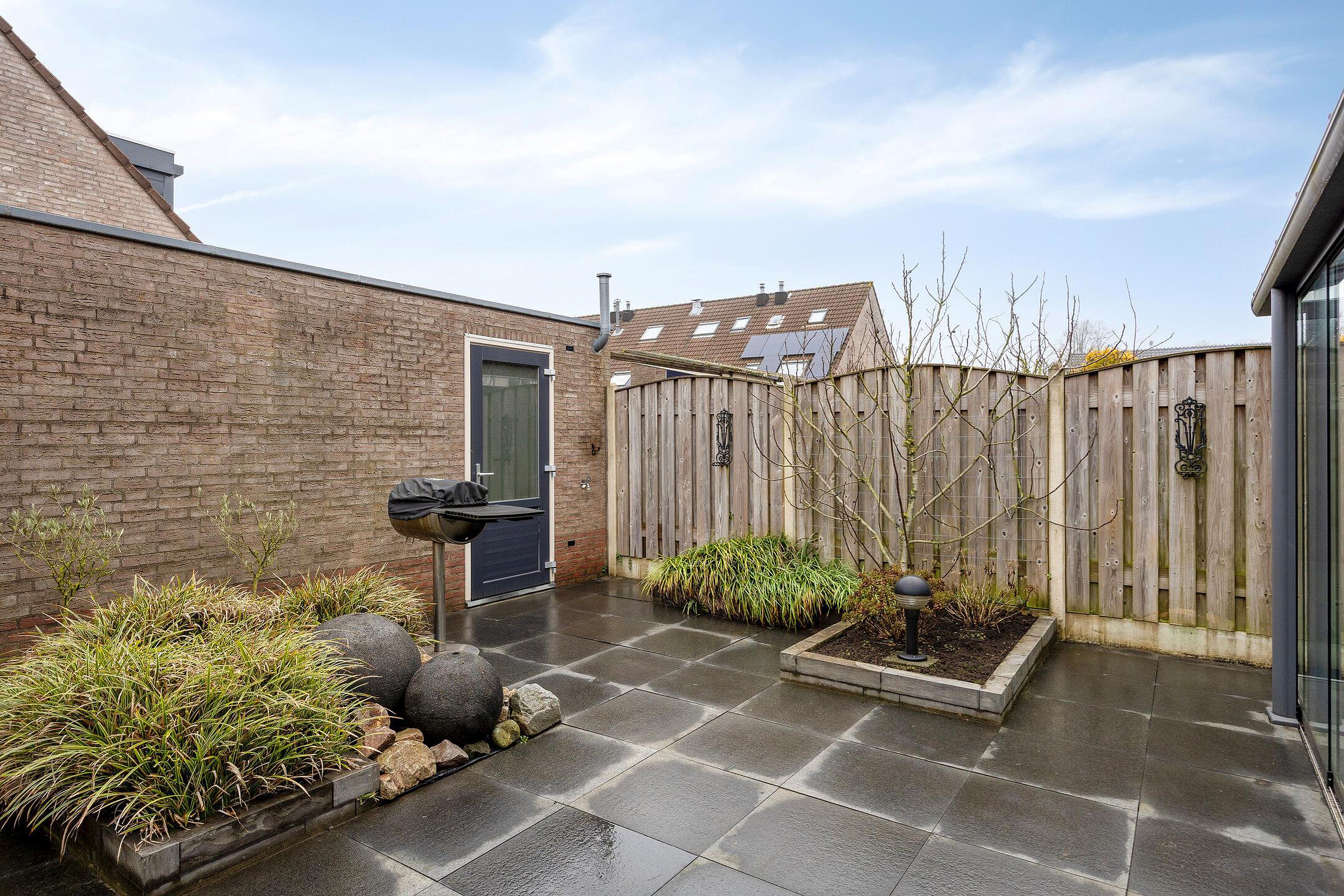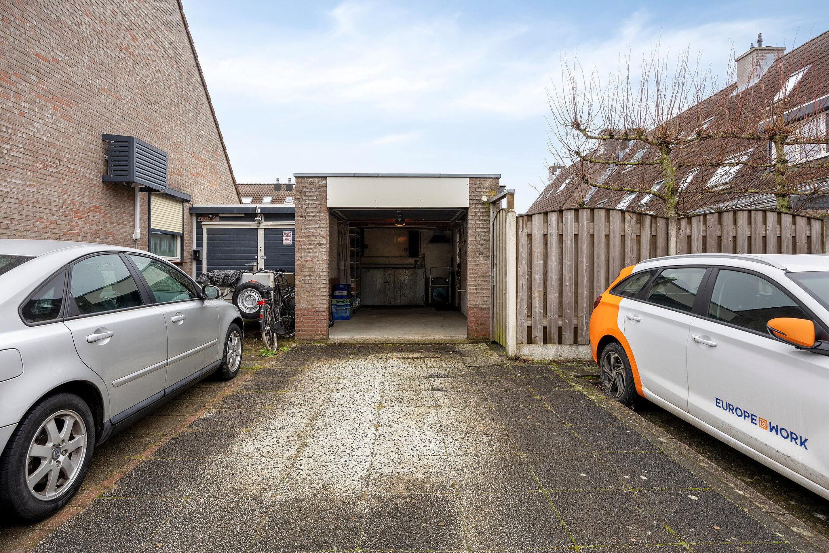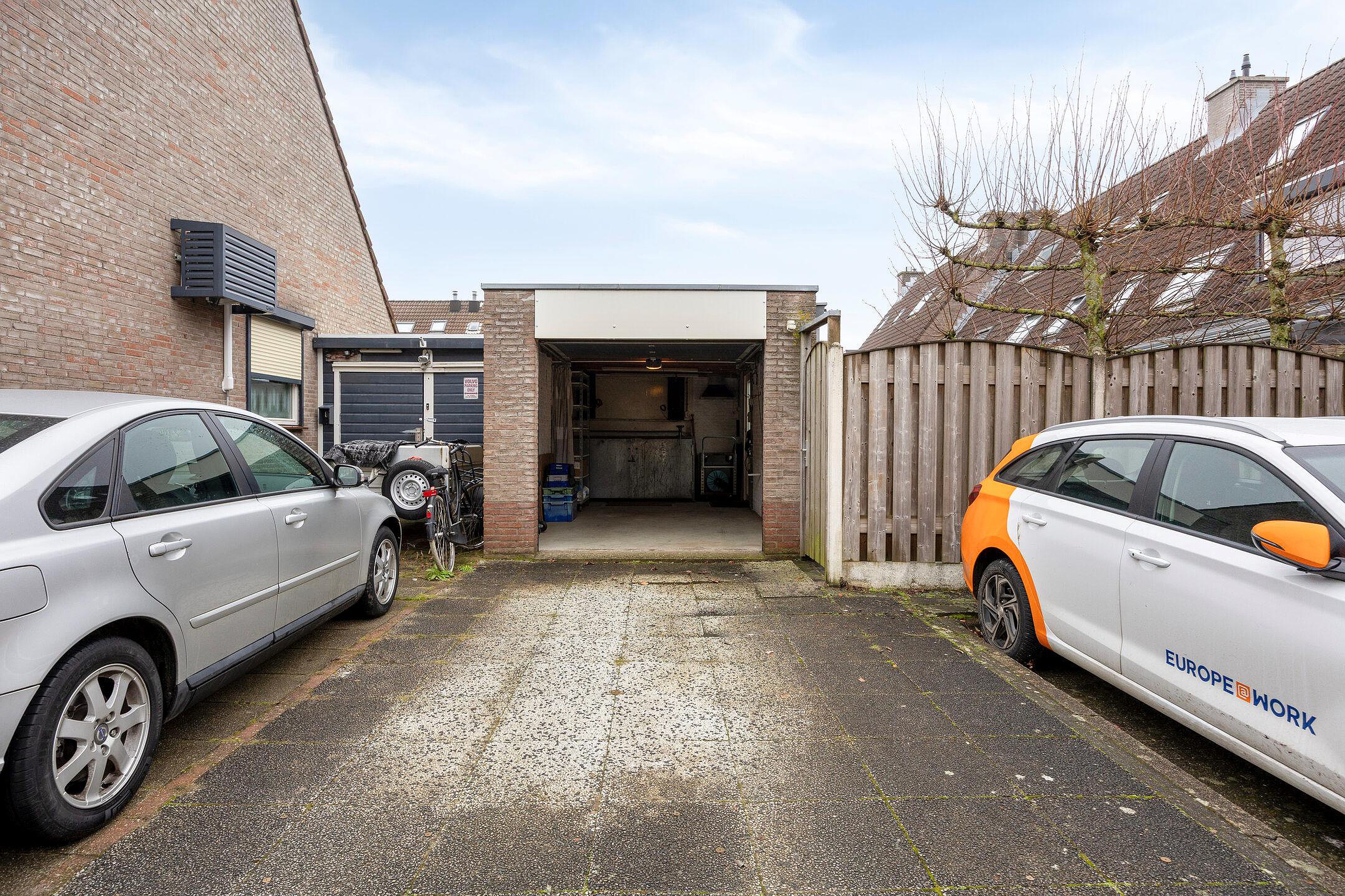 De nette tuin loopt aan 3 zijden rond de woning waar u de achtertuin kunt betreden via de poort aan de zijkant, de garage of de serre. De tui is ingericht met mooie sierbestrating, grote plantenborders, robuuste schuttingen en een grote garage. De garage is voorzien van een elektrische roldeur, verlichting en een werkbank. U vindt hier veel ruimte voor het bergen van uw gereedschap, het speelgoed van de kinderen en al uw rijwielen.