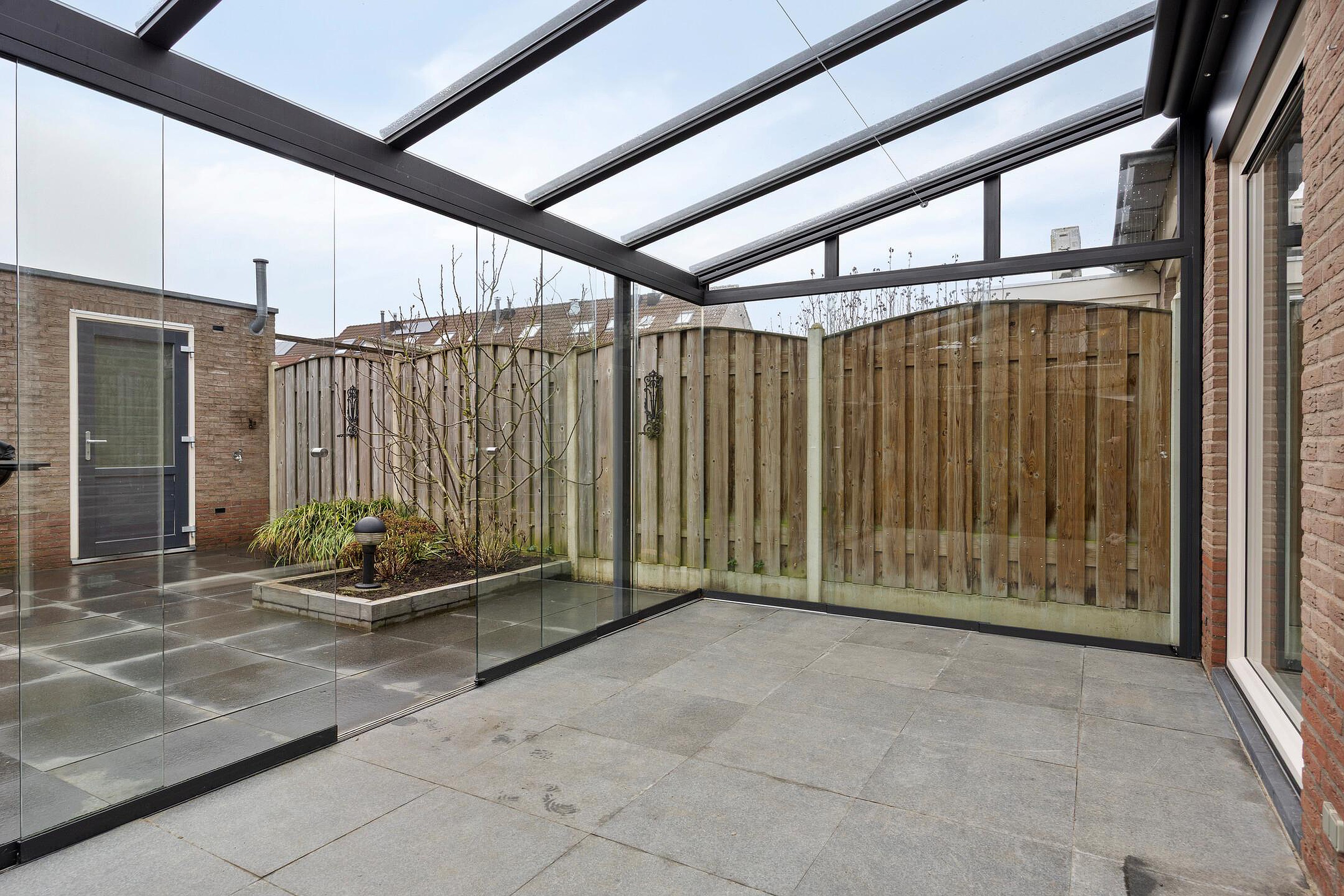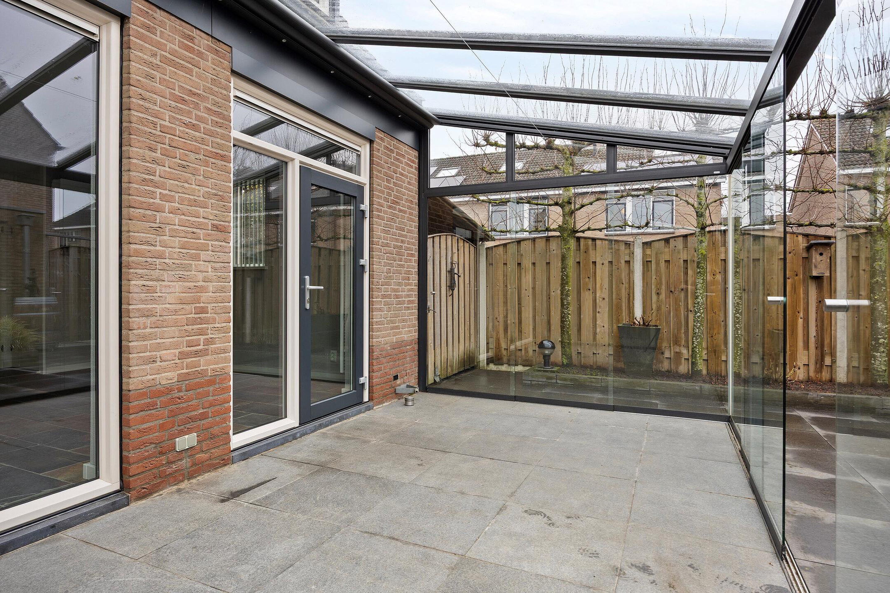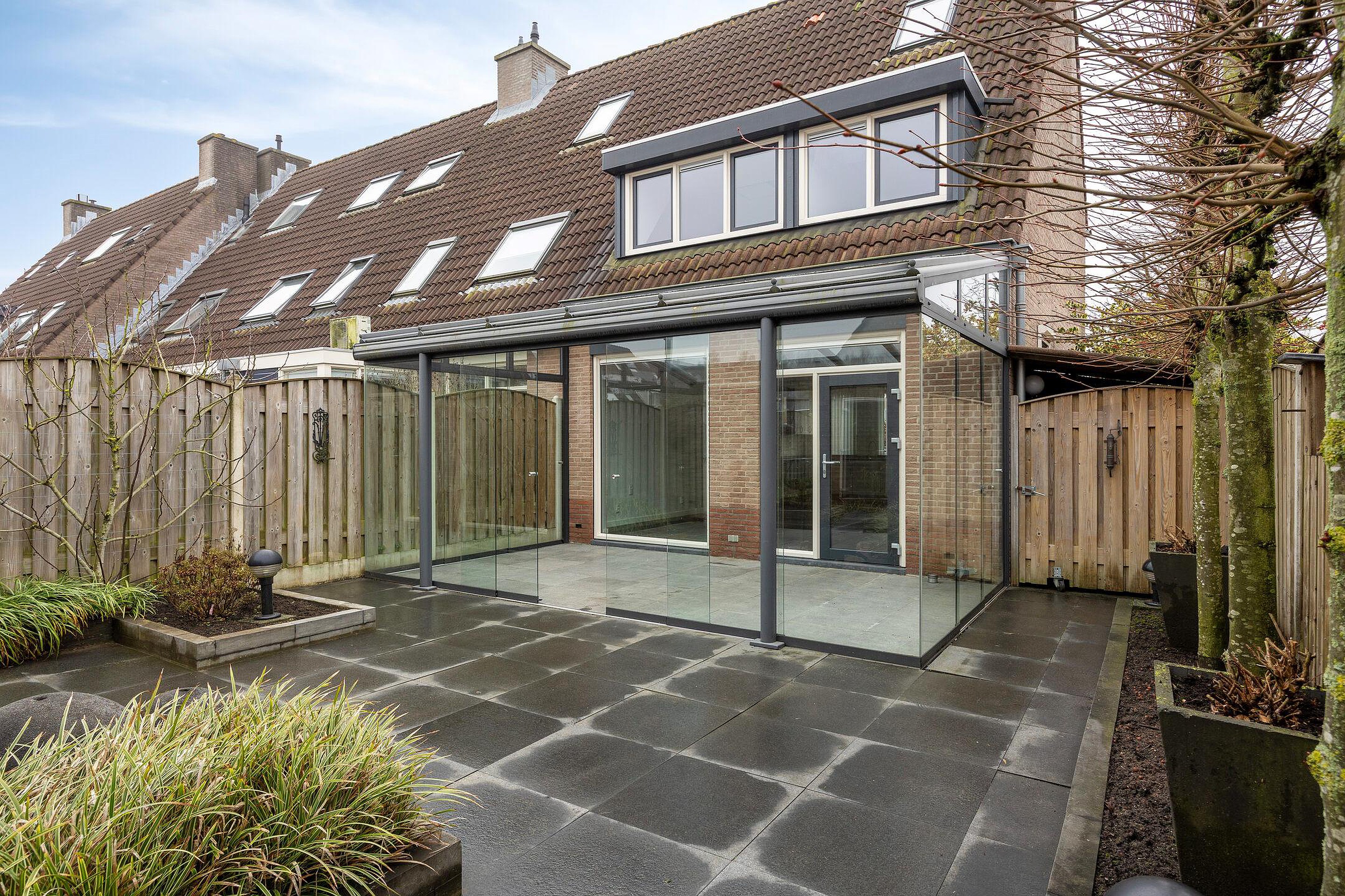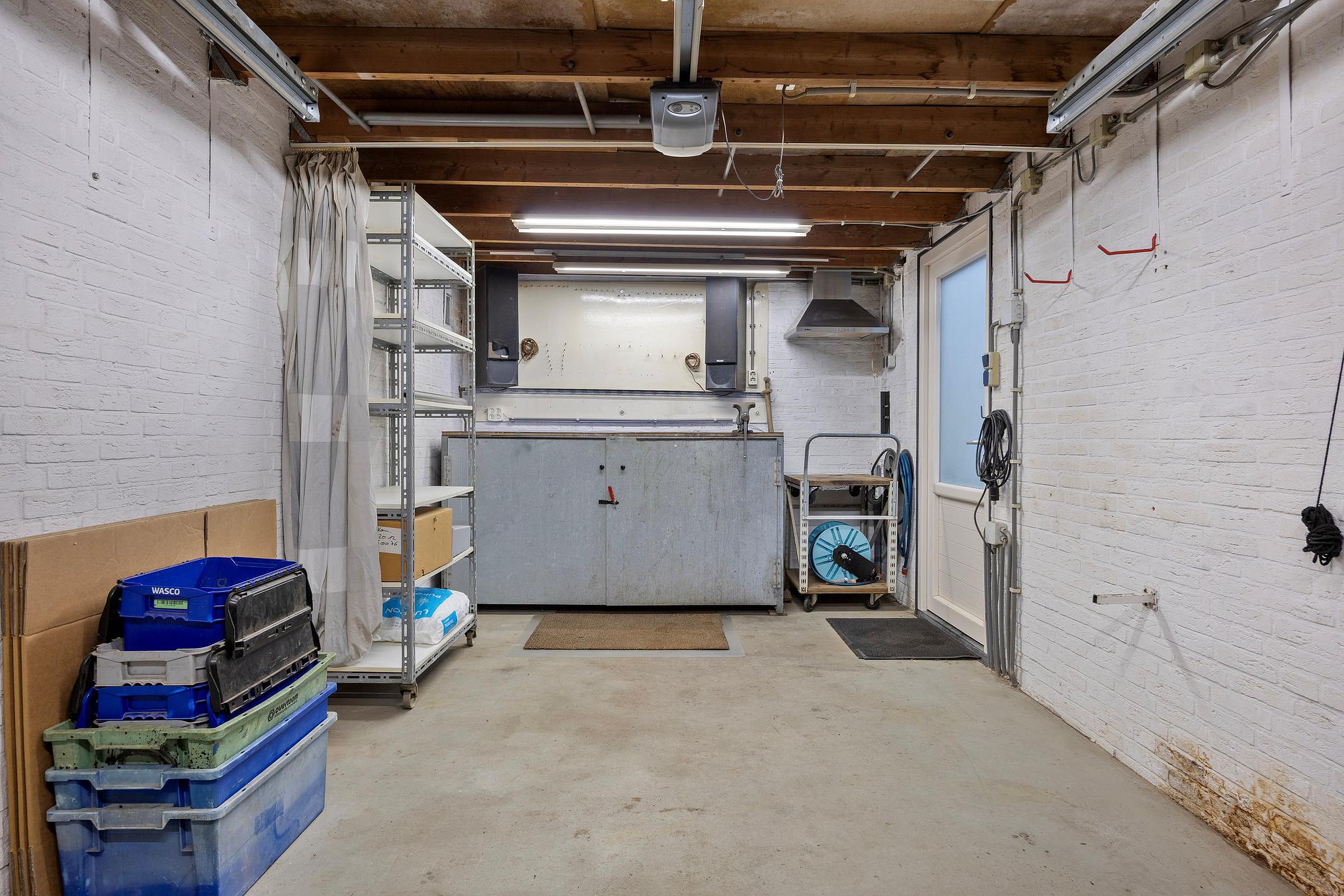 De nette tuin loopt aan 3 zijden rond de woning waar u de achtertuin kunt betreden via de poort aan de zijkant, de garage of de serre. De tui is ingericht met mooie sierbestrating, grote plantenborders, robuuste schuttingen en een grote garage. De garage is voorzien van een elektrische roldeur, verlichting en een werkbank. U vindt hier veel ruimte voor het bergen van uw gereedschap, het speelgoed van de kinderen en al uw rijwielen.