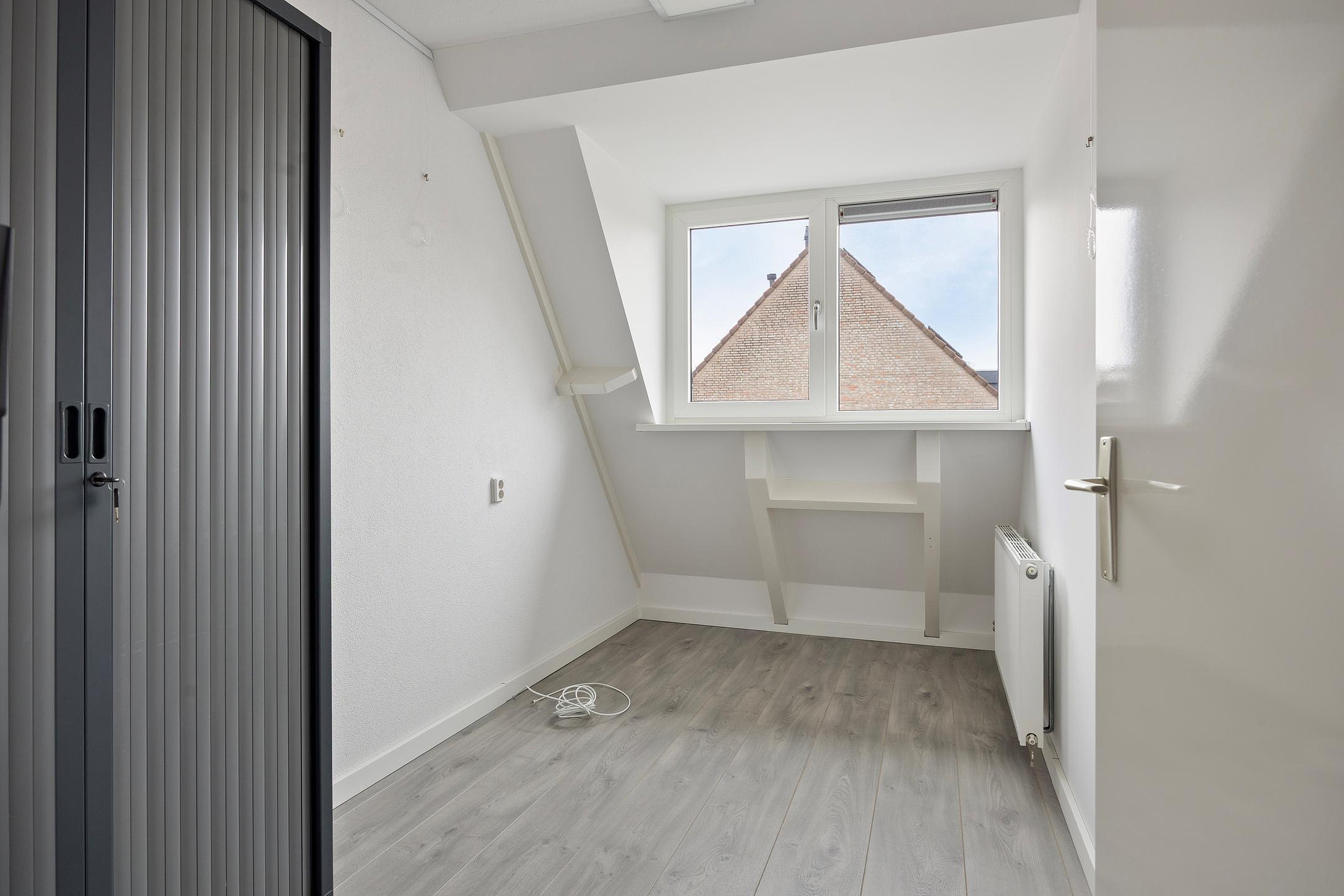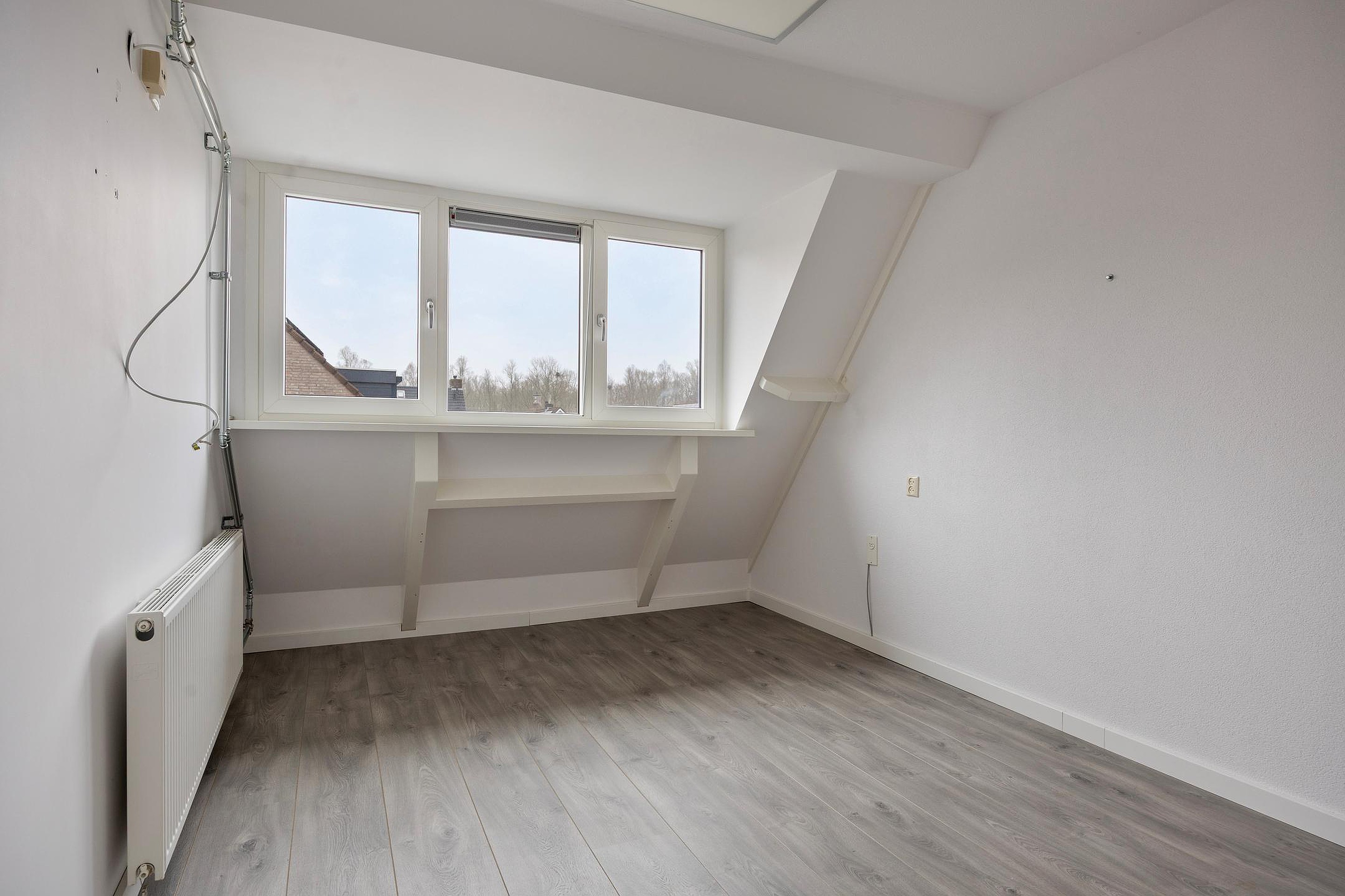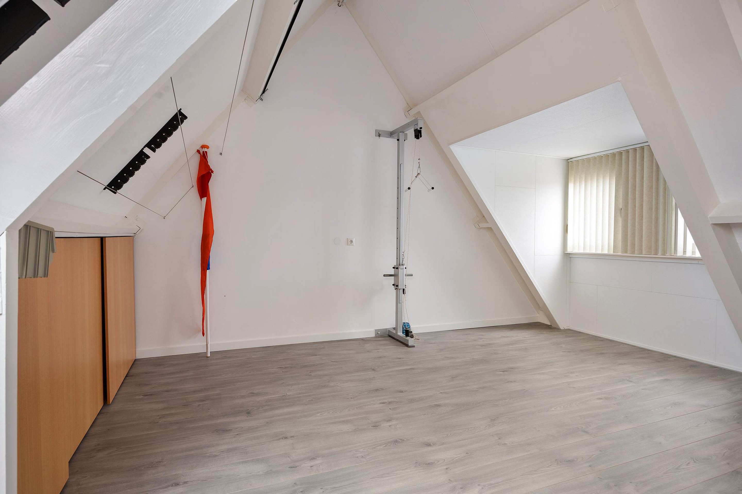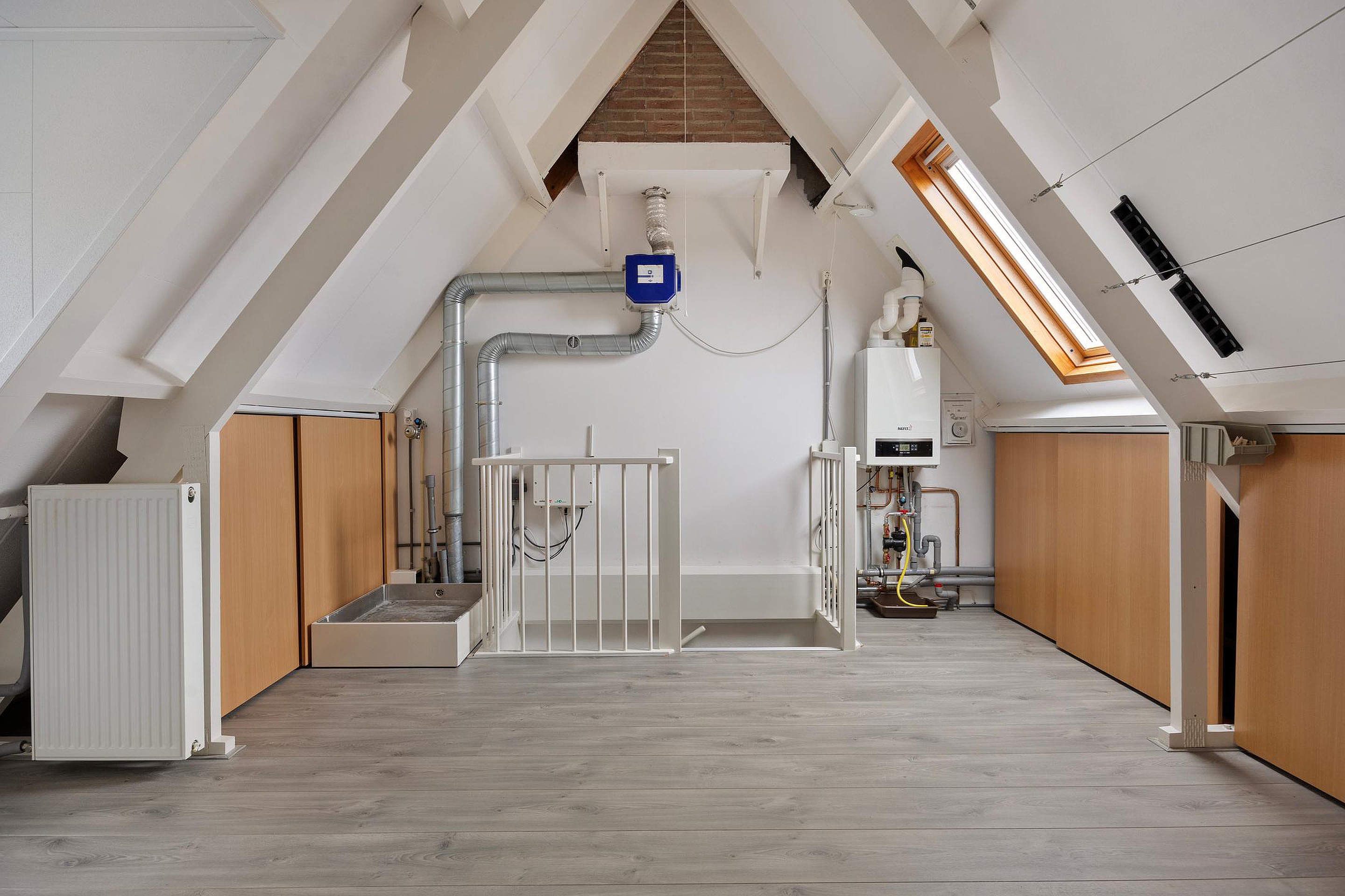 Via de volgende vaste trap komt u op de 2e verdieping waar u een grote open ruimte vindt met nette bergkaste onder de schuine zijden van het plafond. Ook deze ruimte is netjes afgewerkt e is heerlijk ruim en licht door de grote dakkapel e het extra dakraam. Deze ruimte biedt u veel mogelijkheden voor het inrichten van een extra slaapkamer, een werkruimte of een gym. Tevens vindt u hier de cv-opstelling, de afzuiginstallatie en de aansluitingen voor uw witgoed.