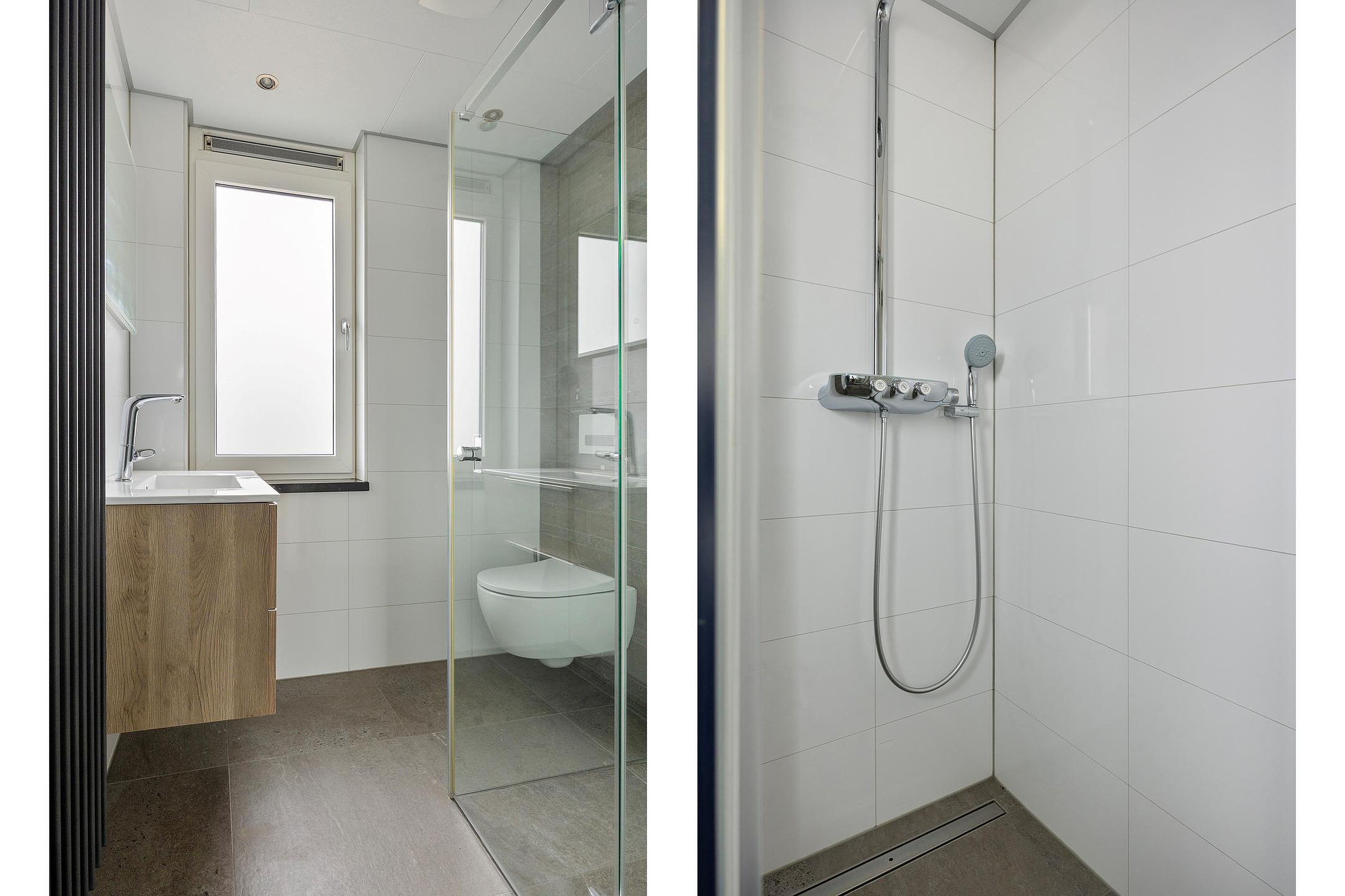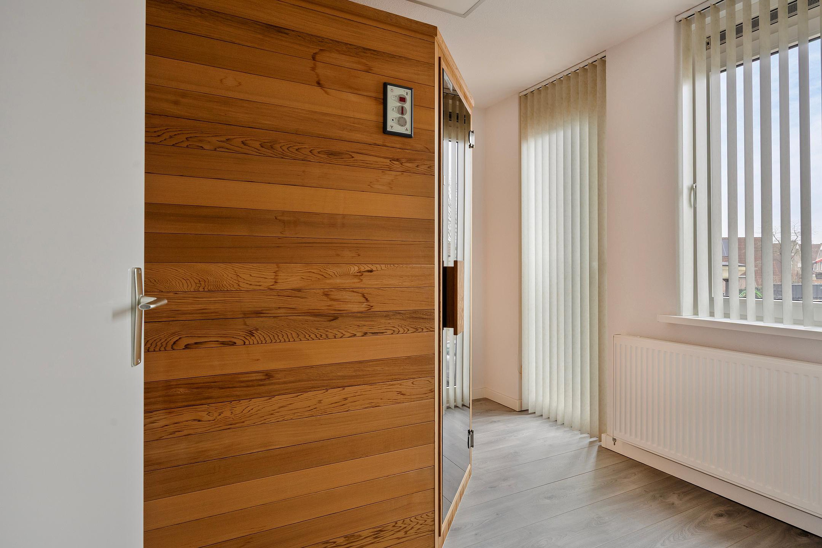 Via de trap vanuit de gang komt u op de nette overloop. Aangrenzend vindt u slaapkamers en een mooie badkamer. De kamers zijn allen voorzien van strakke wanden en plafonds, een nette laminaatvloer en grote raampartijen met aan de Zuidkant zonwering. De ruime badkamer is afgewerkt met mooie wand- en vloertegels en een strak plafond met inbouwverlichting. U kunt hier gebruik maken van een royale douchecabine, een grote wastafel met bergmeubel en spiegel, een hangend toilet en ook deze ruimte beschikt over een groot raam voor een fijne lichtinval en extra ventilatie. De kamer naast de badkamer is tevens omgebouwd tot een wellness ruimte met een grote infraroodsauna waar u heerlijk kunt ontspannen na een lange dag.