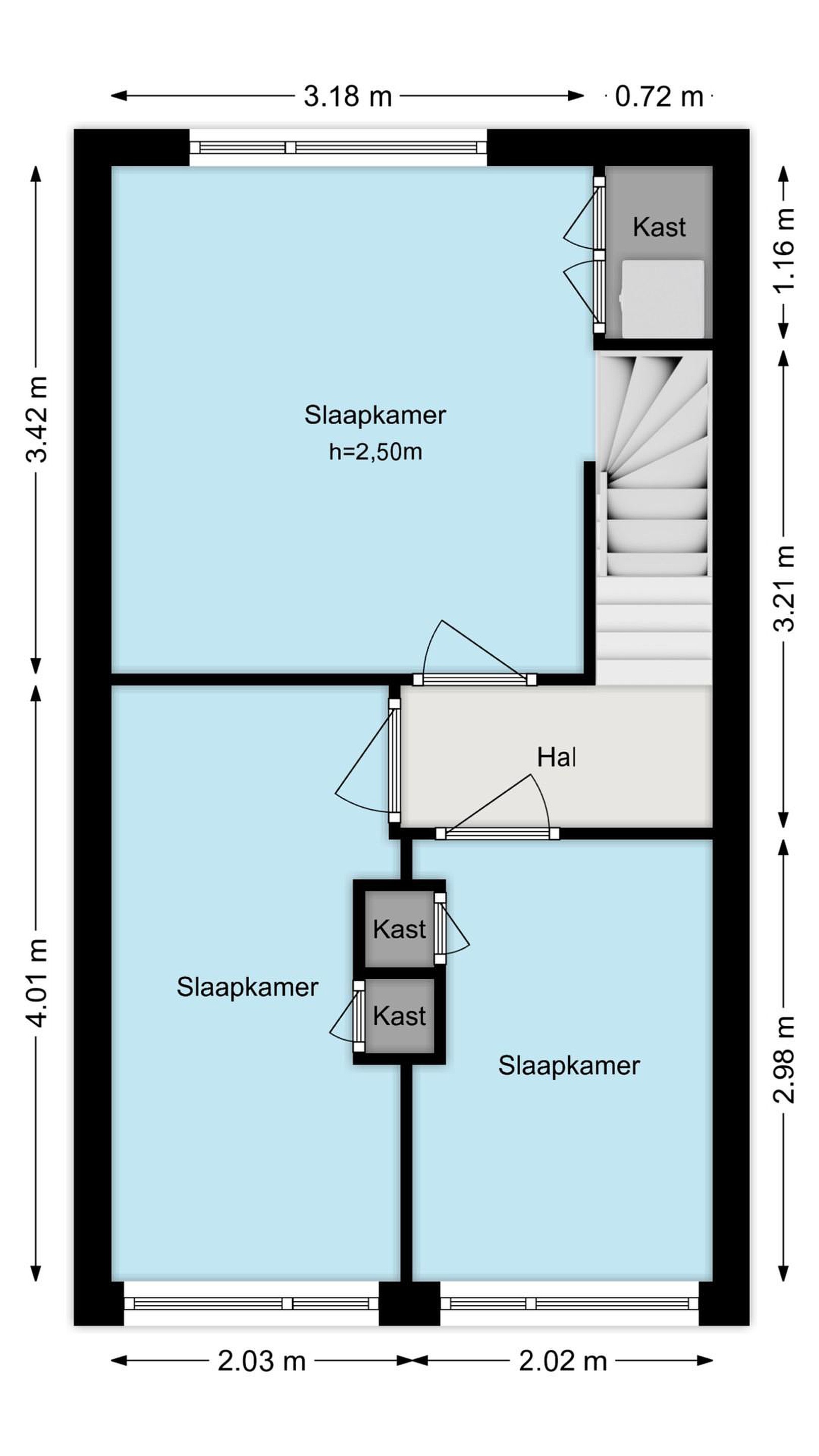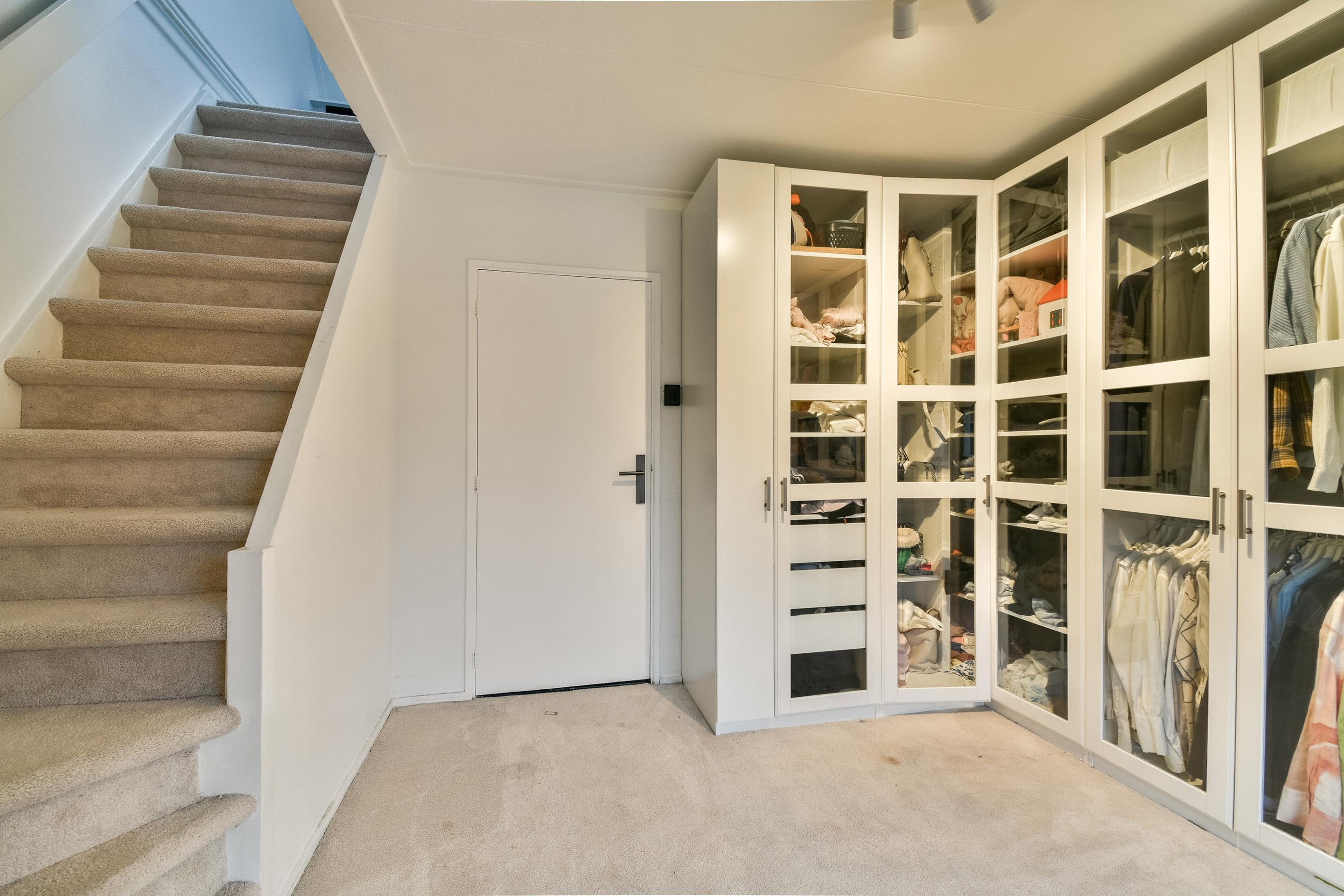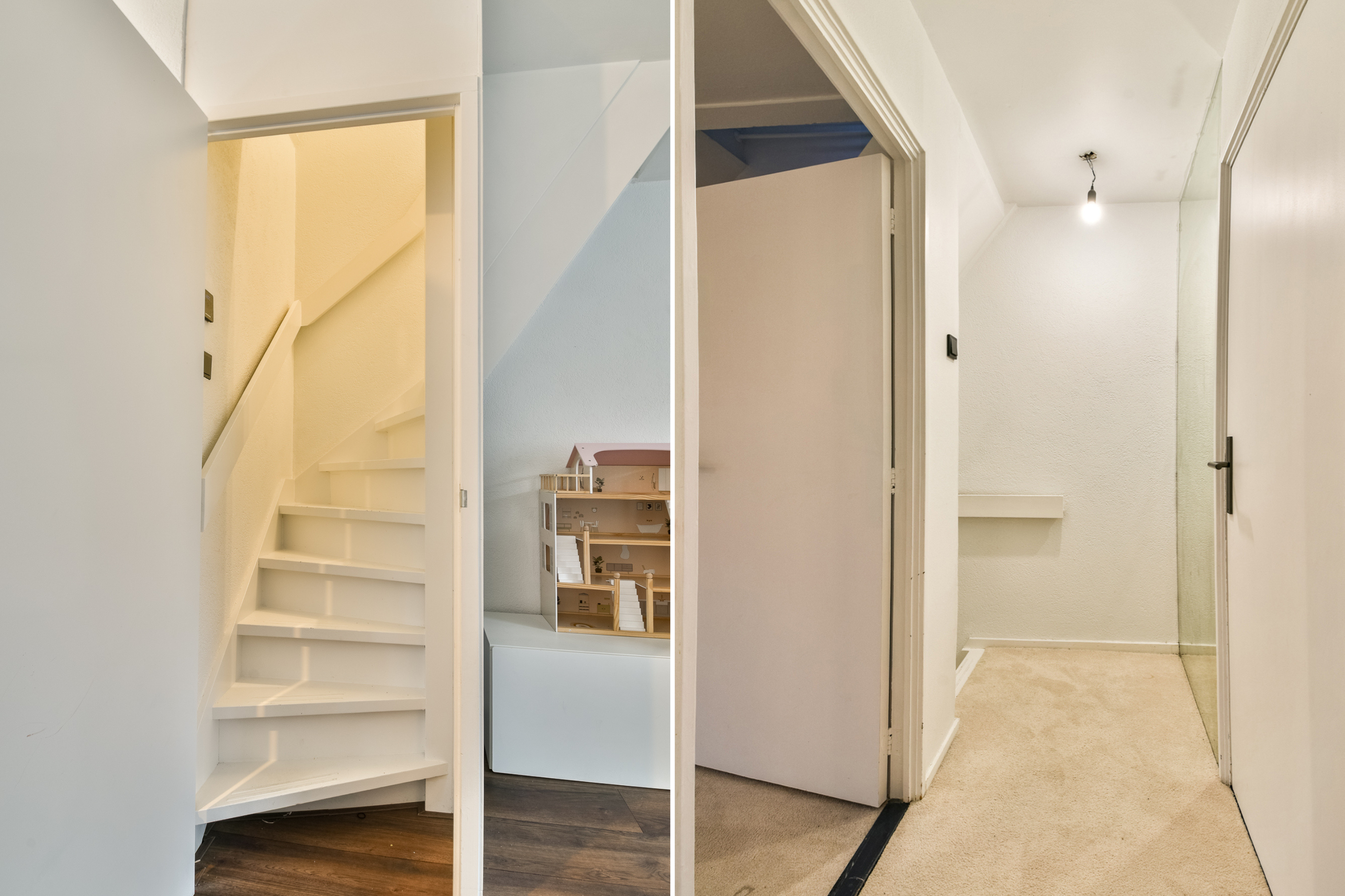 Eerste verdieping De overloop staat in directe verbinding met de drie slaapkamers op deze etage. De eerste slaapkamer is gelegen aan de volledig opgetrokken achterzijde en voorzien van airconditioning en vaste kastruimte. Ook de tweede slaapkamer ligt aan de achterzijde, beschikt over airconditioning en vaste kastruimte. De derde slaapkamer ligt aan de voorzijde en wordt momenteel gebruikt als inloopkast. De ruimte beschikt over een vaste kast met witgoedaansluitingen en de beklede trapopgang naar de zolderetage.