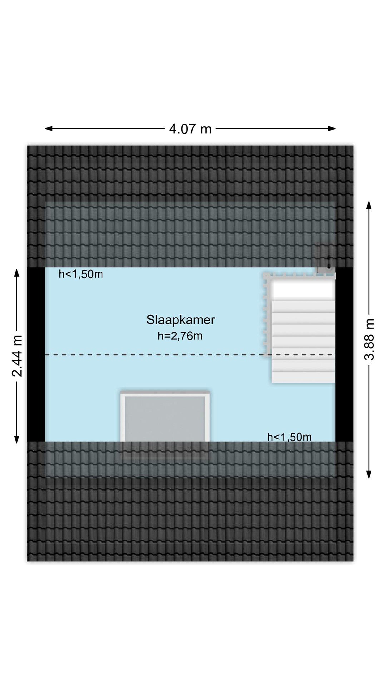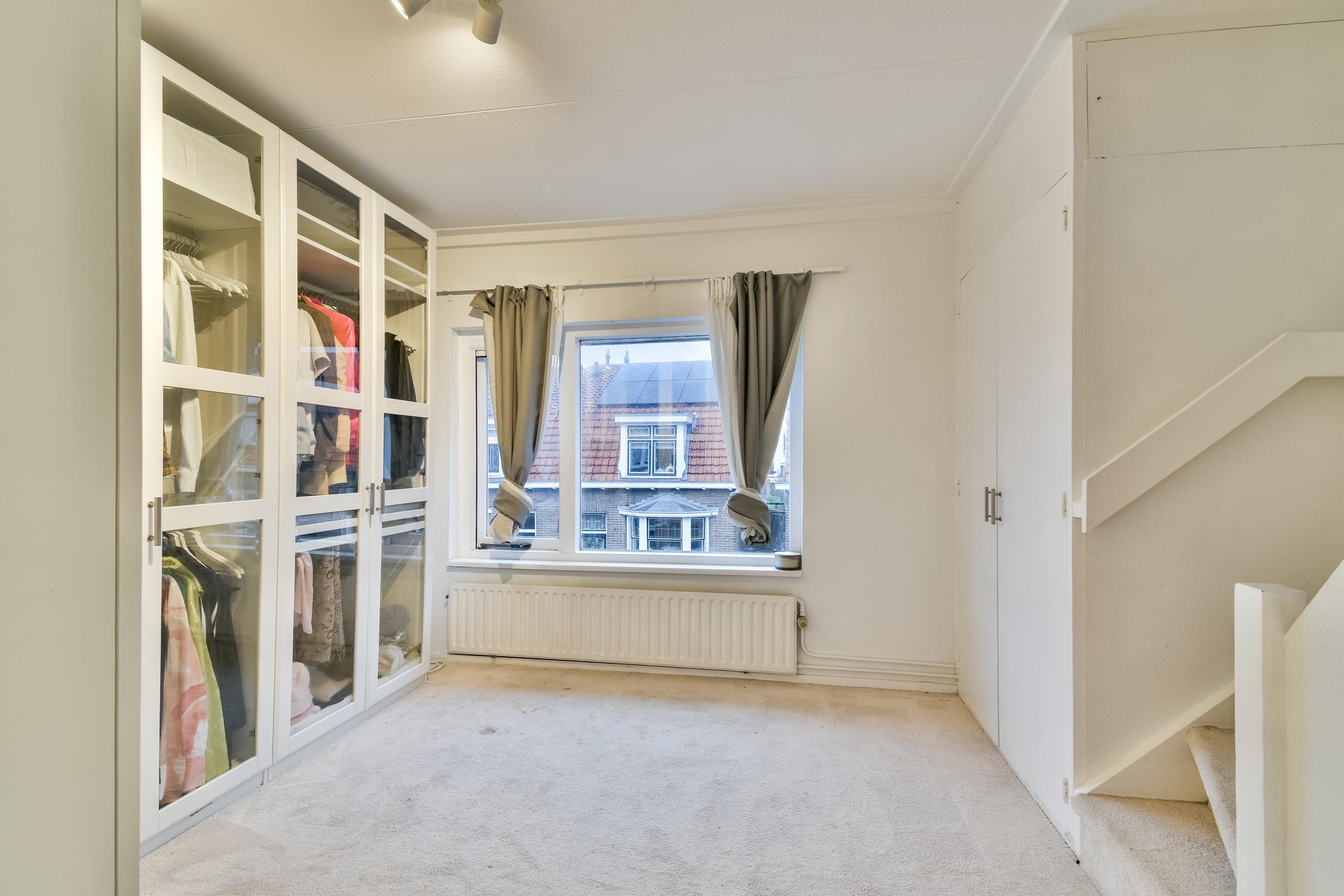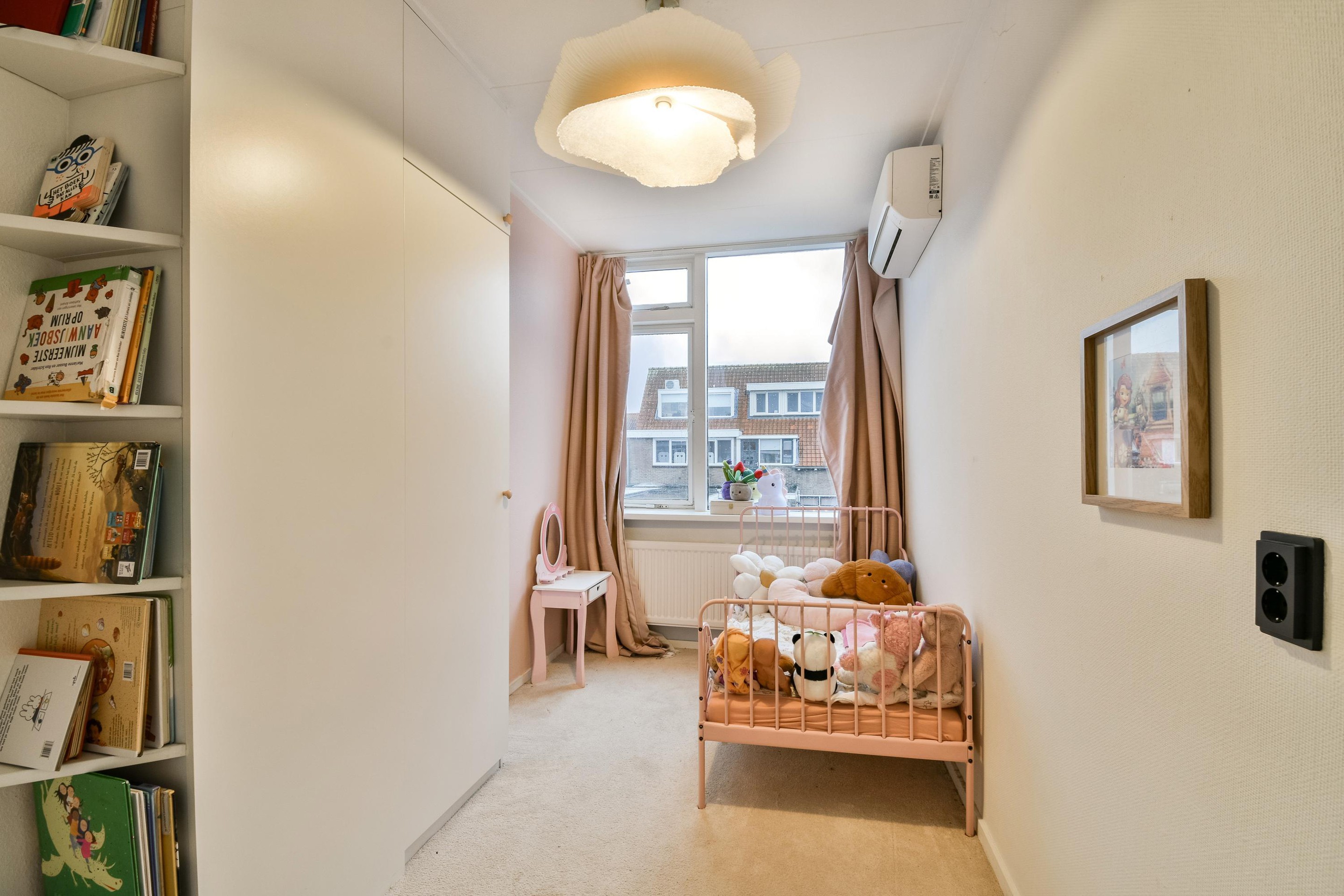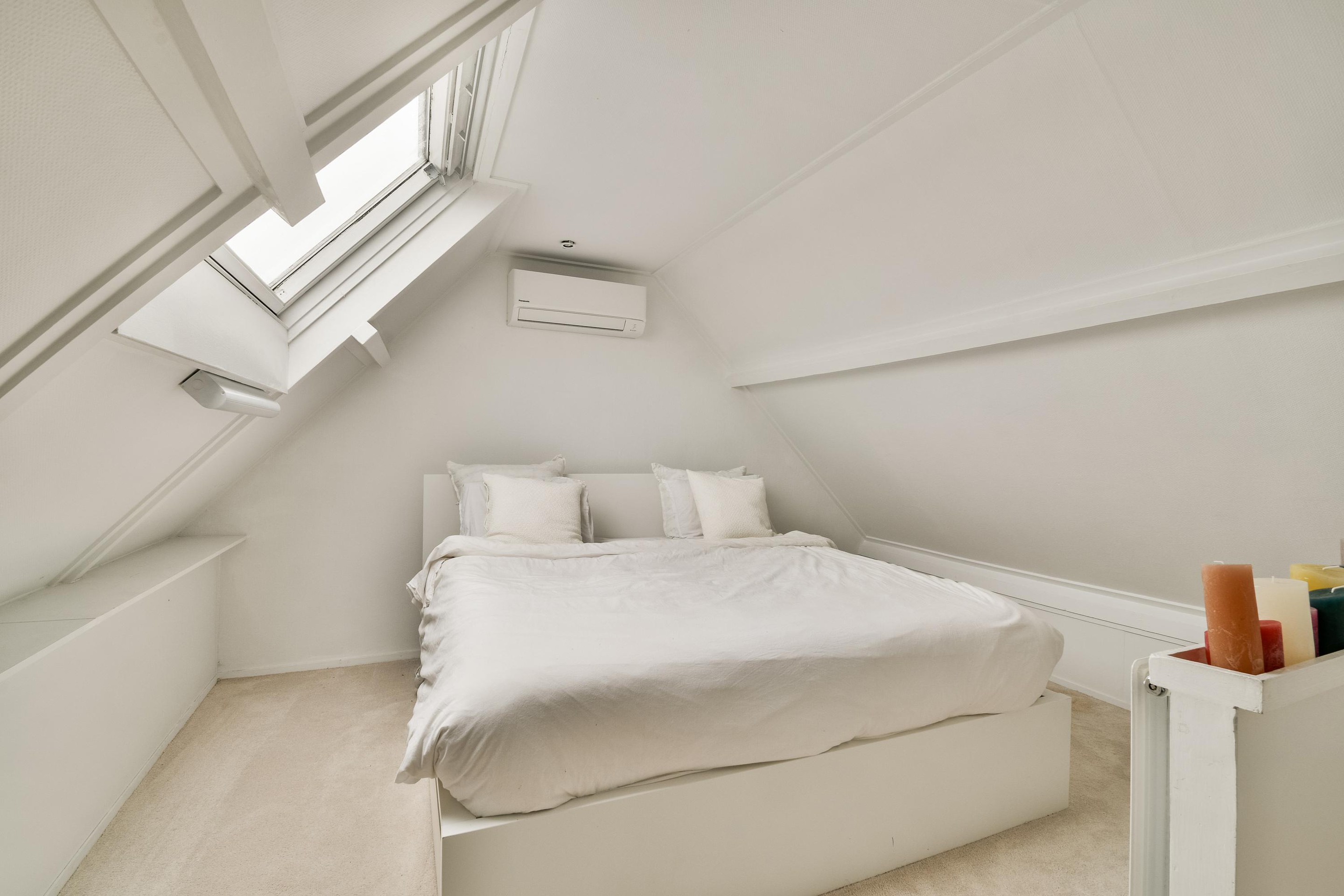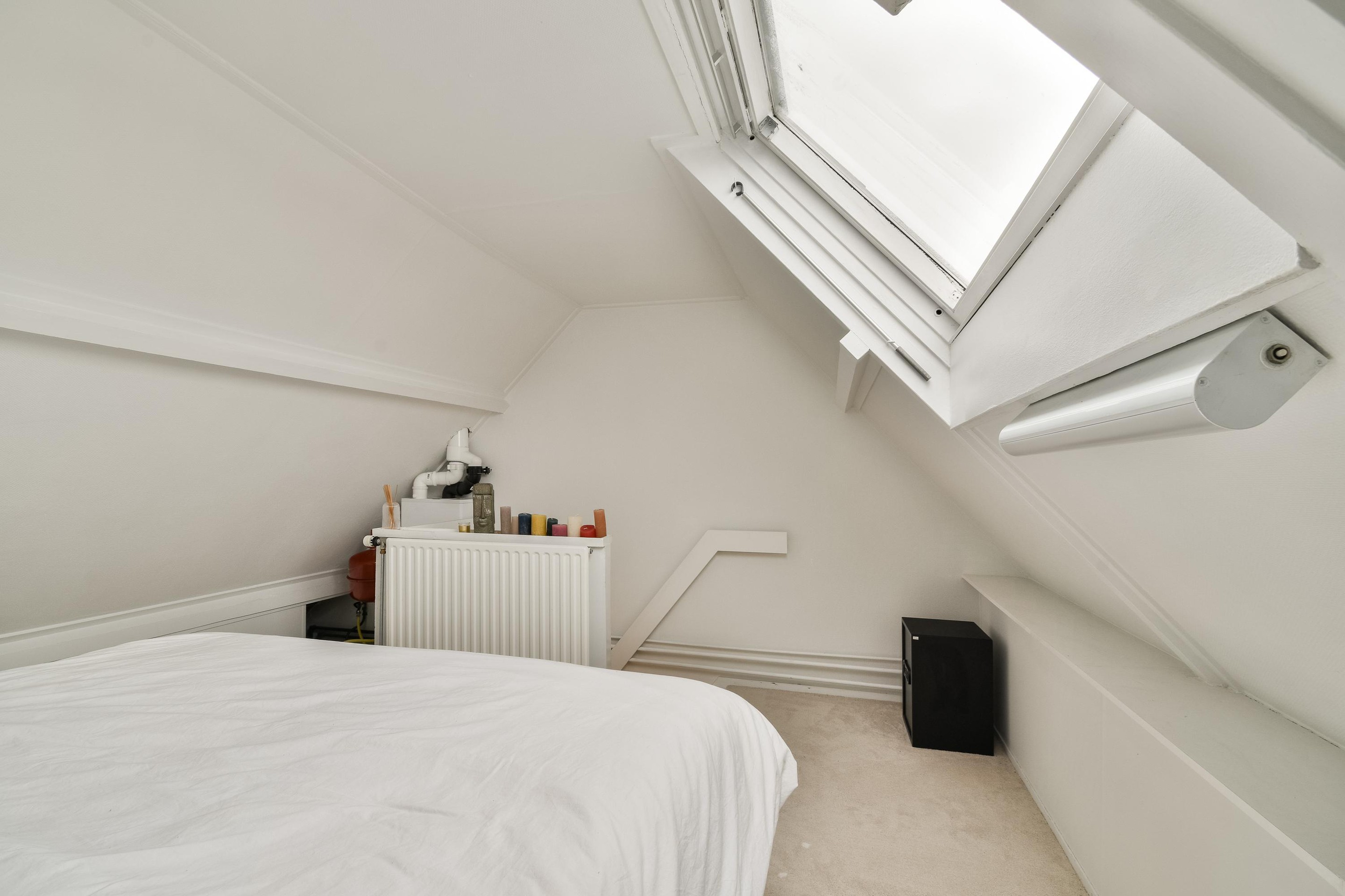 Tweede verdieping De vierde slaapkamer beslaat de volledige breedte van de woning en is uitgerust met airconditioning en een Velux-dakraam, waardoor de kamer licht en aangenaam blijft. Tevens bevindt zich hier de CV-ketel (Intergas, 2024).