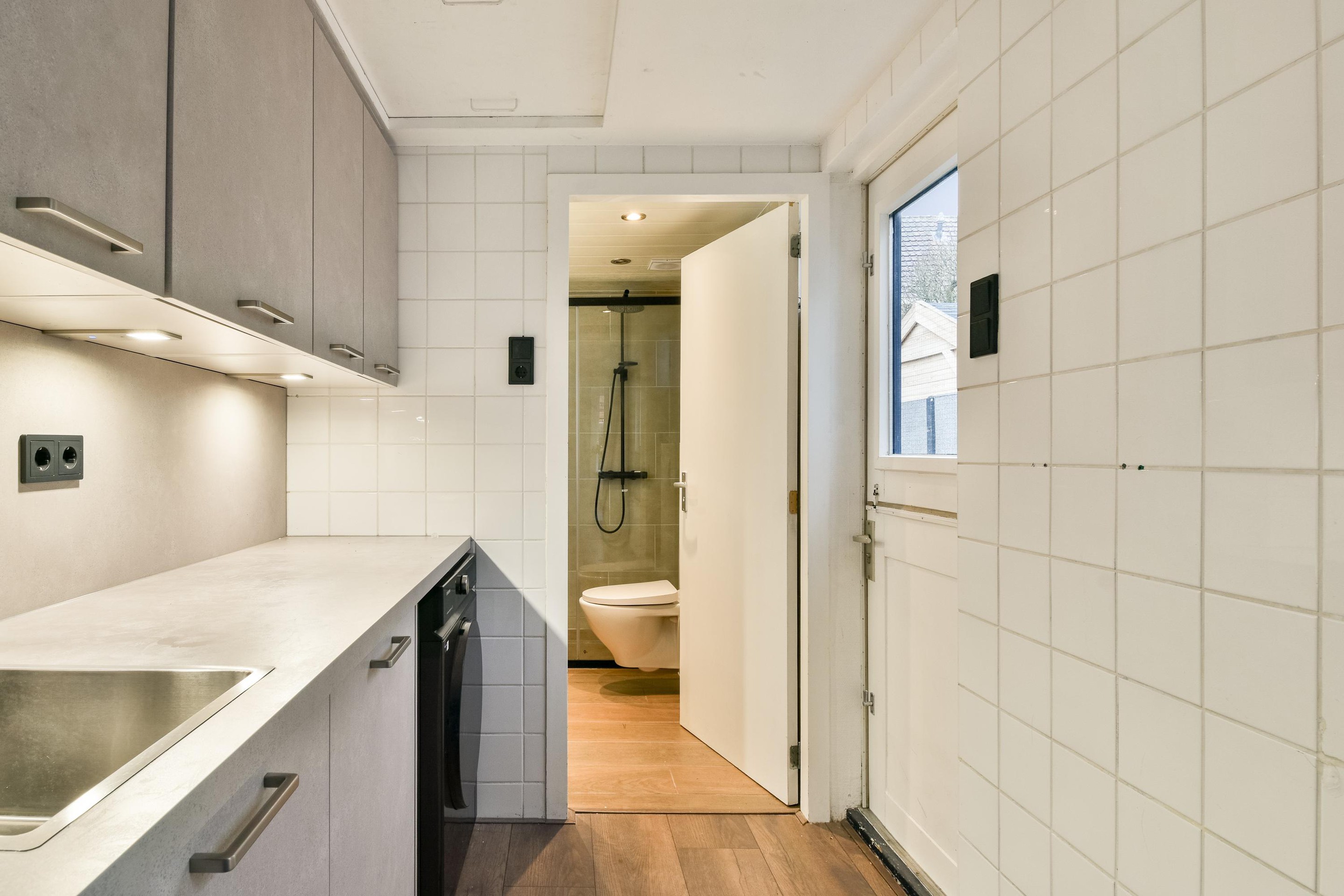 Begane grond De entree in de hal is voorzien van de garderobe en vaste kastruimte met diverse opbergmogelijkheden. De woonkamer oogt fris en modern, onder meer door het gebruik van heldere kleuren en de recent aangebrachte nieuwe laminaatvloer. Naast de meterkast en de afsluitbare trapopgang naar de etage vind je hier een eetgedeelte aan de straatzijde en een zitgedeelte aan de achterzijde, vanwaar de recent geplaatste keuken via een open doorgang te bereiken is. Deze keuken is in 2024 geplaatst in een parallelle opstelling, waarbij geen kosten noch moeite zijn gespaard. Het geheel oogt eigentijds en beschikt onder meer over een vaatwasser, een koelkast, een inductiekookplaat en een aansluiting voor de wasmachine. Vanuit de keuken is er toegang tot de bergzolder, de badkamer en de achtertuin. De badkamer is eveneens in 2024 vernieuwd en voorzien van onder meer een prachtig wastafelmeubel, een zwevend toilet en een inloopdouche. Daarnaast is de ruimte uitgerust met mechanische ventilatie.
