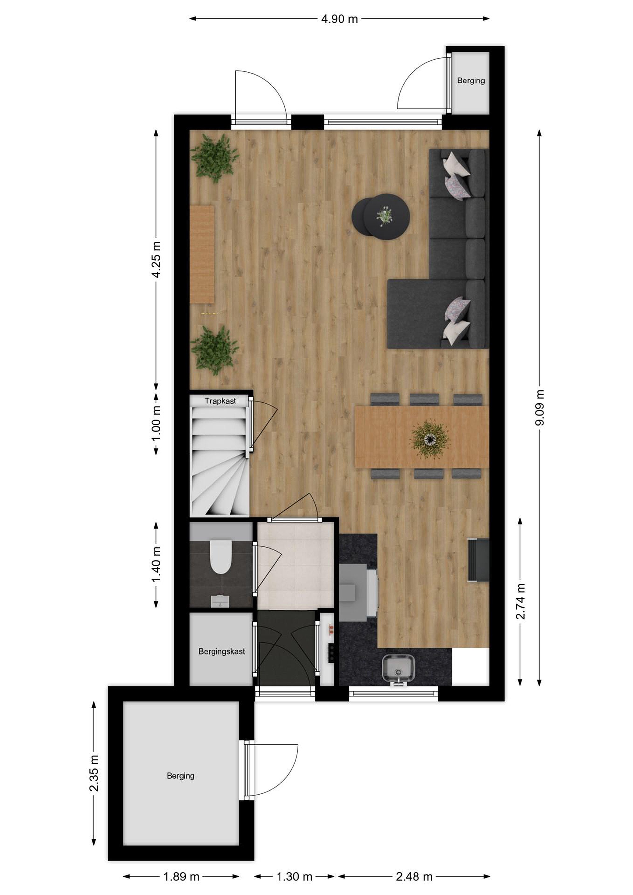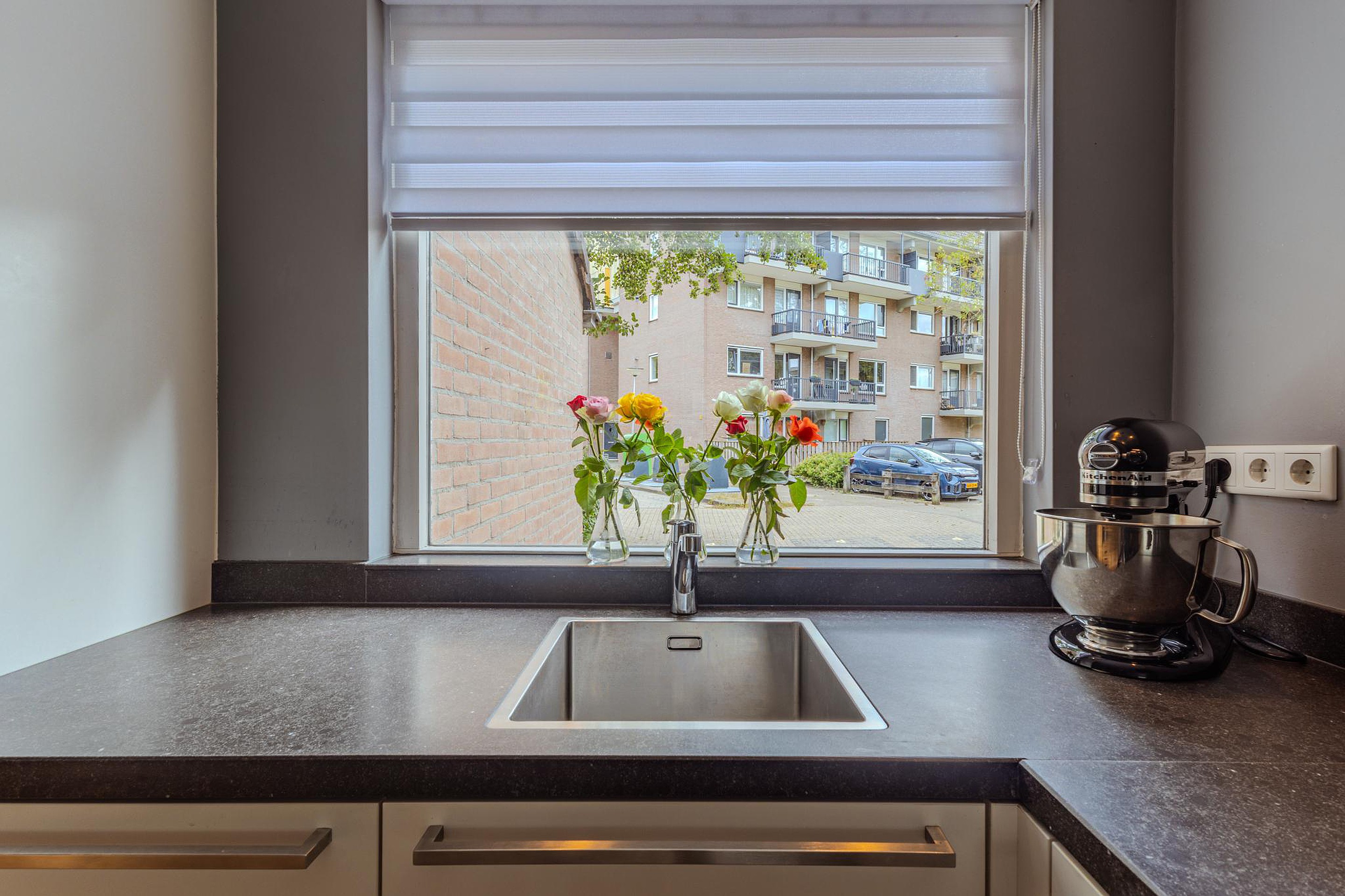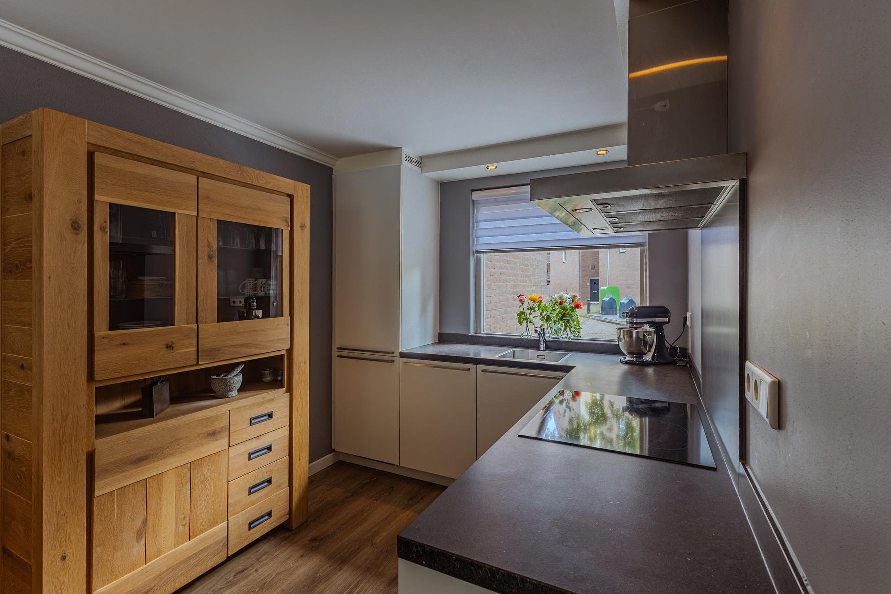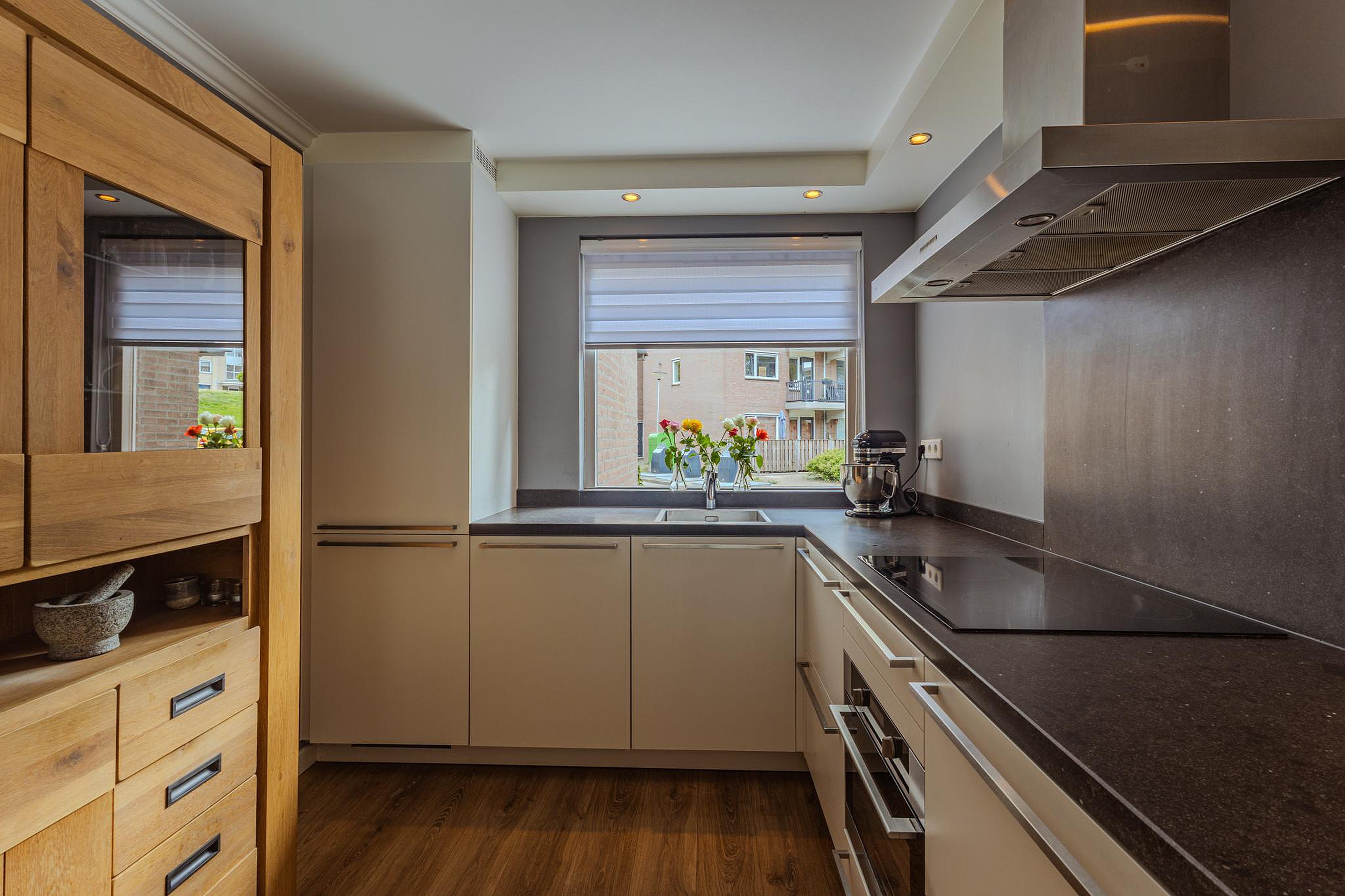 Begane grond Entree in de hal voorzien van een ruime bergkast, garderoberuimte, keurige en geheel betegelde toiletruimte voorzien van een zwevend toilet en een sanitairmeubel met fonteintje en meterkast. De sfeervolle woonkamer met airconditioning en een praktische vaste kast biedt de trapopgang naar de etage. Het zitgedeelte is aan de achterzijde gecentreerd, hier kijk je door de grote raampartij leuk weg naar de tuin met lounge-tuinhuis en de daarachter gelegen bomen van het park. Het eetgedeelte scheidt de ruimte met de keuken. Deze ruime en moderne keuken in L-opstelling bevindt zich aan de straatzijde en is uitgerust met een elektrische boiler en waterontharder. Hier vind je naast de lades en kasten diverse inbouwapparatuur als een inductiekookplaat met afzuigkap, een combi-oven, een koel-/vriescombinatie en een vaatwasmachine.