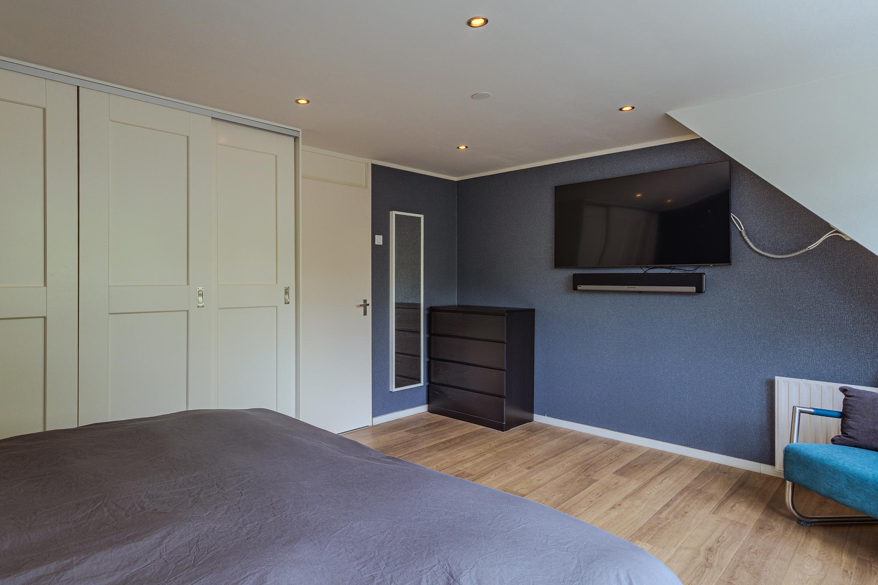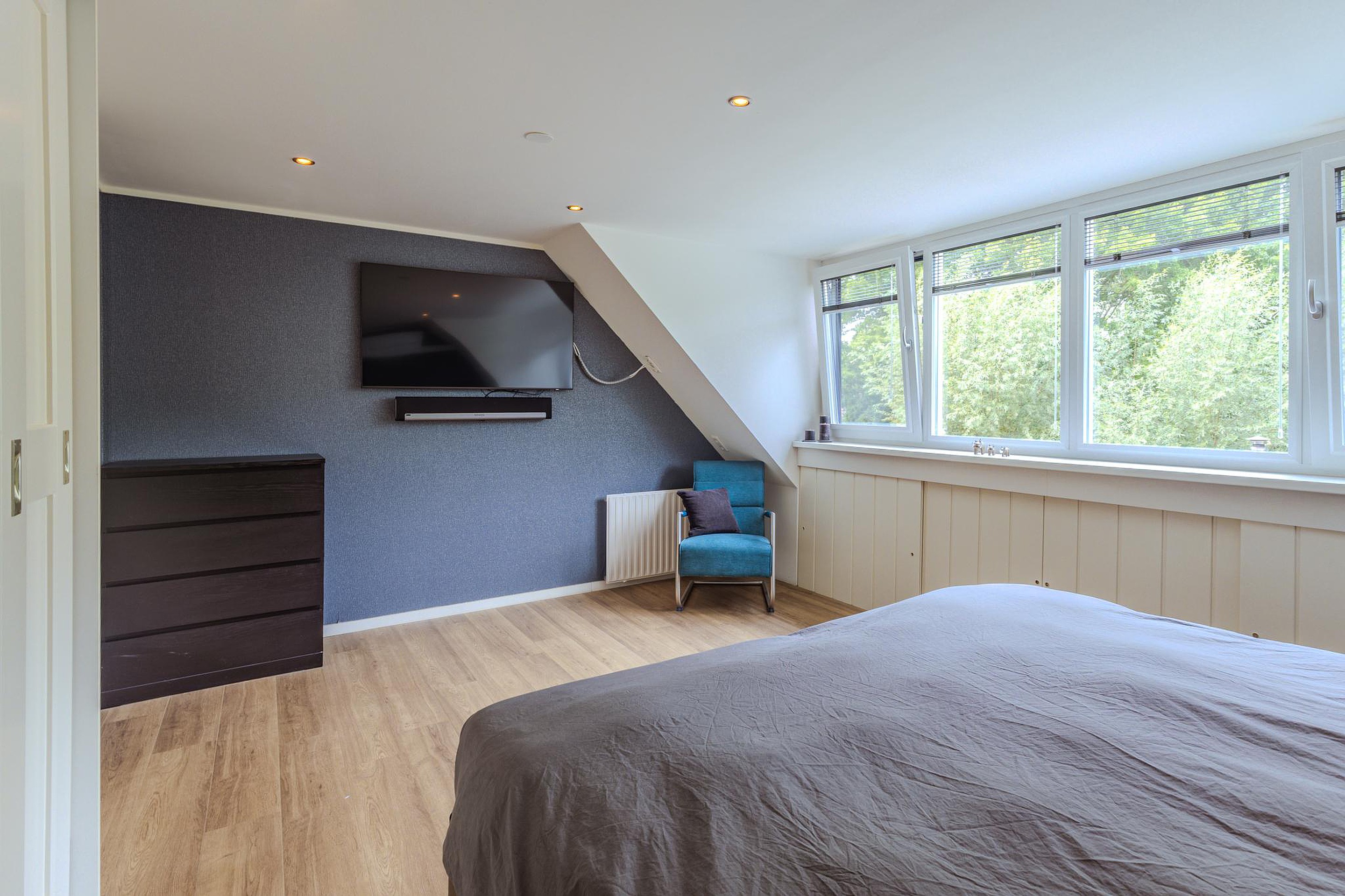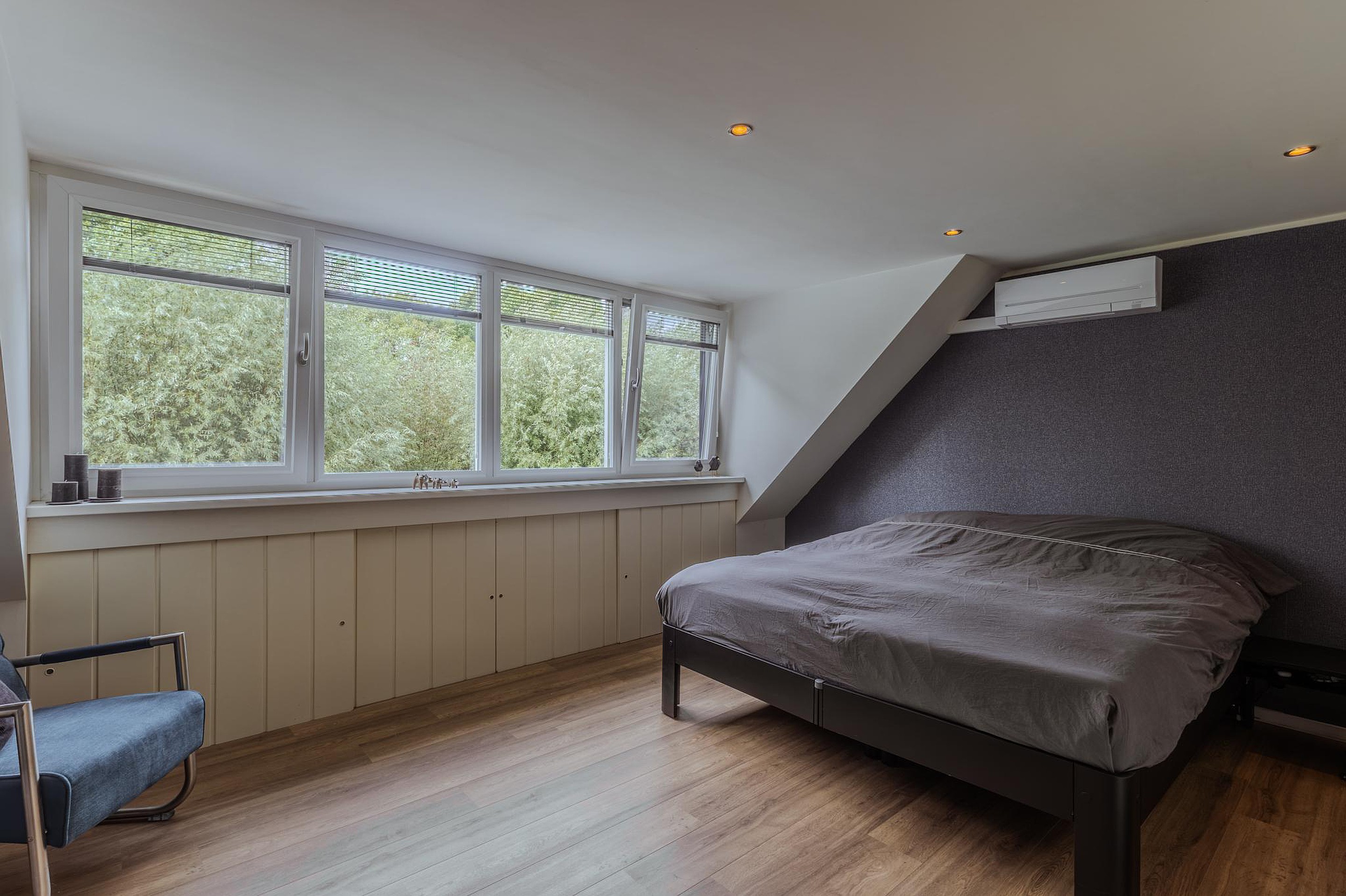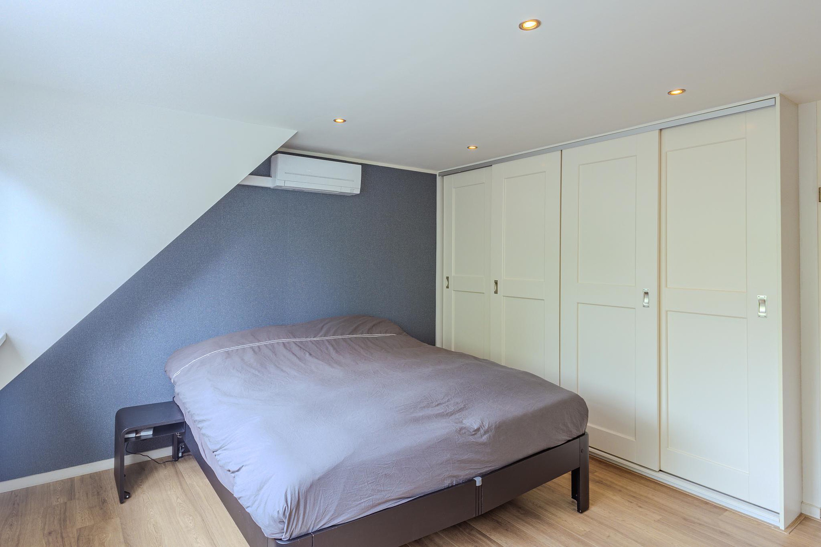 Eerste verdieping De trapopgang naar de overloop is afgesloten door een glazen deur. Van hieruit toegang tot twee slaapkamers en de badkamer. De riante ouderslaapkamer is in 2022 verder verruimd door de plaatsing van een ca. 3,70 meter brede dakkapel. In deze slaapkamer vind je verder airconditioning, bergingsmogelijkheden achter de knieschotten en een 4-deurs inbouwkast. De tweede ruime slaapkamer is aan de straatzijde gesitueerd en beschikt eveneens over airconditioning. De moderne badkamer is onder meer uitgerust met een ligbad met douchemogelijkheid, een douchecabine, een tweede inbouwtoilet, een designradiator en een wastafelmeubel met spiegelkast.