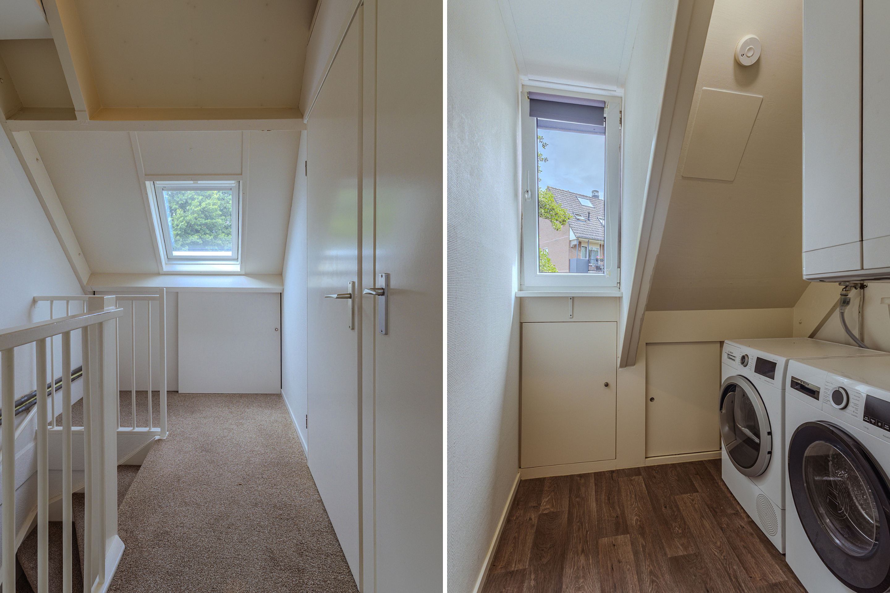Tweede verdieping De overloop beschikt over een dakraam en berging achter de knieschotten, van hieruit toegang tot 2 slaapkamers en de wasruimte / technische ruimte. Deze ruimte met dakkapel herbergt de witgoedaansluitingen, de CV-installatie (2023), de zonnepanelenomvormer (2022) en biedt bergingsmogelijkheden achter de knieschotten. Deze 3de slaapkamer is gelegen aan de straatzijde en is uitgerust met een dakkapel en biedt bergruimte achter de schotten. De laatste slaapkamer is aan de tuinzijde gesitueerd, heeft een groot Velux dakraam en biedt eveneens diverse vaste bergmogelijkheden. Boven beide slaapkamers is een vliering gecreëerd welke vanaf de overloop bereikbaar is.