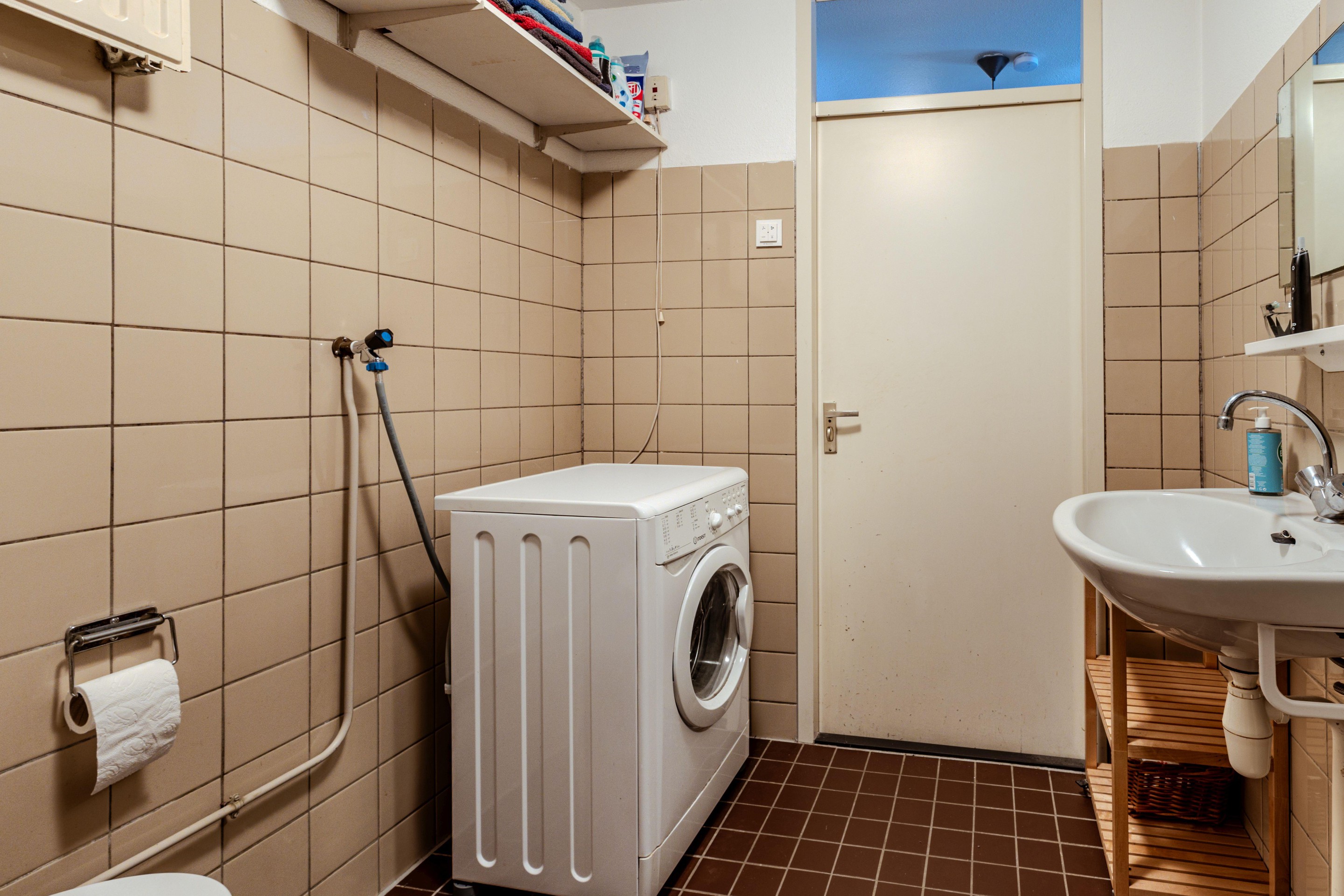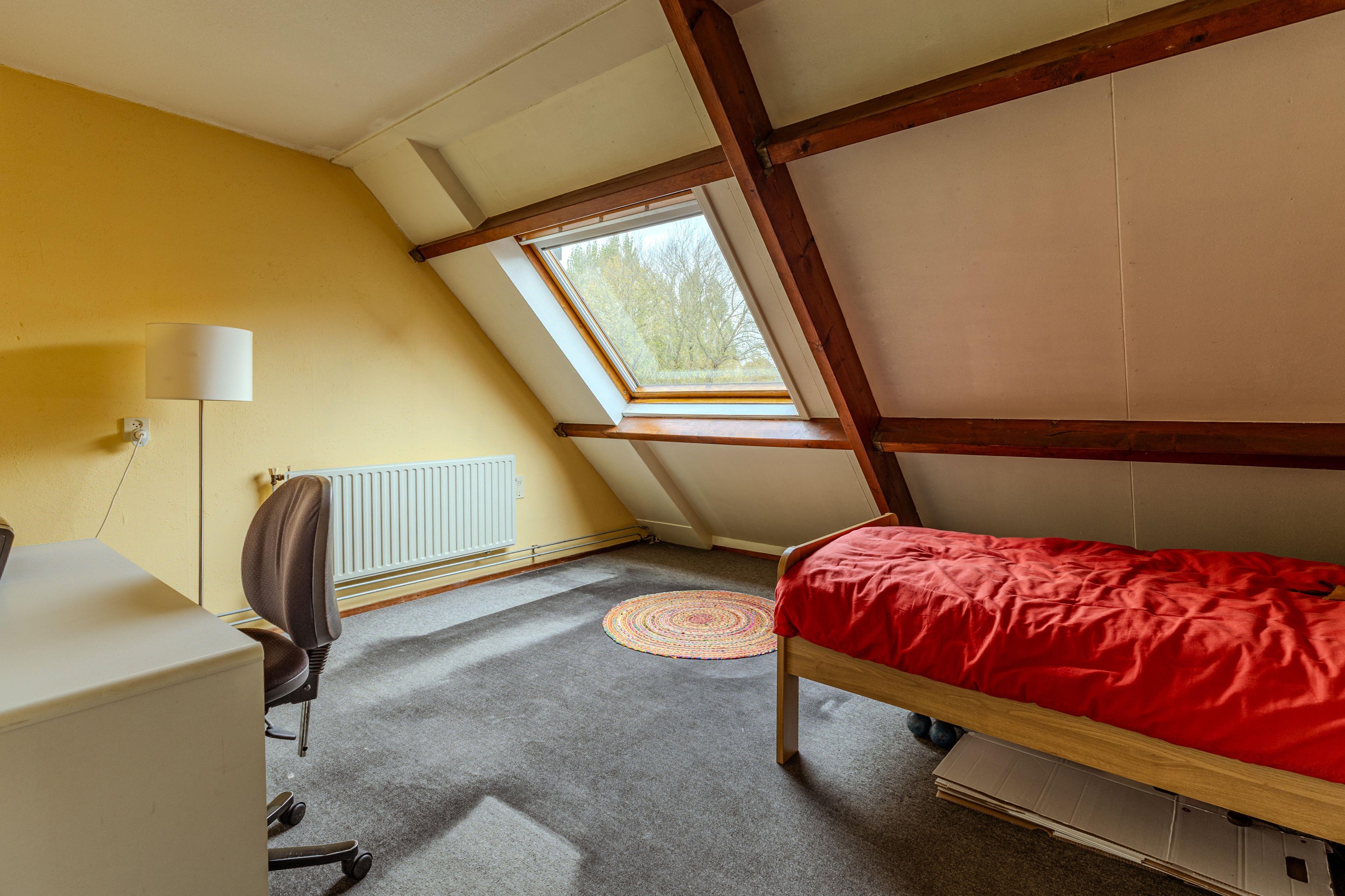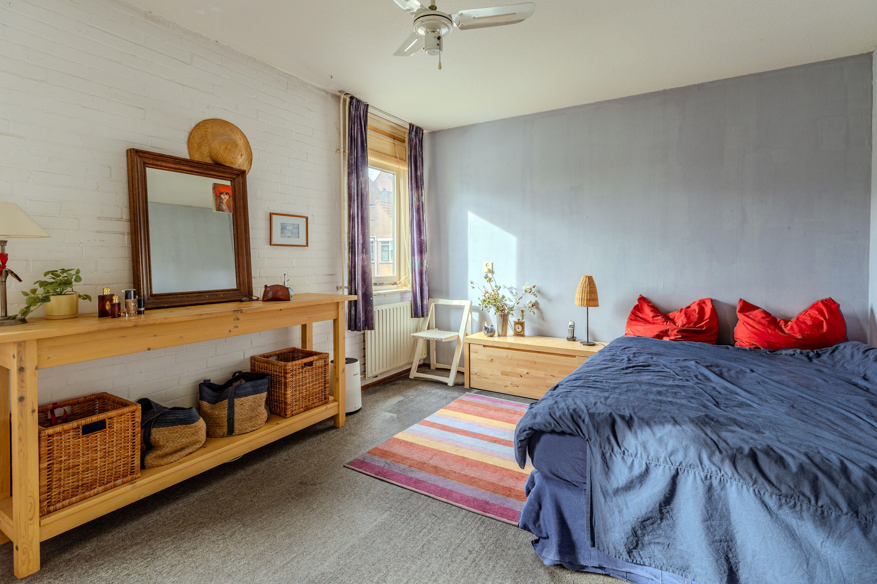 De overloop biedt toegang tot twee ruime slaapkamers, de badkamer en de trapopgang. De 1ste slaapkamer is aan de achterzijde gelegen en voorzien van een Velux-dakraam. De 2de slaapkamer is te vinden aan de voorzijde van de woning en beschikt naast een plafondventilator ook over met de hand bedienbare rolluiken. De riante badkamer bevindt zich tussen beide slaapkamers en beschikt nog over het originele jaren ’80-tegelwerk. Naast een tweede toilet vind je hier een douchegelegenheid, een wastafel en de aansluiting voor de wasmachine. Ook is de ruimte voorzien van mechanische ventilatie.