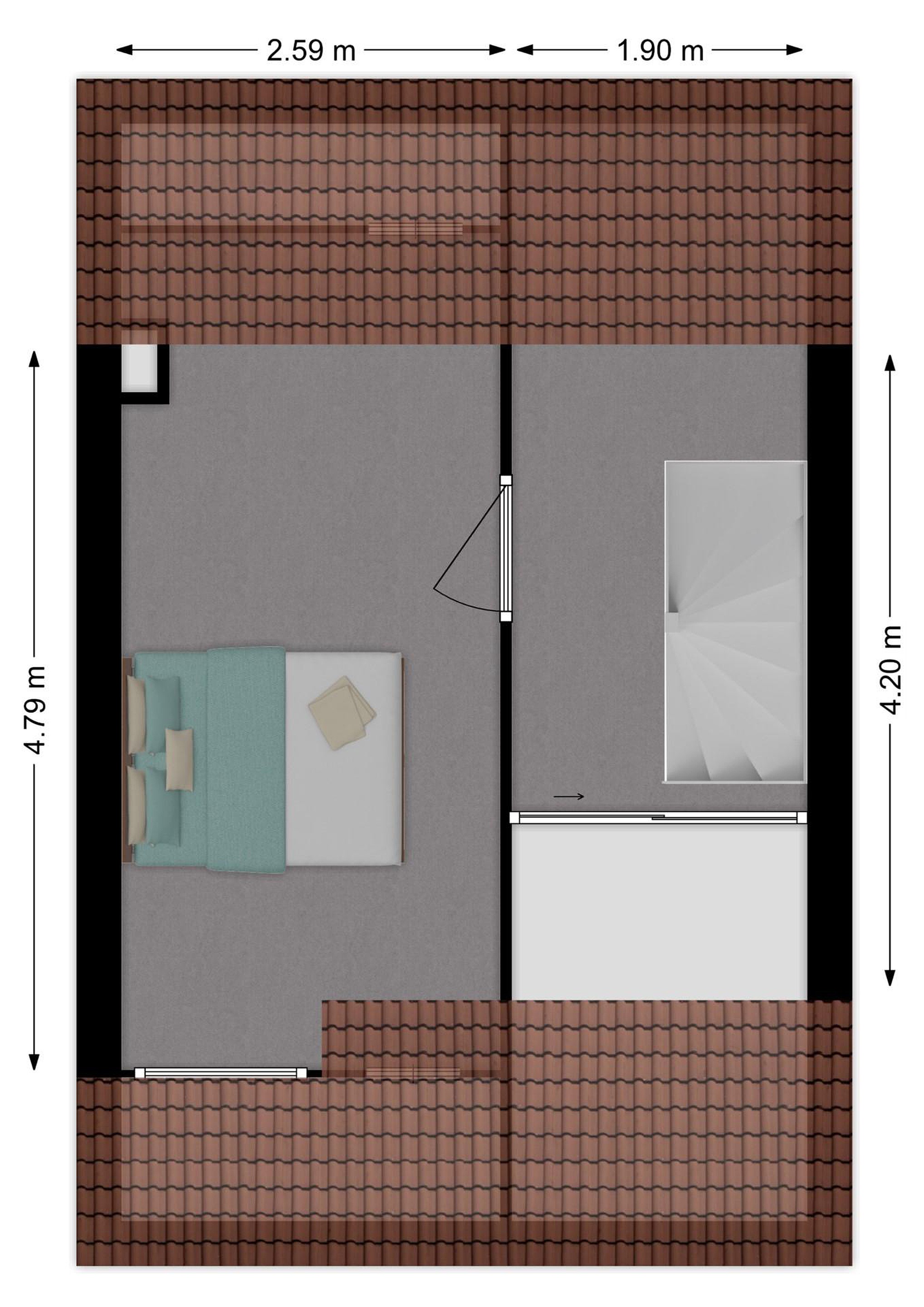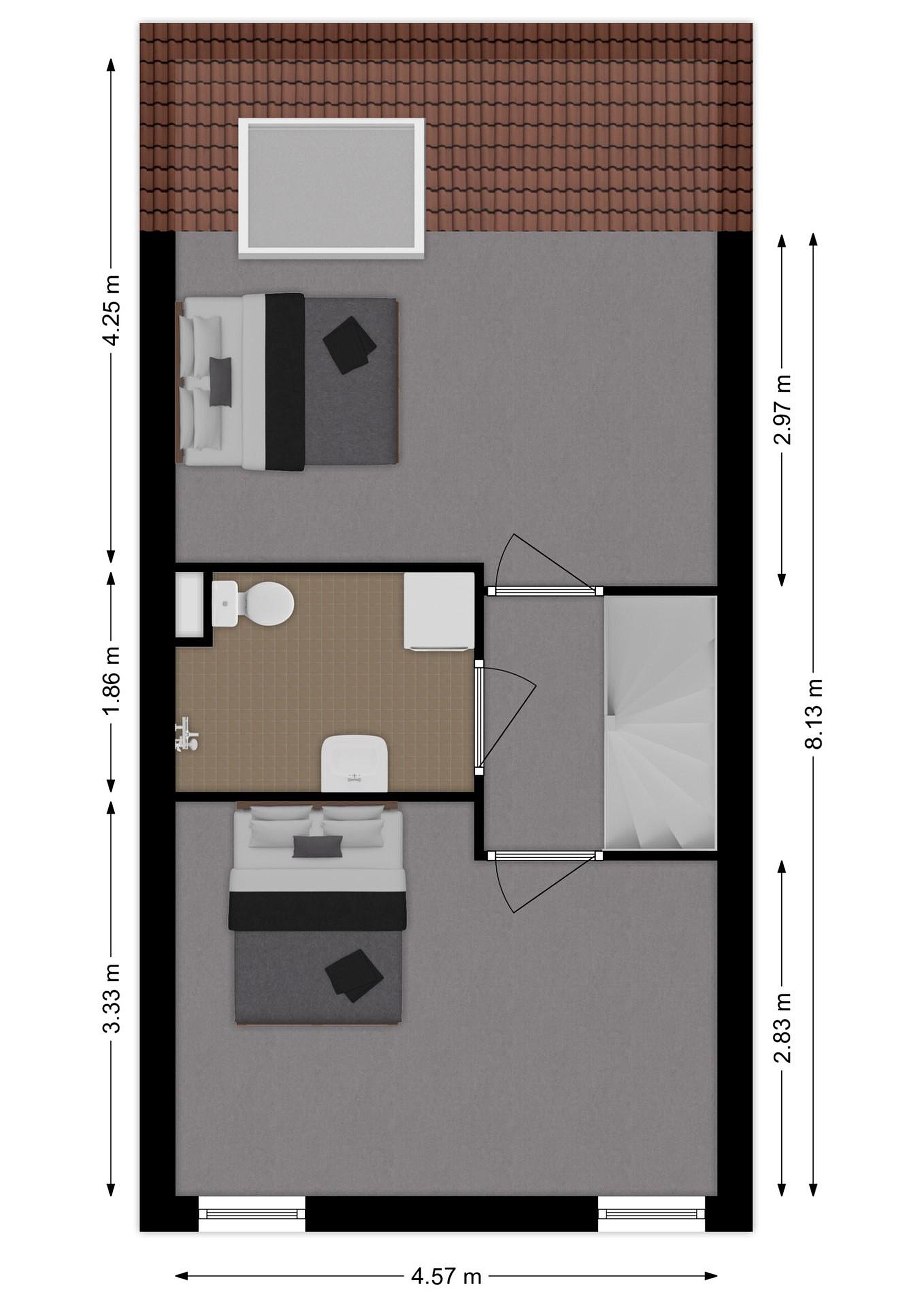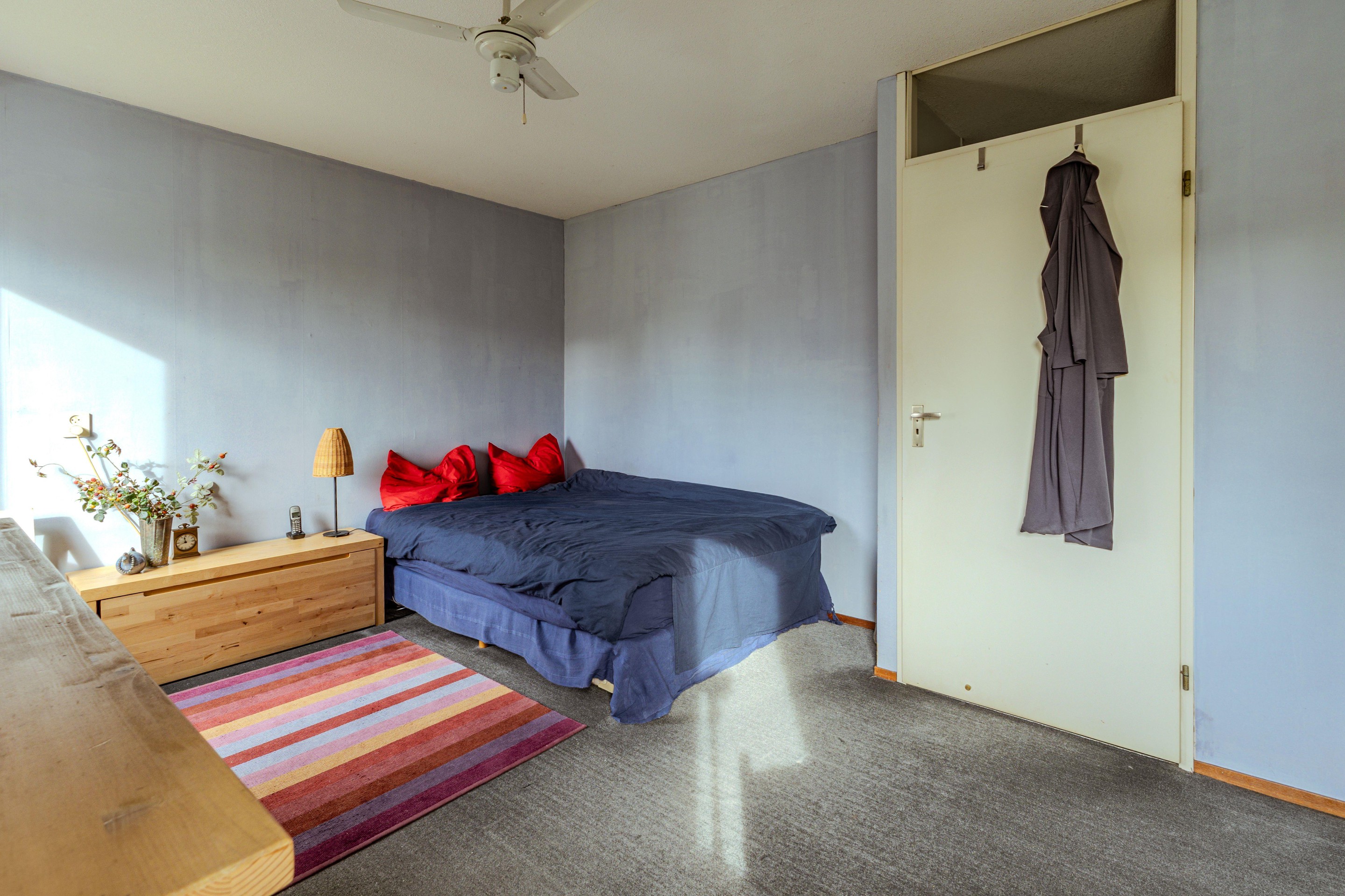 De overloop biedt toegang tot twee ruime slaapkamers, de badkamer en de trapopgang. De 1ste slaapkamer is aan de achterzijde gelegen en voorzien van een Velux-dakraam. De 2de slaapkamer is te vinden aan de voorzijde van de woning en beschikt naast een plafondventilator ook over met de hand bedienbare rolluiken. De riante badkamer bevindt zich tussen beide slaapkamers en beschikt nog over het originele jaren ’80-tegelwerk. Naast een tweede toilet vind je hier een douchegelegenheid, een wastafel en de aansluiting voor de wasmachine. Ook is de ruimte voorzien van mechanische ventilatie.