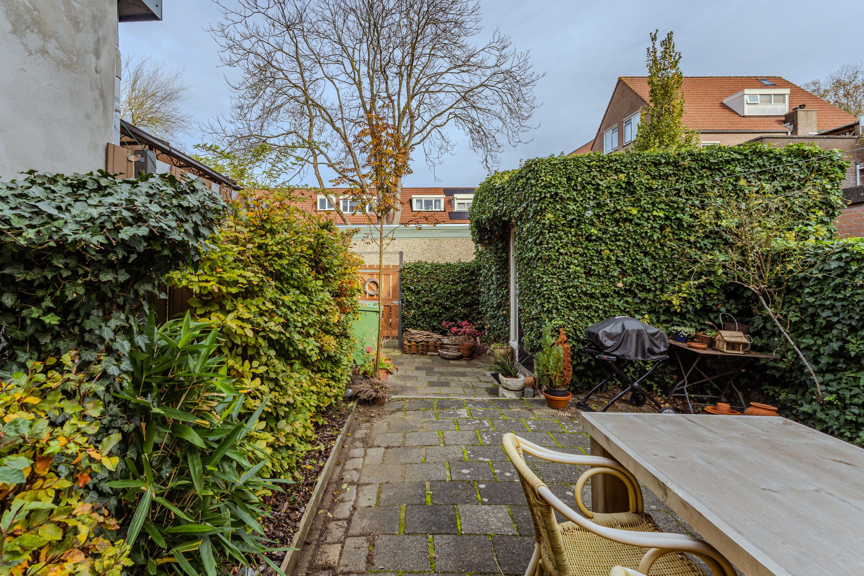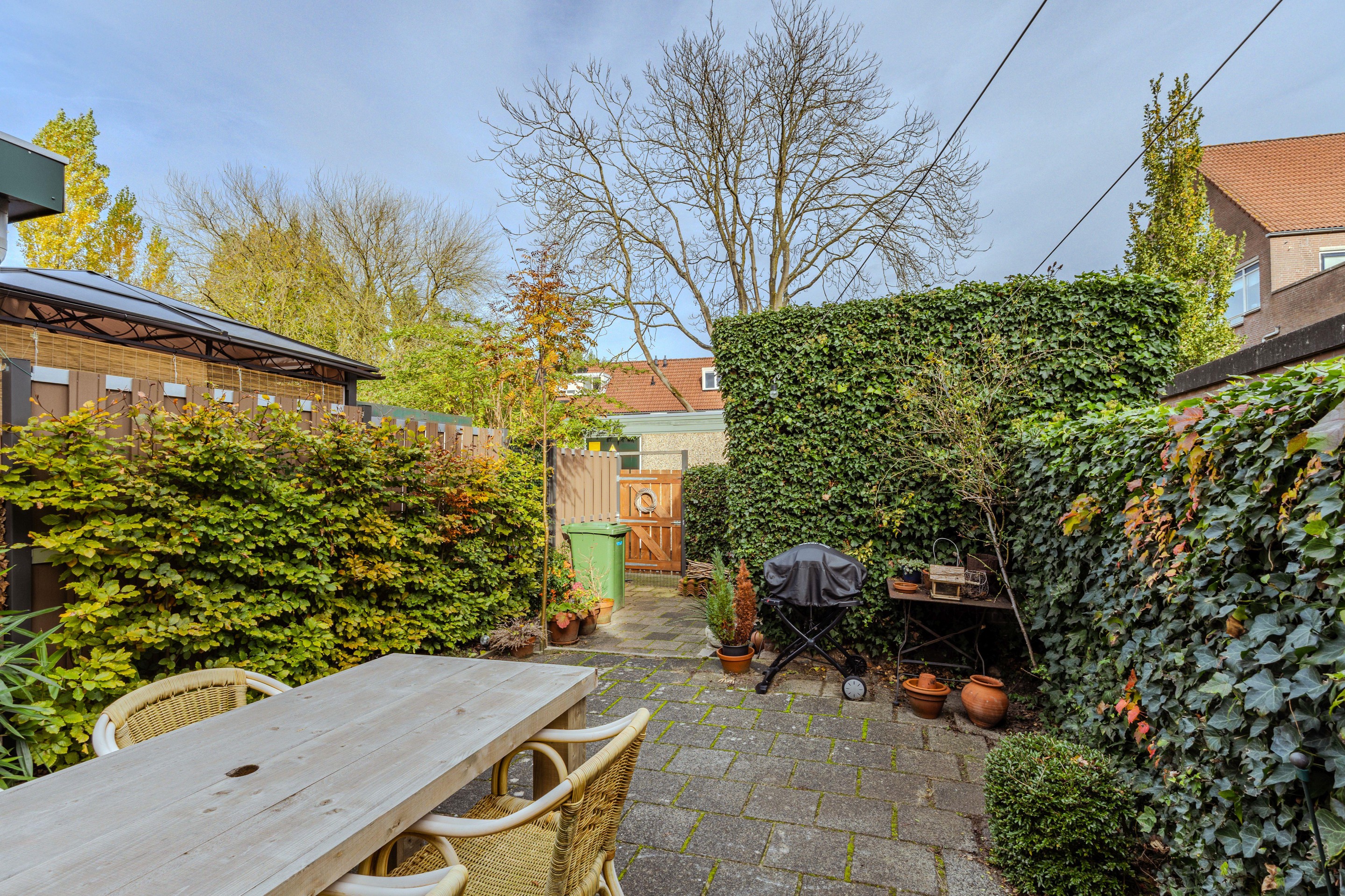 De achtertuin beschikt over een achterom en een stenen berging . Aan beide zijden zorgen groene hagen naast een prettige, natuurlijke uitstraling ook voor de gewenste privacy. Nabij de woning is een fijn zitgedeelte gecreëerd, terwijl aan de achterzijde ruimte is gereserveerd voor de containers. De overige delen van de tuin zijn netjes betegeld.