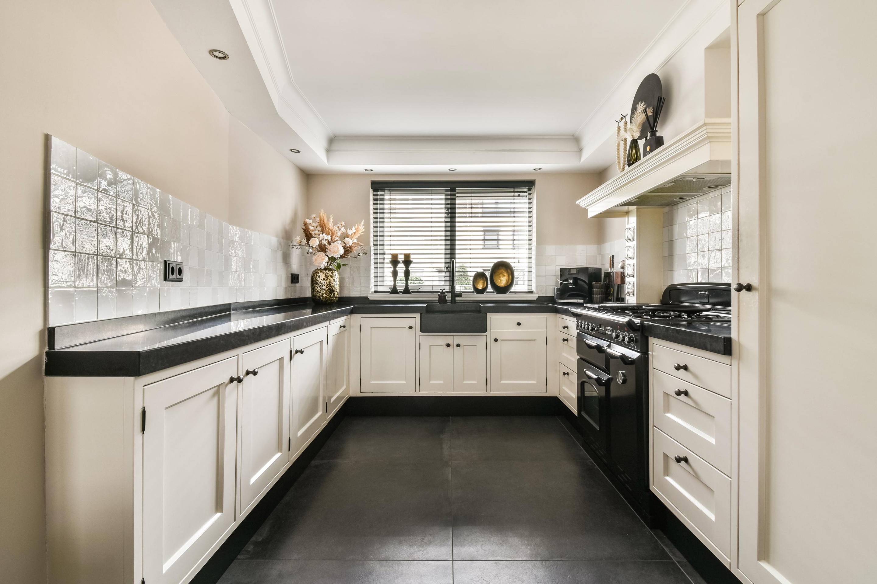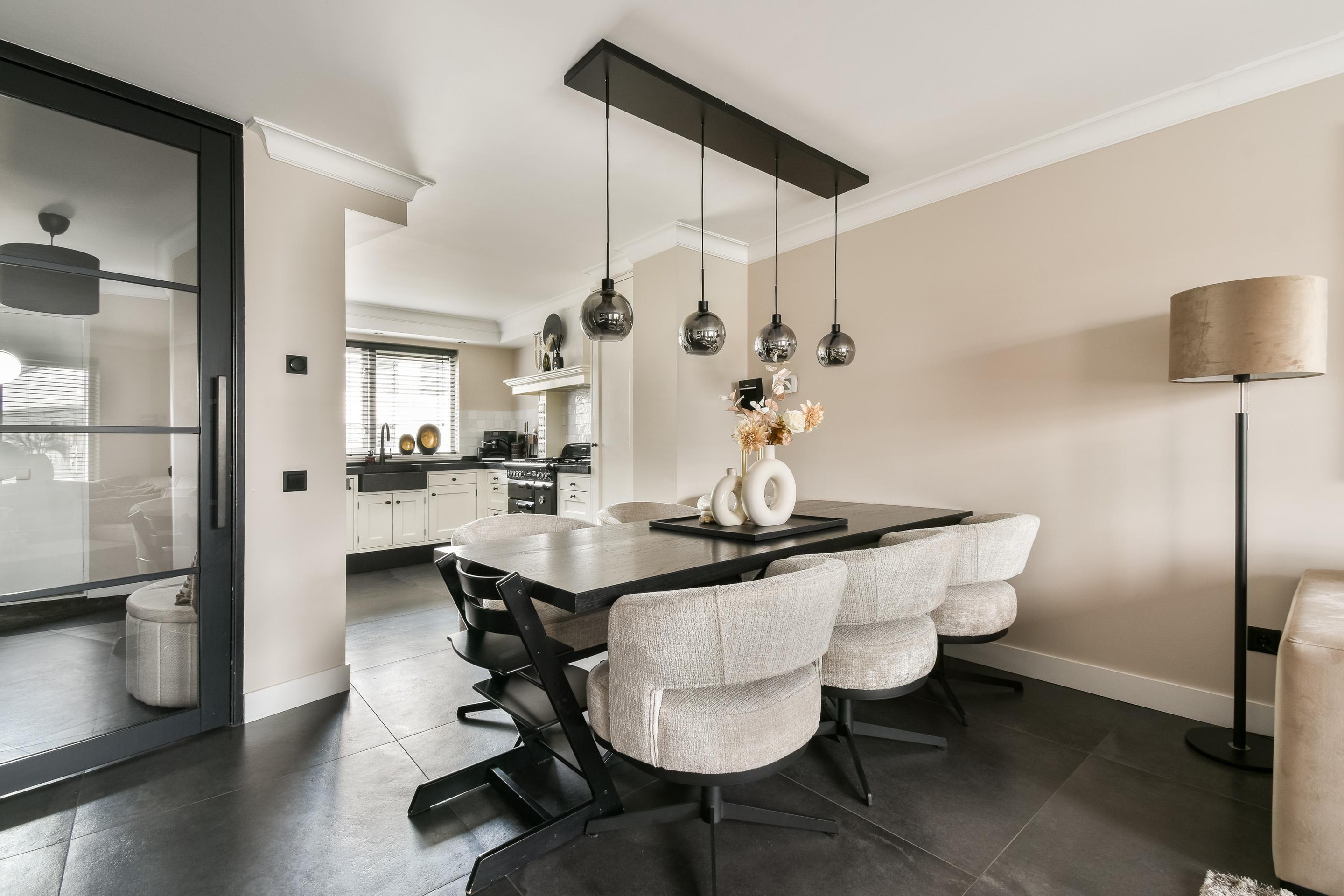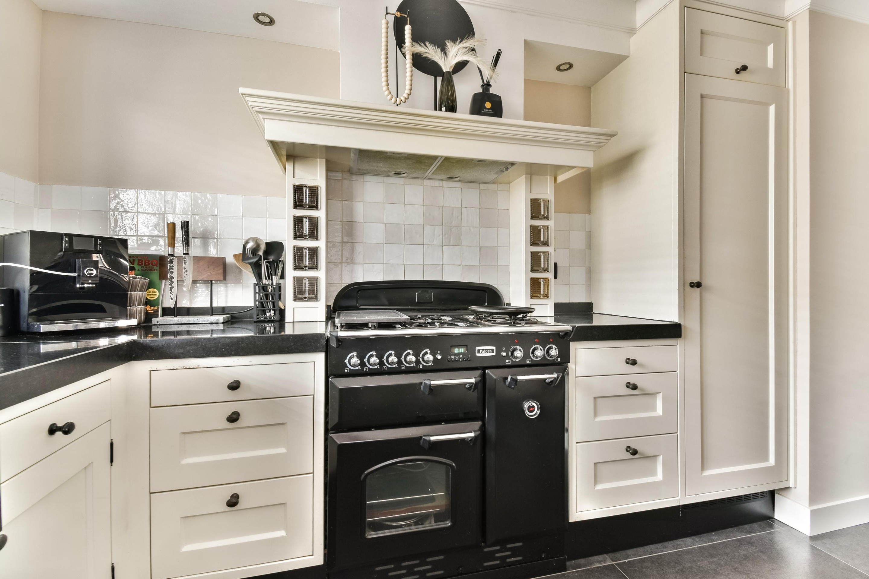 Keurige entree in de hal met meterkast, garderoberuimte, nette toiletruimte voorzien van zwevend toilet en fonteintje en de trapopgang. De moderne woonkamer in een frisse kleurstelling is strak afgewerkt en uitgerust met sfeervolle Philips Hue-verlichting. De ruimte is onderverdeeld in een eetgedeelte gelegen nabij de keuken en een zitgedeelte van waaruit de serre in de achtertuin te bereiken is. De woonkamer biedt een praktische bergkast en aangename vloerverwarming. De royale, handgemaakte open keuken in U-opstelling verkeert in prima staat en is voorzien van een Falcon 5-pits gasfornuis (incl. wokbrander) en ovens. In 2025 is er een Quooker geplaatst en recent is de vaatwasmachine vervangen. Verder vind je hier een inbouwkoelkast, een schouw met geïntegreerde afzuiging en vele bergkasten en -laden. Perfect voor al het keukengerei en proviand.